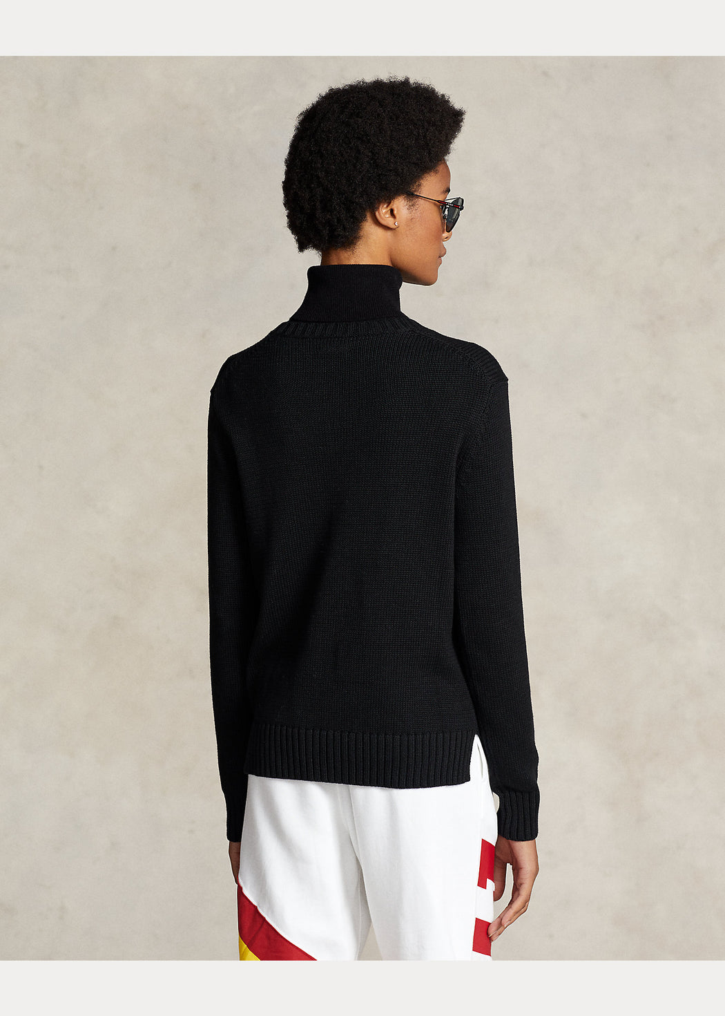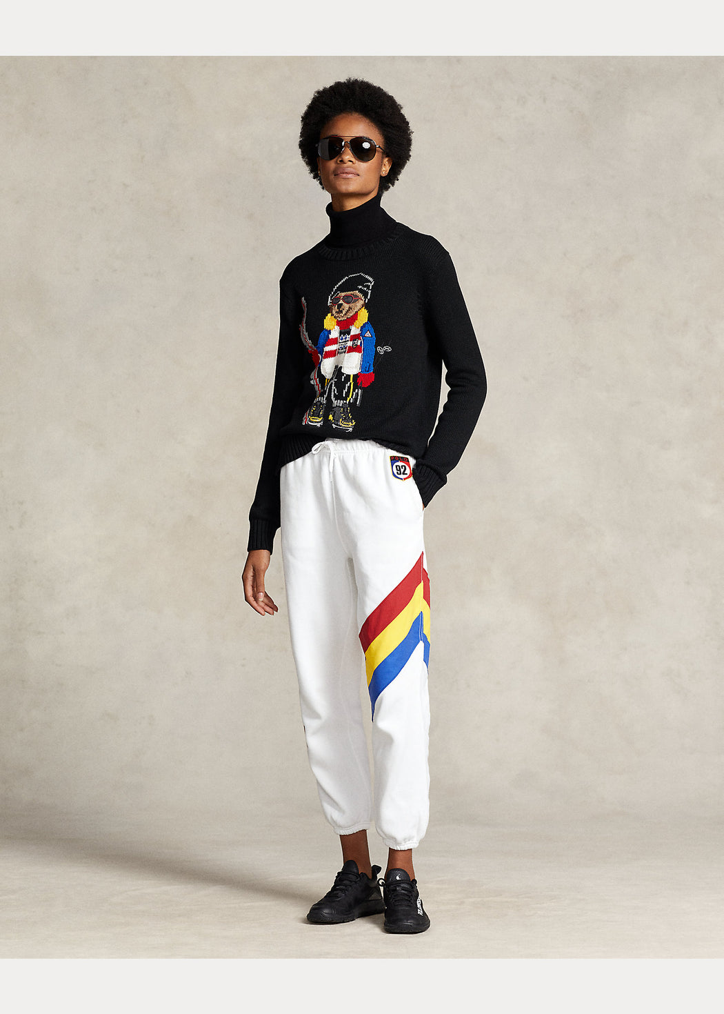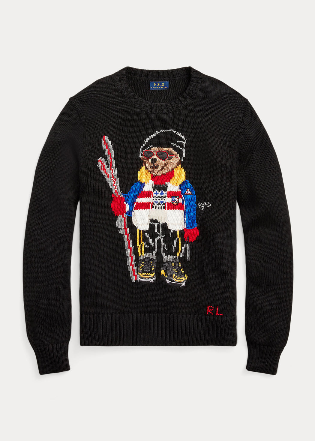 Ce pull doux à col rond arbore une version en tricot intarsia, brodée et patchwork de notre Polo Bear emblématique, prêt à dévaler les pistes de ski vêtu d'une veste en color-block, d'un pull à motif géométrique et de lunettes de soleil.