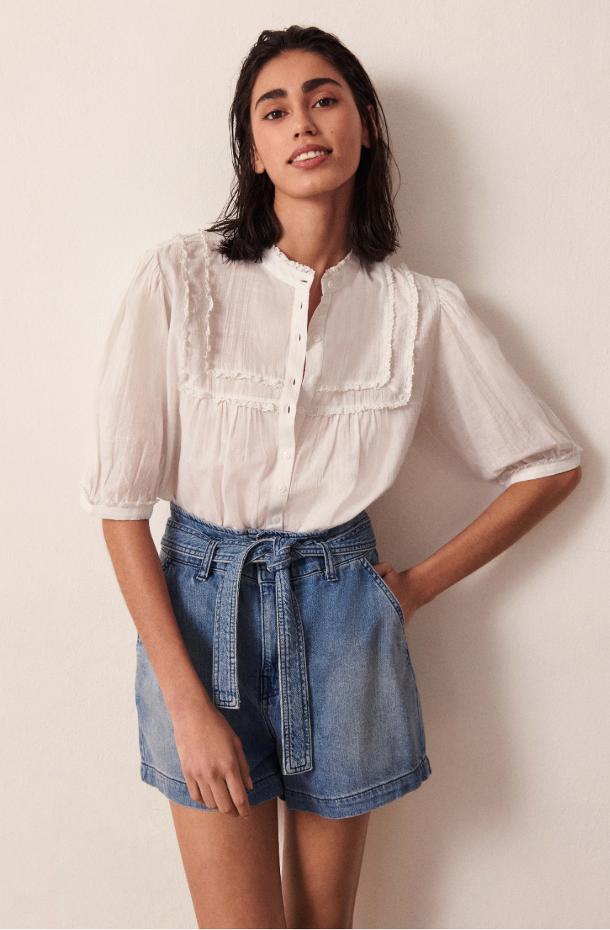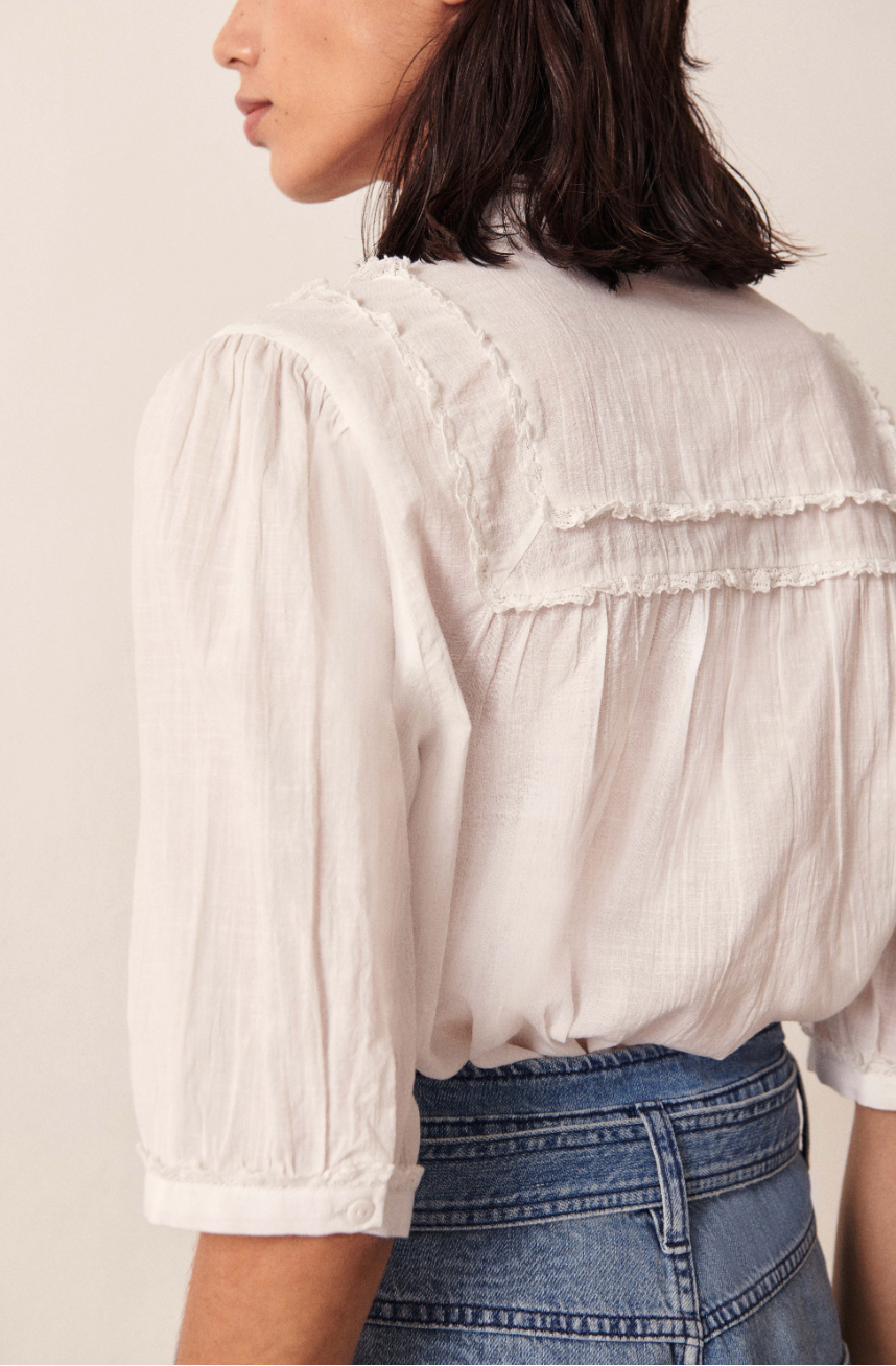 La blouse HIA ba&sh apporte une note joliment rétro à votre look. Cette blouse dispose de manches courtes, longueur au coude, et d'un col rond volanté orné d'un galon de dentelle. Elle est boutonnée devant et offre un volume ample et confortable. La blouse est confectionnée en pur coton. A noter : les fronces en haut et bas de manches et l'empiècement carré devant et dos rehaussé d'un galon de dentelle comme au col. Une blouse d'inspiration victorienne à décaler avec un jean tendance, pour un look pointu.