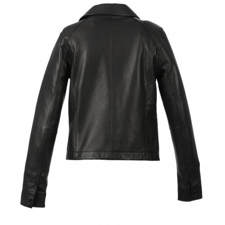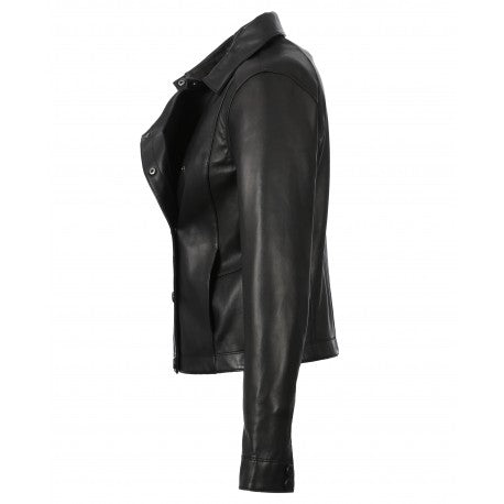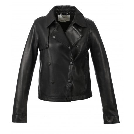 Voici une pièce dont l’originalité n’est pas à prouver ! Quelle allure vous aurez avec cette veste à double boutonnage en cuir véritable de mouton dont la souplesse et le toucher doux sont incomparables ! Inspiré du trench avec son bas volet reconnaissable, sa coupe droite fait de lui une pièce unique et tendance. Sa fermeture asymétrique à pression habille cette pièce épurée de tout accessoire et ses poches verticales invisibles parachèvent ce style. Pour plus de confort, des fentes d’aisances à double pressions en bas de manches ont été ajoutées et sa doublure en coton contrecollée vous offre une légèreté optimale. Pas d’hésitation possible avec ce modèle !