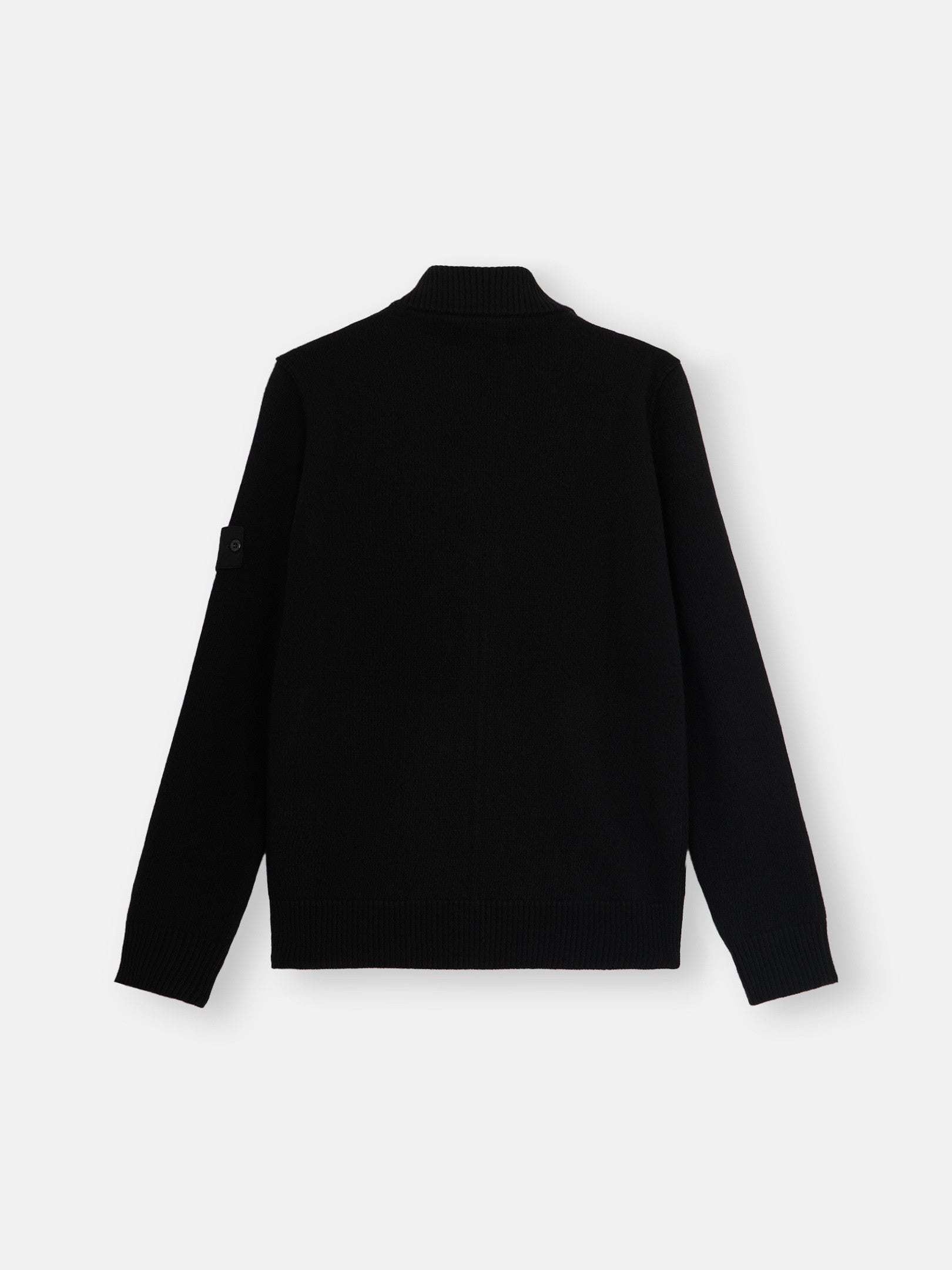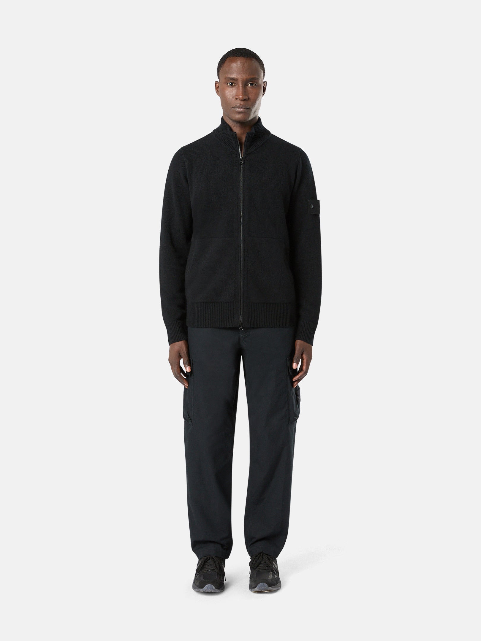 Cardigan au point jersey réalisé en laine Geelong certifiée RWS doté de poches, de détails côtelés et d’une fermeture zippée à double curseur. Jauge 7.