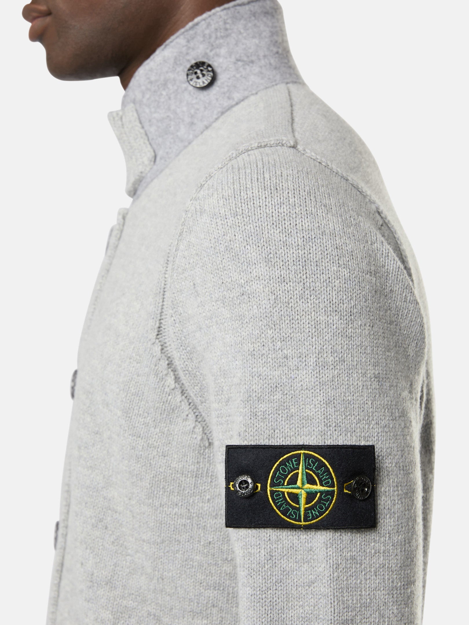Col montant en feutre côtelé à l’intérieur avec mentonnière en maille côtelée boutonnée. Bande avec détail au point jersey au niveau des épaules et sur le devant des emmanchures. Coutures en relief au niveau des emmanchures. Badge Stone Island sur la manche gauche. Poignets et ourlet côtelés. Fermeture zippée à double curseur dissimulée sous une patte de boutonnage. Coupe regular.