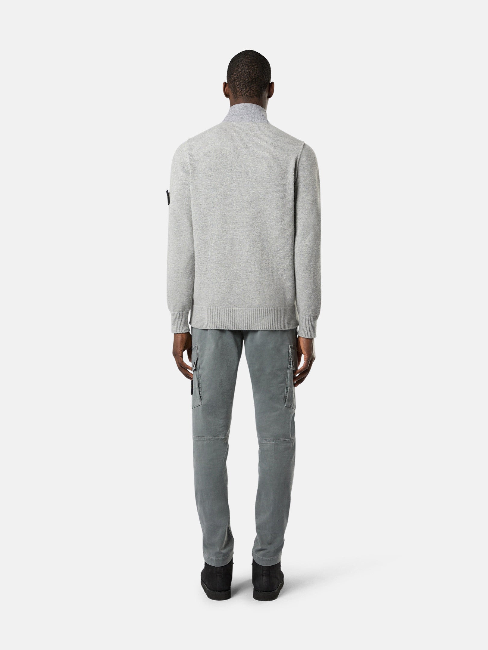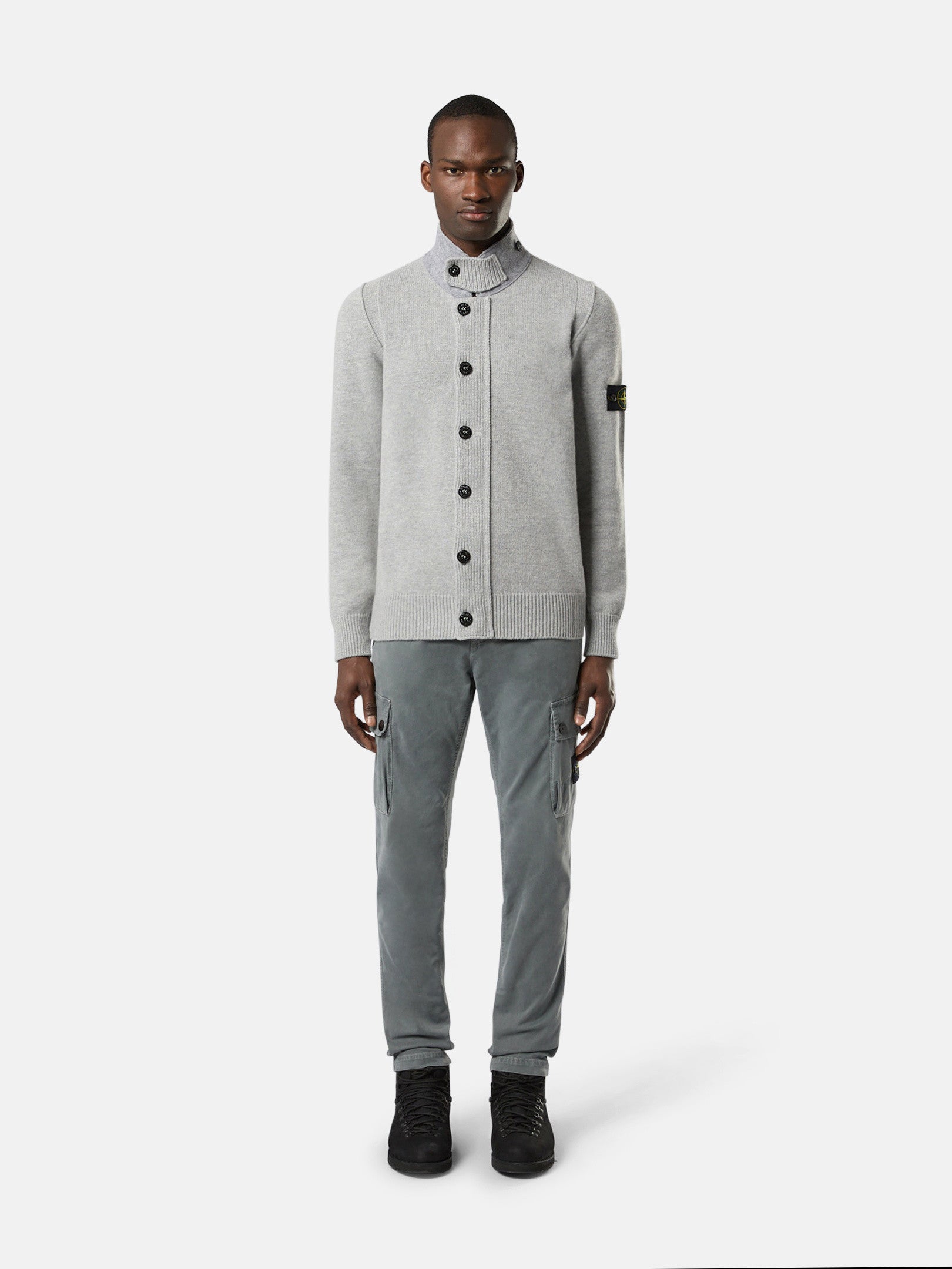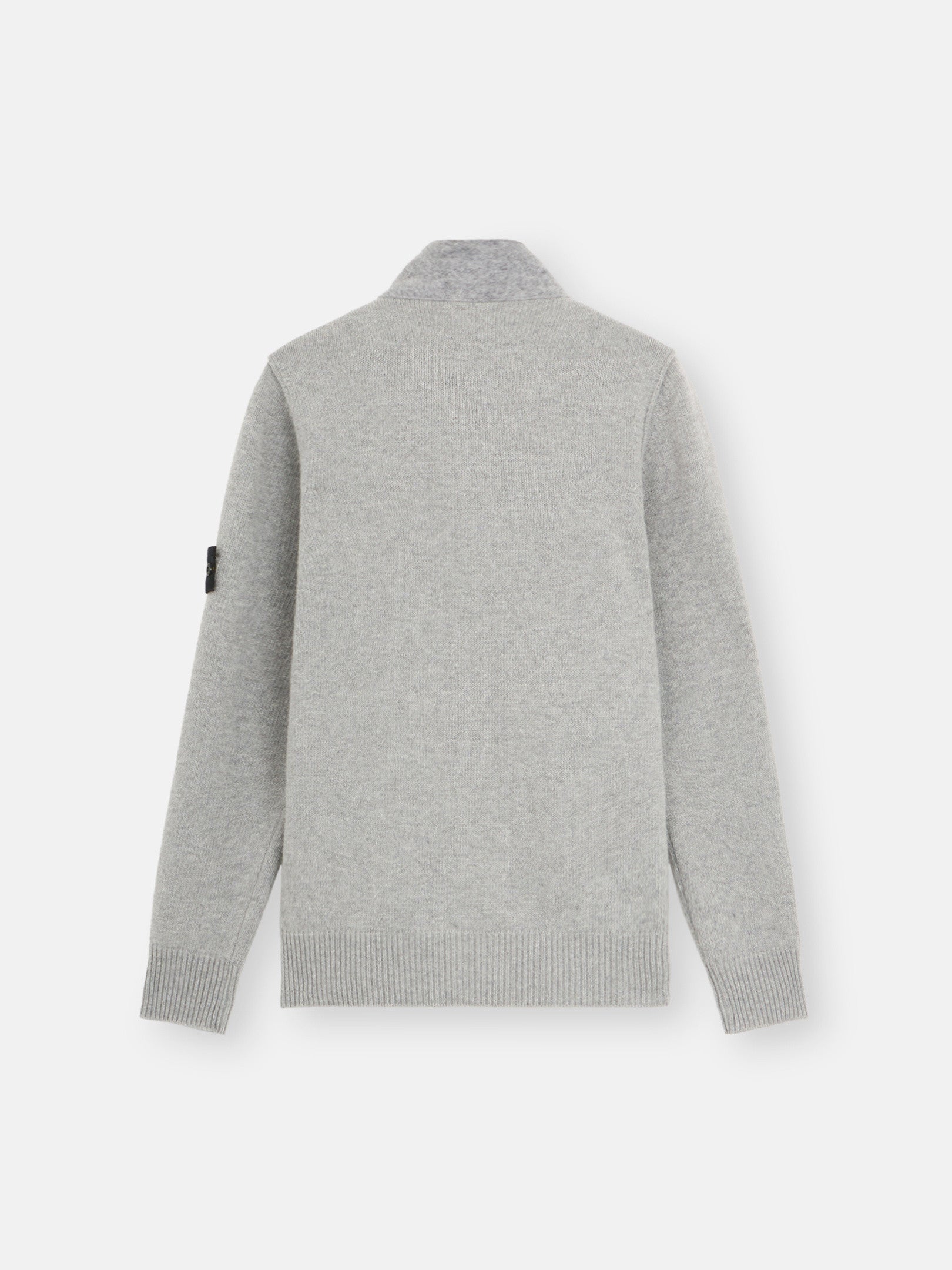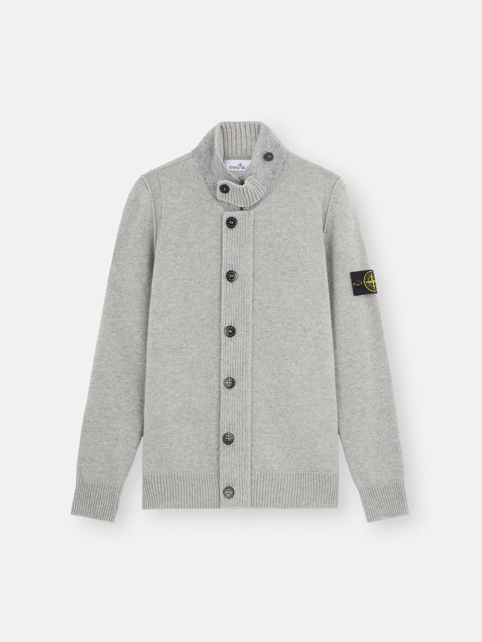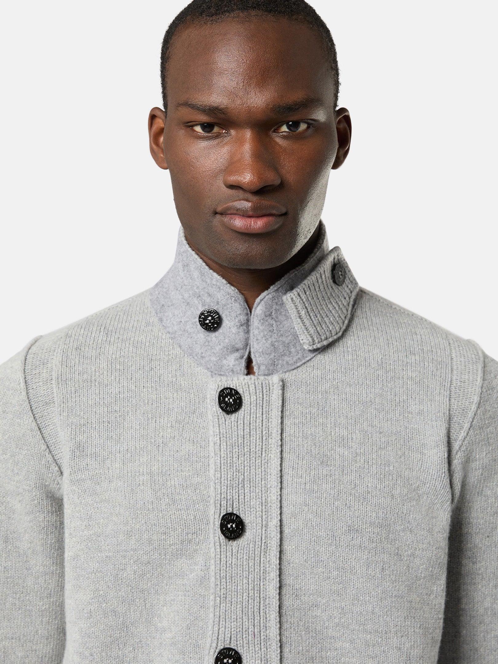 Cardigan en maille de laine d'agneau doté d’un col montant en feutre avec mentonnière boutonnée côtelée et d’une fermeture zippée à double curseur sous une patte de boutonnage. Jauge 5.