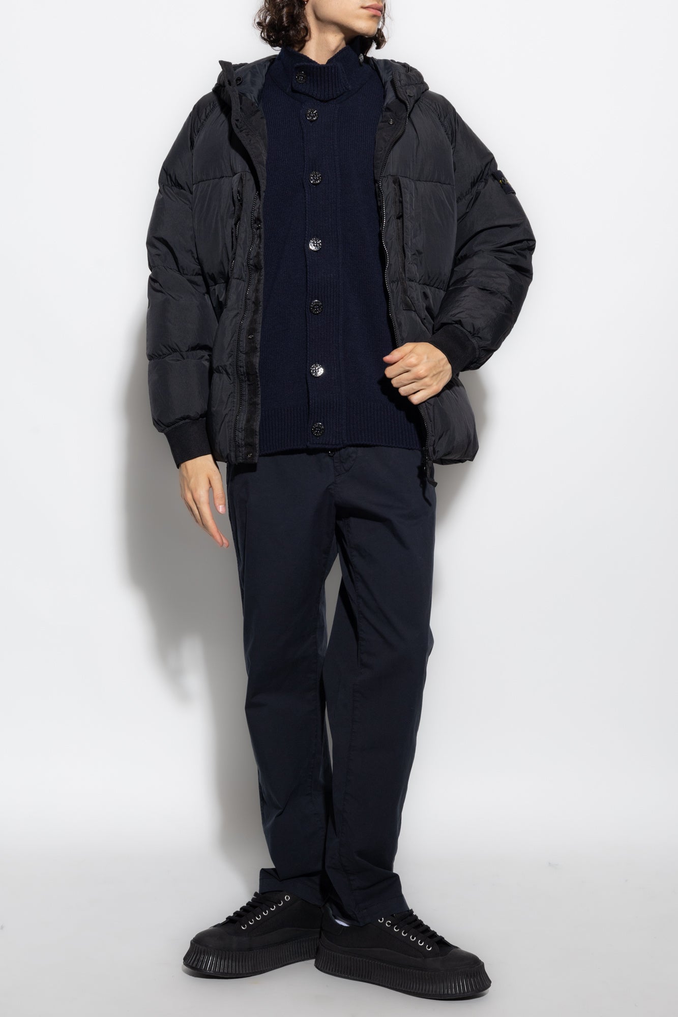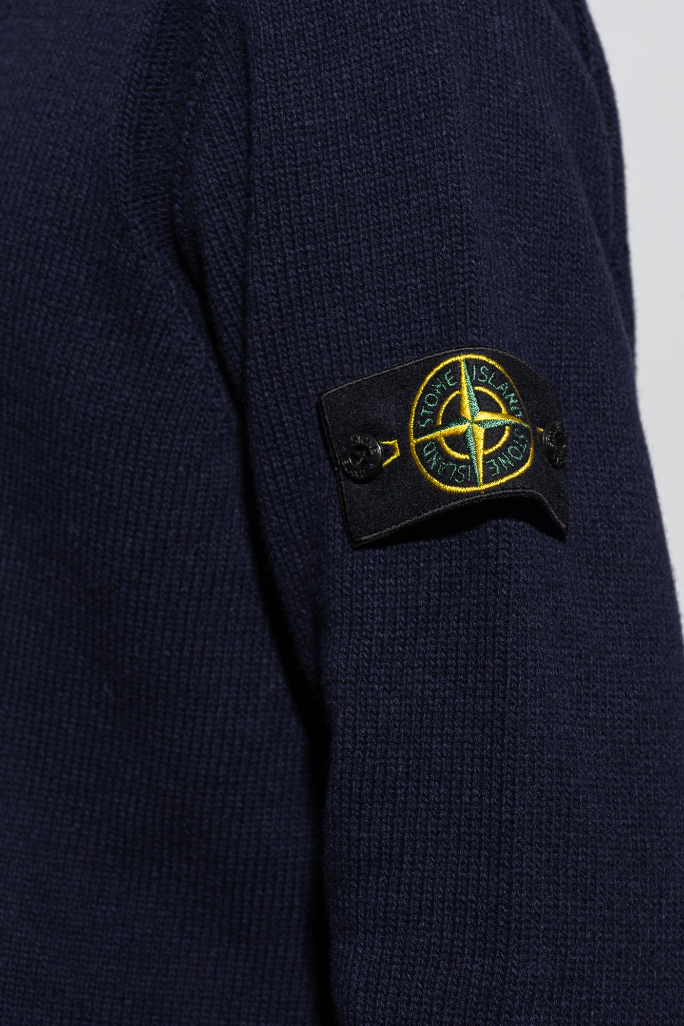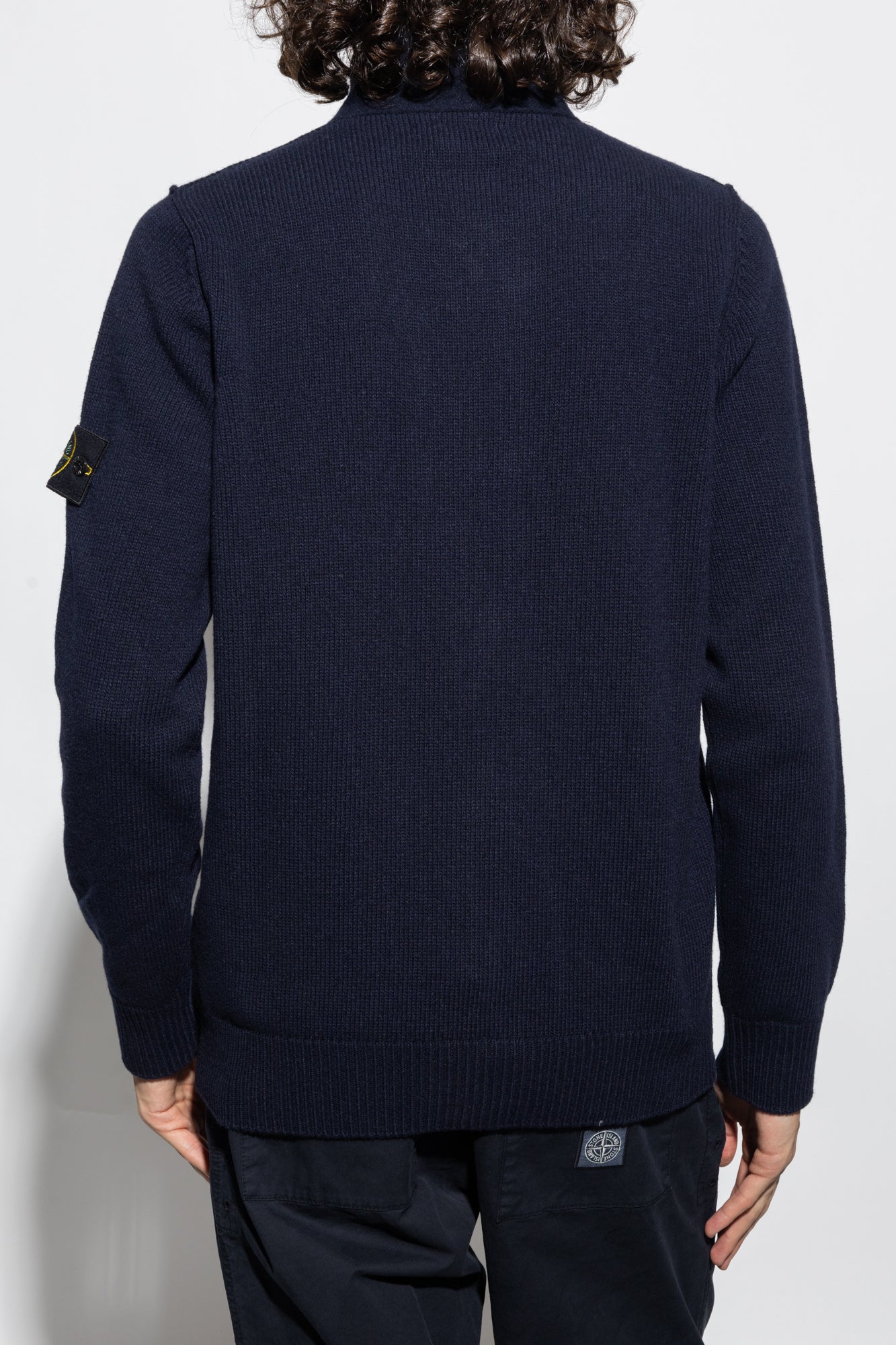 Coupe classique. Col montant en feutre avec couture interne finement côtelée. Mentonnière en maille finement côtelée avec fermeture boutonnée. Motif à bandes au point mousse sur les épaules et les emmanchures avant. Coutures en relief sur les emmanchures. Badge Stone Island sur la manche gauche. Poignets et bas finement côtelés. Fermeture zippée à double curseur sous patte avec boutons.