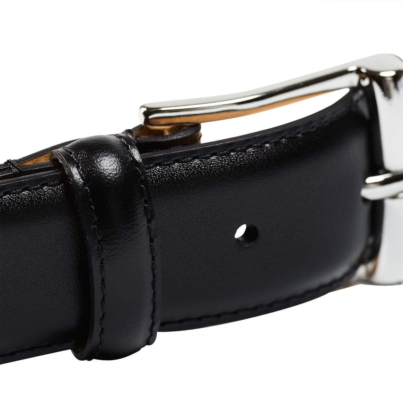 Notre ceinture en veau noir est entièrement doublée de cuir et dotée d'une boucle argentée finie à la main.