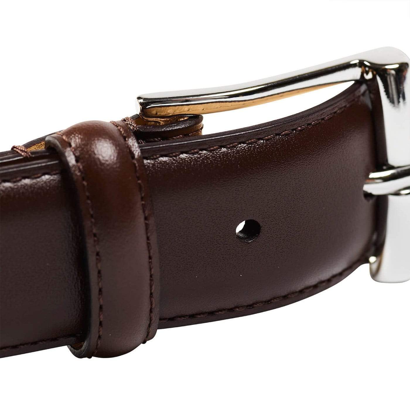 Notre ceinture en veau brun foncé est entièrement doublée de cuir et dotée d'une boucle argentée finie à la main.