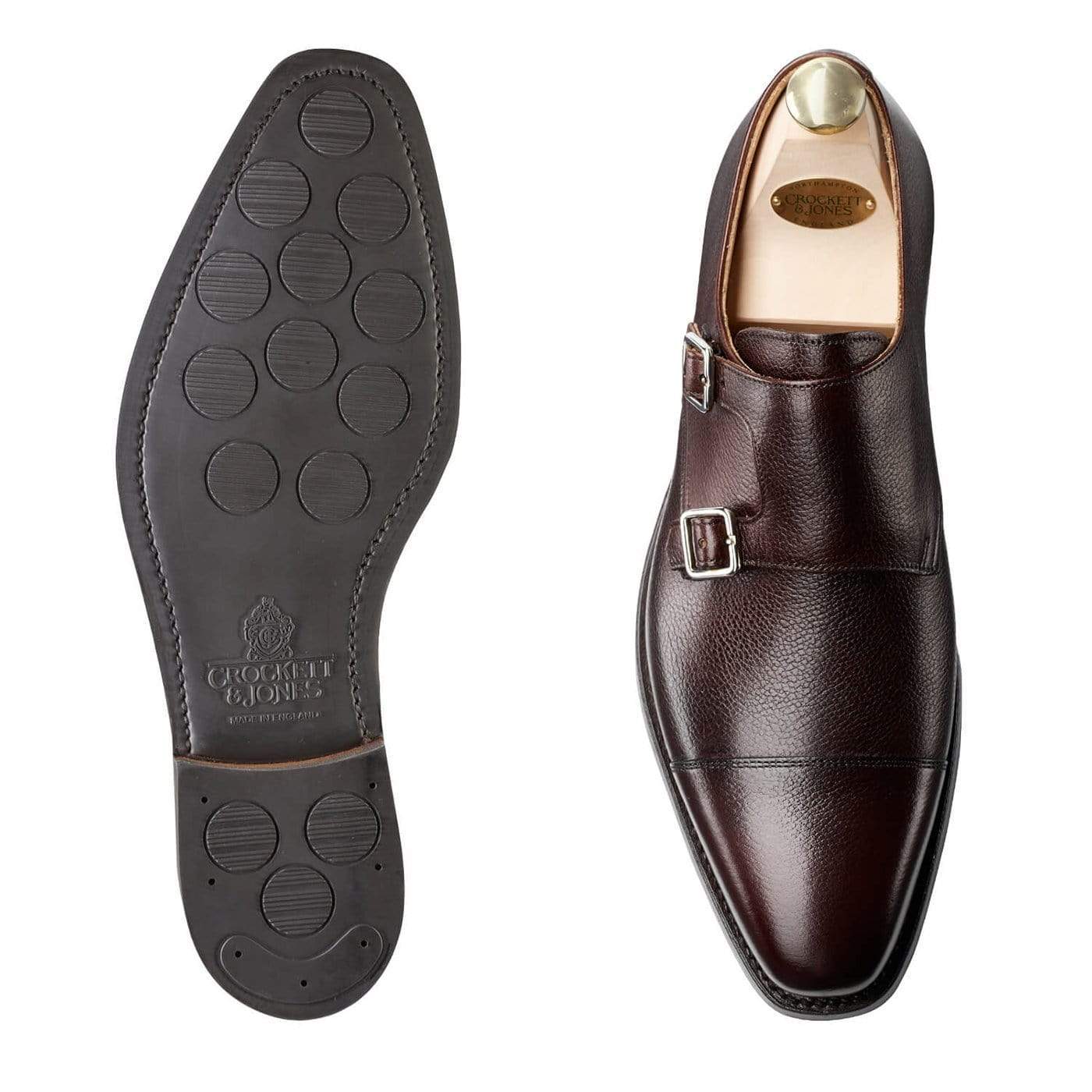 Lowndes, une chaussure de moine à double boucle avec un bout droit. Fabriqué à partir du grain de galet marron foncé le plus fin et doté d'une semelle en caoutchouc "City". De la collection principale pour hommes.