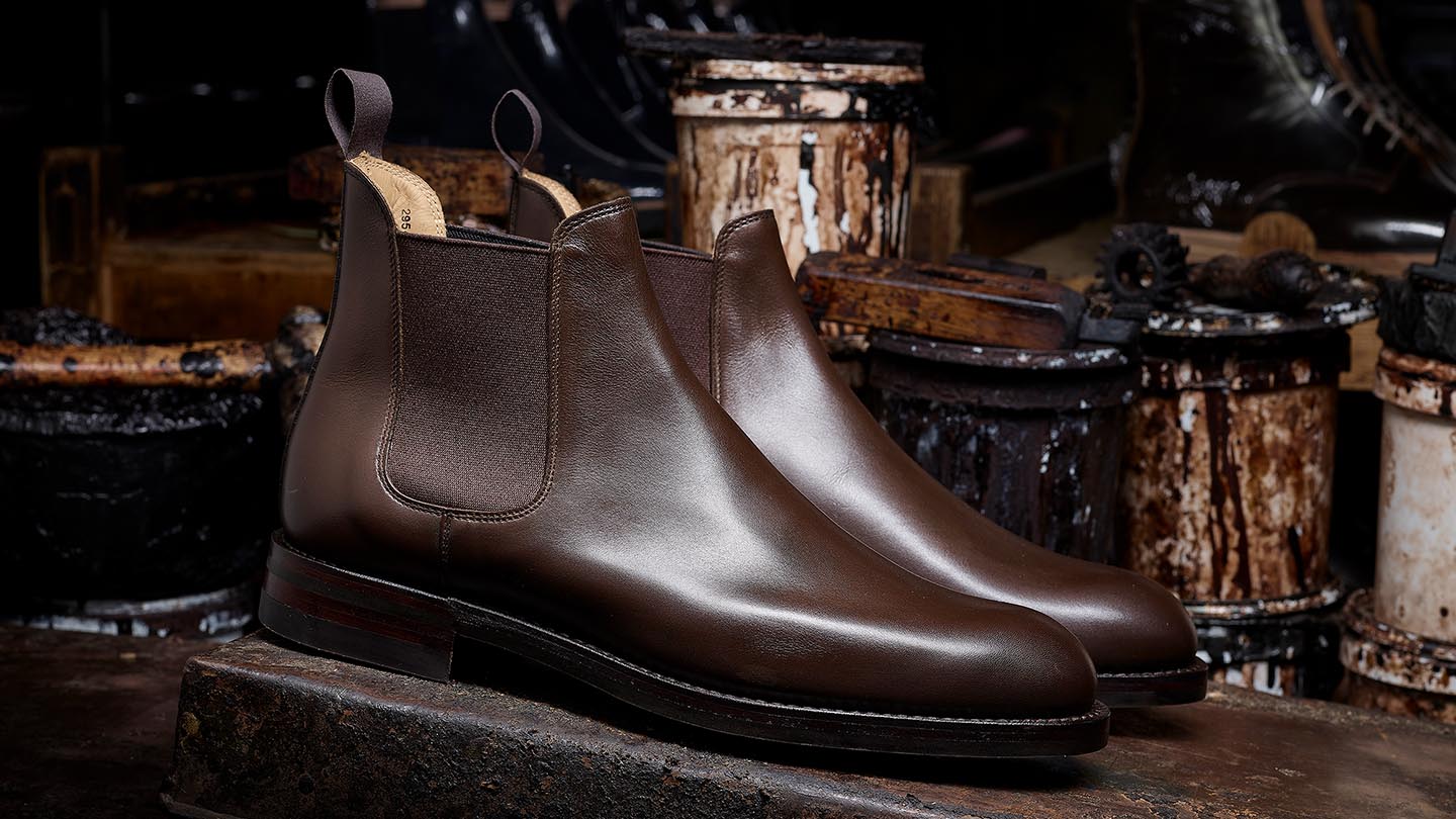 Chelsea 5, une botte Chelsea fabriquée en cuir de veau ciré marron foncé de qualité supérieure pour une résistance accrue à l'eau, avec des semelles en caoutchouc Dainite. De la collection principale pour hommes.