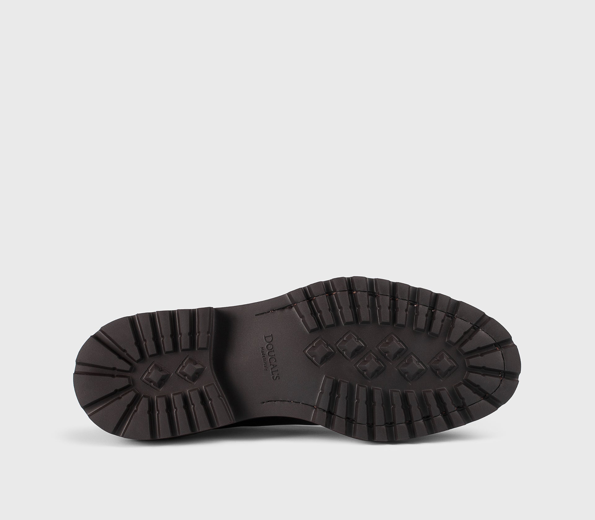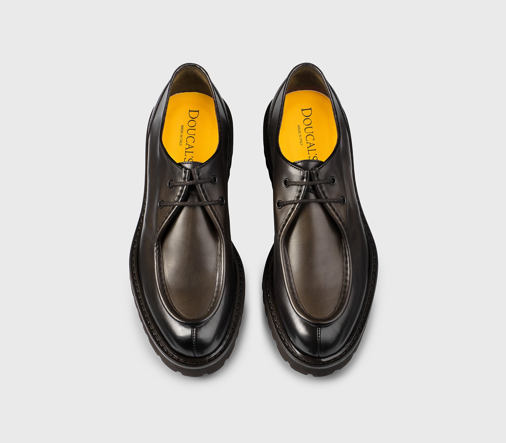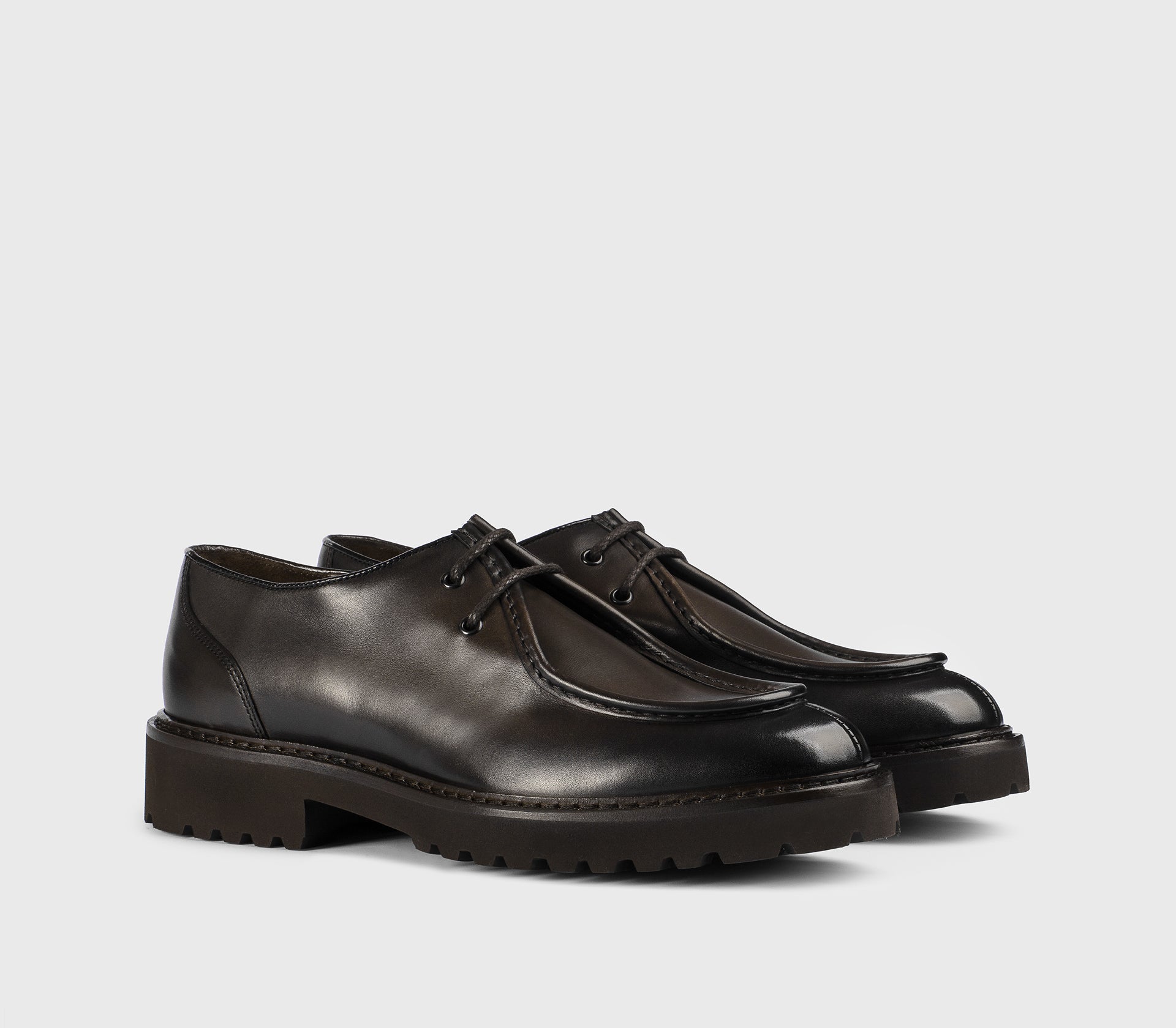 Chaussure à lacets à deux œillets en cuir marron foncé, design élégant aux lignes modernes avec couture plateau en relief. Elle se caractérise par le montage Blake qui rend la chaussure résistante et au chaussant souple. Semelle en gomme ultra-légère. Fabrication italienne.