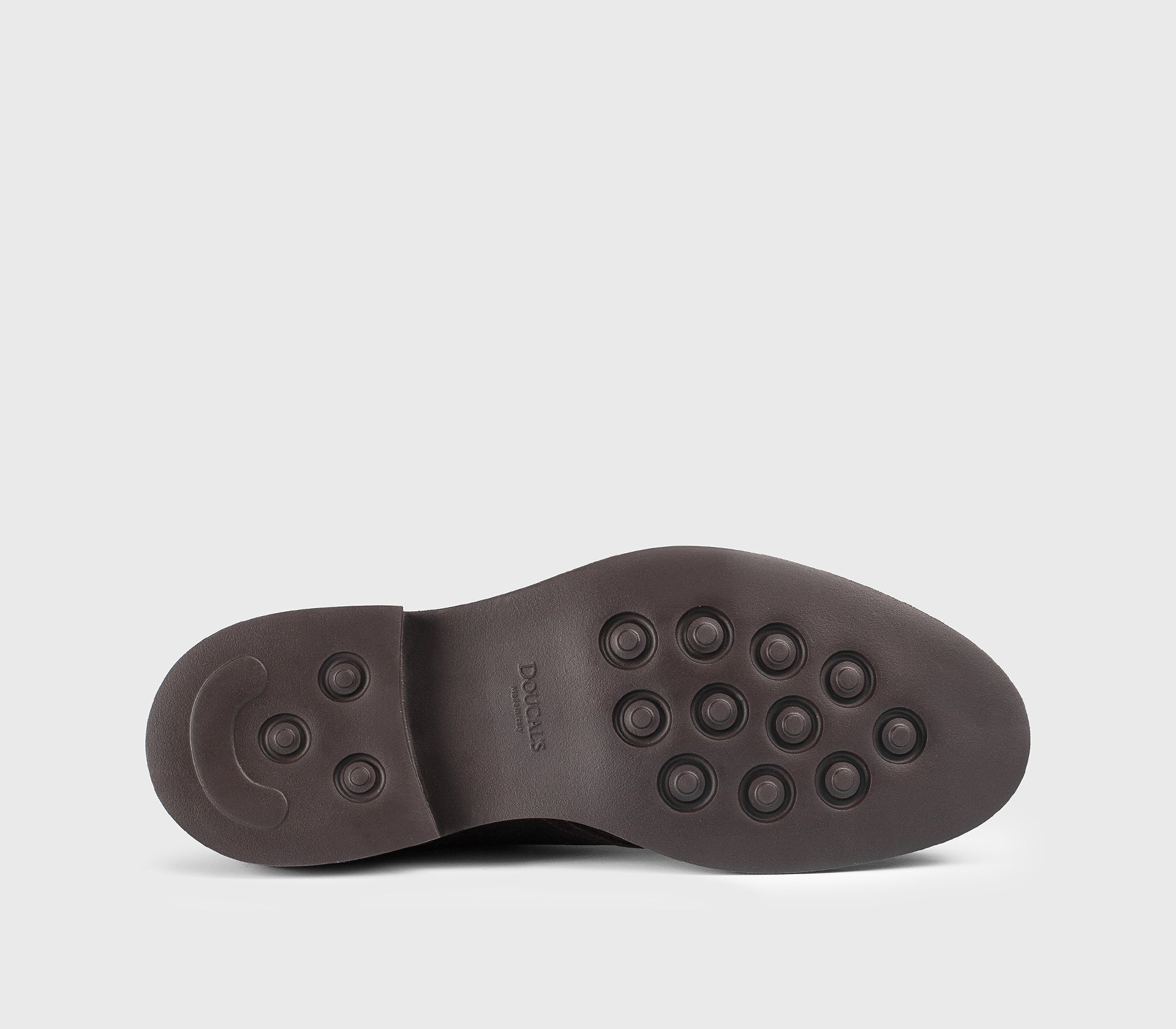 Desert boot à deux œillets en daim marron. Design traditionnel avec tige lisse aux lignes arrondies, adapté à toutes les occasions. Montage Ago avec semelle en gomme. Fabrication italienne.