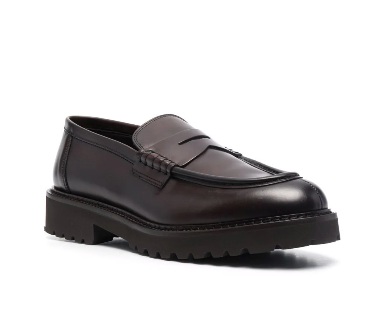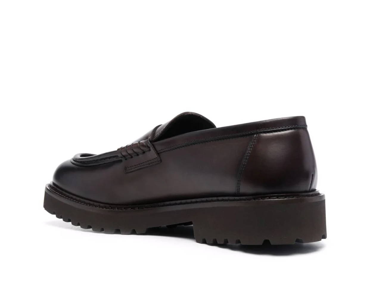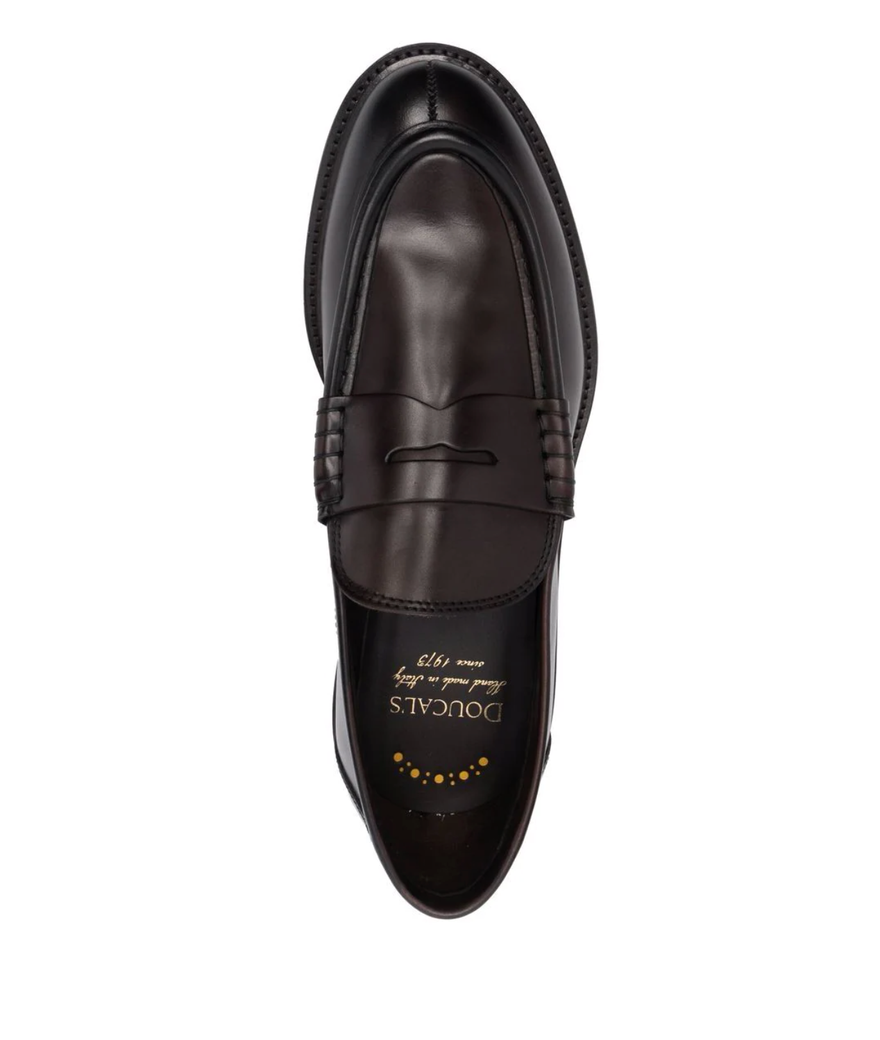 Mocassins modèle Penny en veau lisse noir, surpiqûres bol sur la tige. Semelle en caoutchouc. Traitement Blake. Fabriqué en Italie.