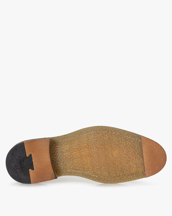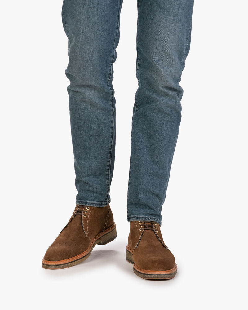 Une nouvelle introduction à la collection hiver 2022 : The Tanker. Le bas de cette botte décontractée ressemble à une semelle en caoutchouc naturel, également appelée "crêpe". Le caoutchouc naturel authentique est beau, mais très fragile. Un mélange de caoutchouc naturel et de caoutchouc synthétique a été développé spécialement pour ce bateau. Le Tanker a désormais l'aspect du caoutchouc naturel avec la résistance à l'abrasion du caoutchouc synthétique. La doublure en cuir de veau et la forme soignée garantissent un confort durable. Cette botte cognac est fabriquée en daim huilé sportif provenant d'une petite tannerie de daim à Santa Croce su'll Arno dans la province de Pise, en Italie.