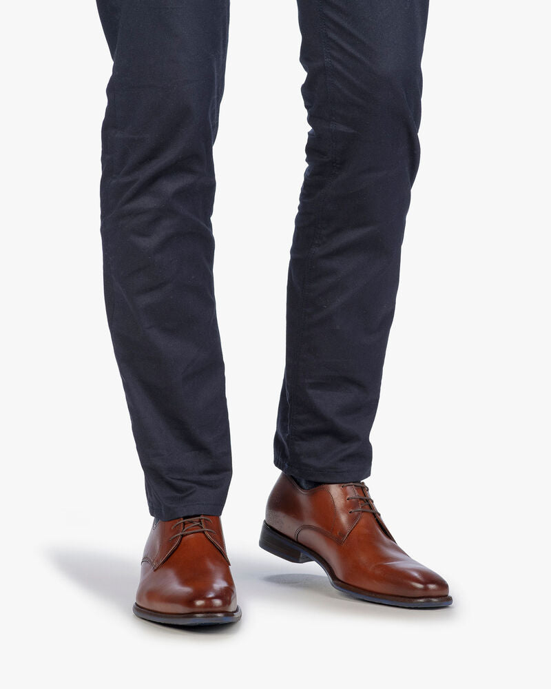 Un motif laser géométrique a été appliqué sur le talon de ce modèle derby grâce à la technologie laser. La semelle bleu cobalt est en matériau TPU durable. Le talon est divisé par une connexion en queue d'aronde en une partie rembourrée en TPU et une partie en cuir luxueux qui est finie avec 6 clous en cuivre. La doublure de la chaussure est en cuir de veau de première qualité. Cette variante est réalisée en cuir de veau souple cognac qui a été coloré manuellement dans l'usine de chaussures. Le cuir provient d'une tannerie de Chiampo, Vicenza, Italie. La chaussure est cousue selon la méthode de confection Blake.