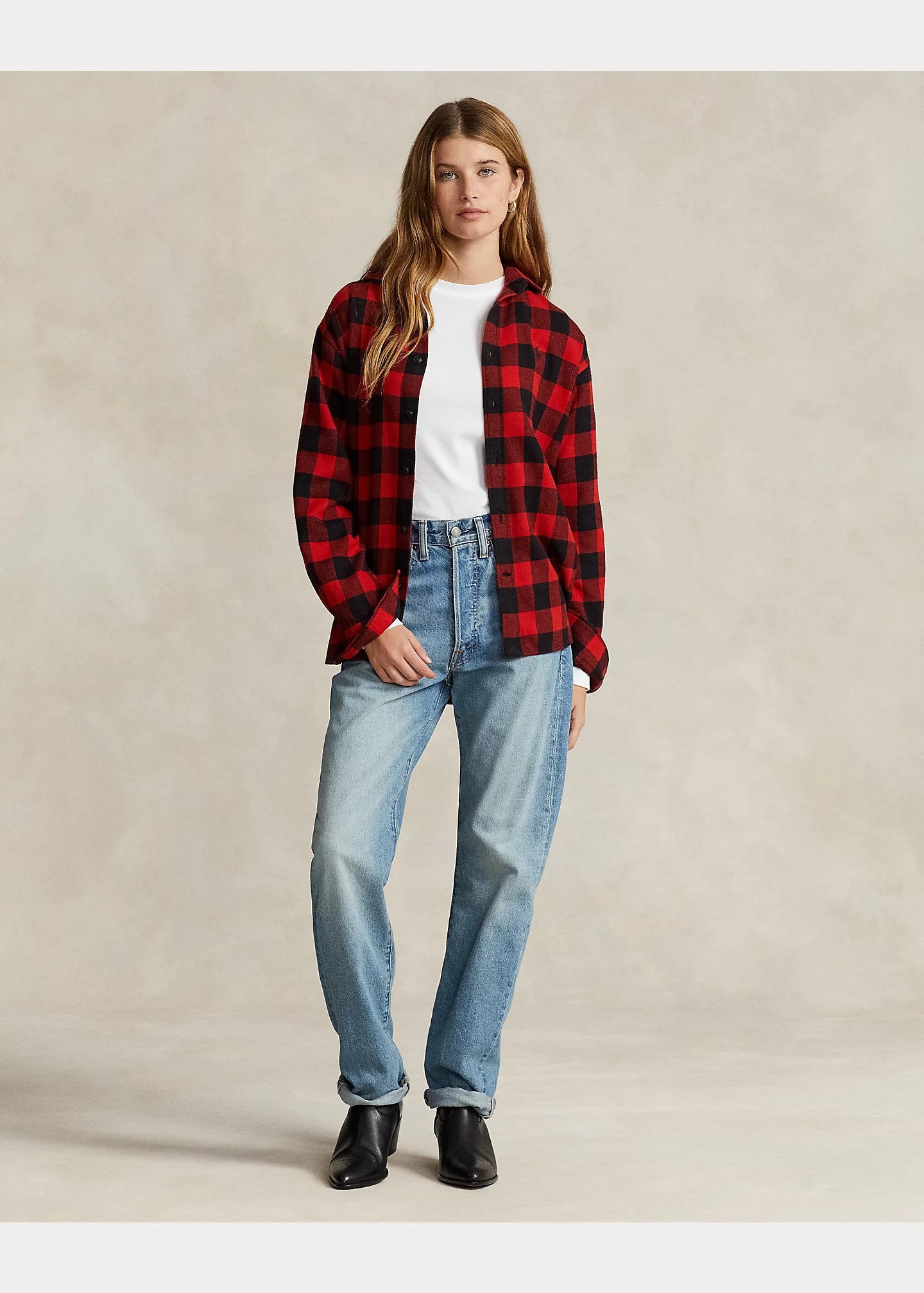 Arborant une coupe décontractée, cette chemise en sergé de coton fluide est rehaussée d'un motif écossais Buffalo et brodée de notre poney distinctif.