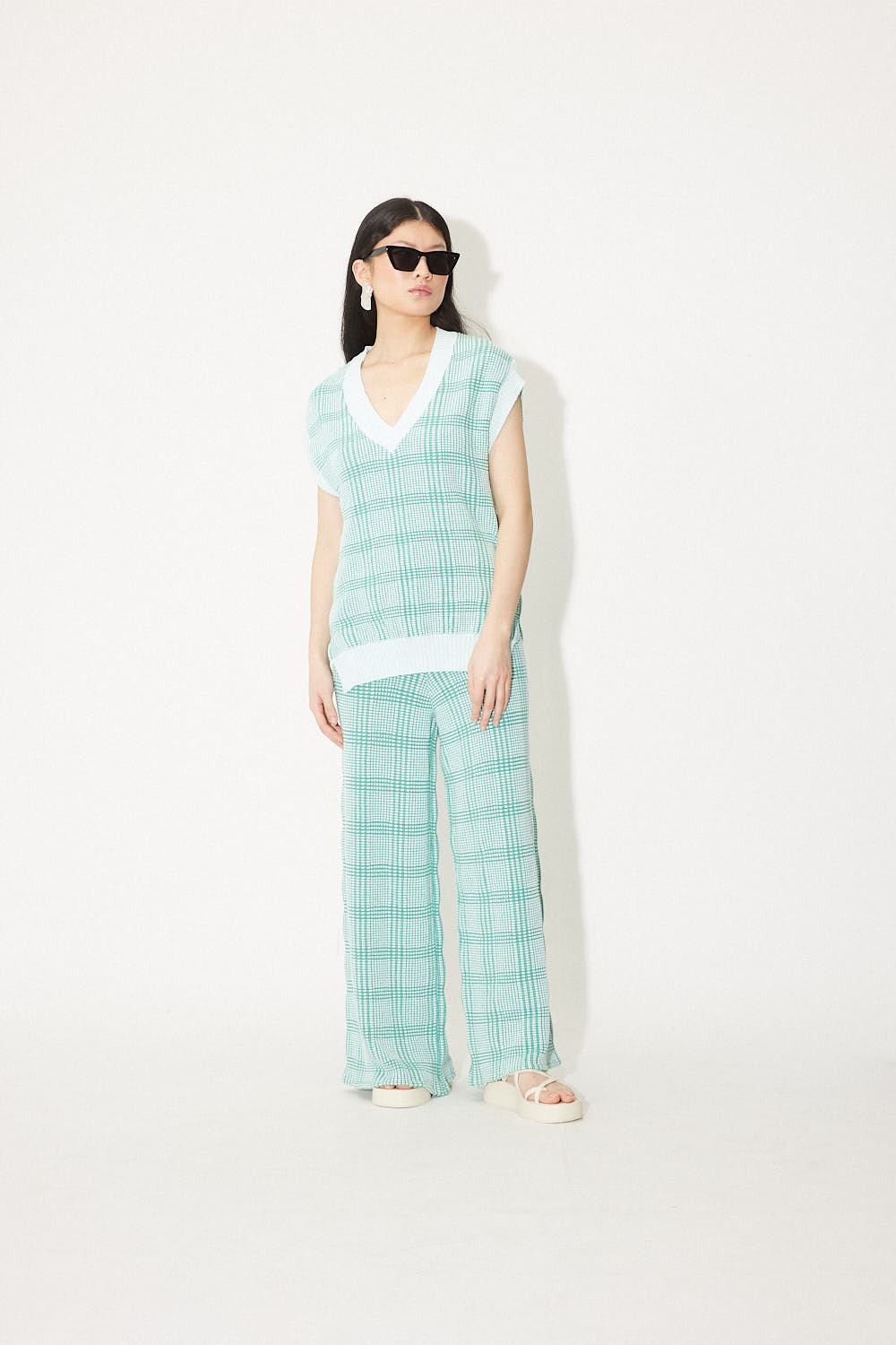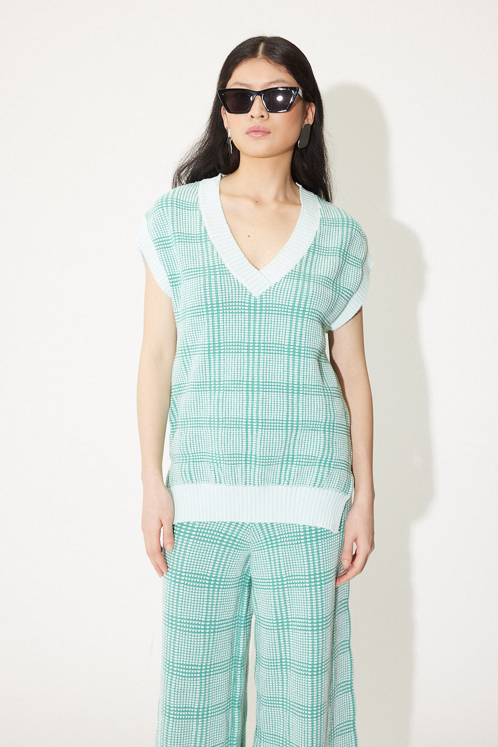 Pull sans manche en jacquard à col V bleu et émeraude.