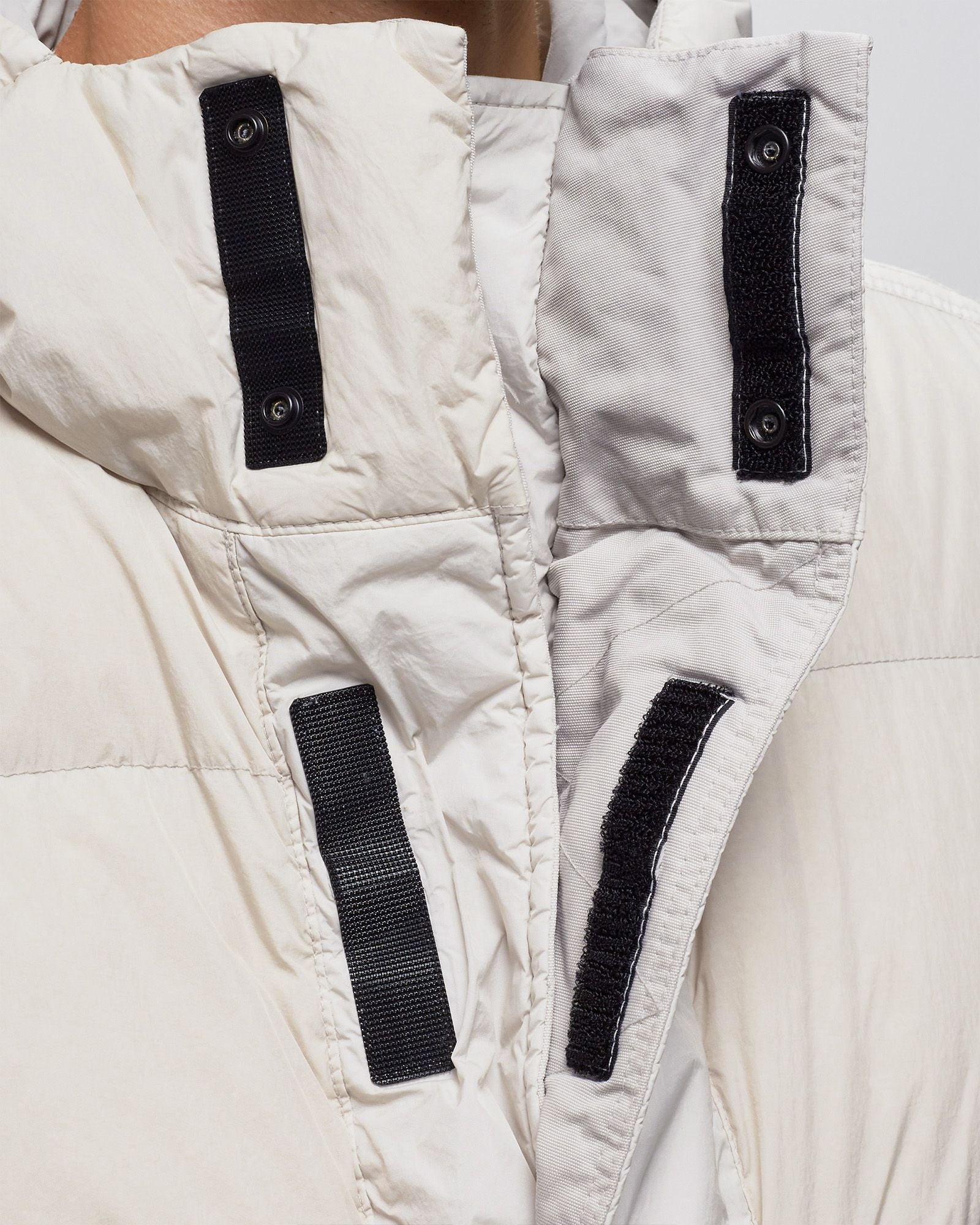 GARMENT DYED CRINKLE REPS RECYCLED NYLON DOWN : Parka réalisée à partir d’un reps de nylon léger 100 % recyclé soumis à un battage puissant et résiné à l'intérieur, pour une protection coupe-vent et partiellement imperméable. La pièce est rembourrée par injection directe de plumes haute qualité spécialement traitées pour résister aux contraintes de la teinture. L'injection directe de plumes et la confection allégée permettent d’obtenir des vêtements encore plus légers et confortables. Bain de teinture offrant une pénétration hétérogène sur le tissu résiné pour conférer à la surface un aspect flou et moiré. Solution de teinture enrichie d’un agent spécial sans PFC pour un effet déperlant. Plume certifiée RDS - Responsible Down Standard.