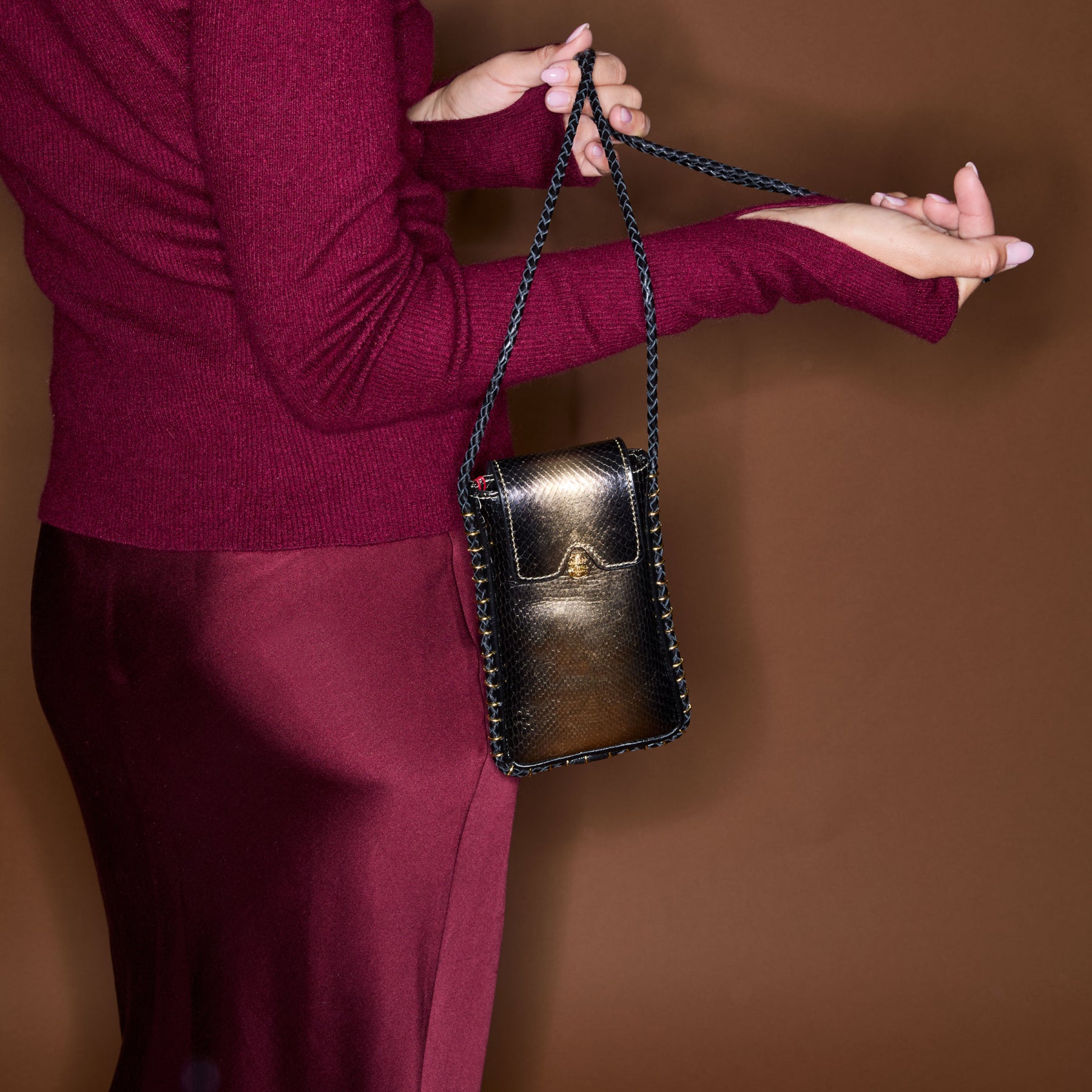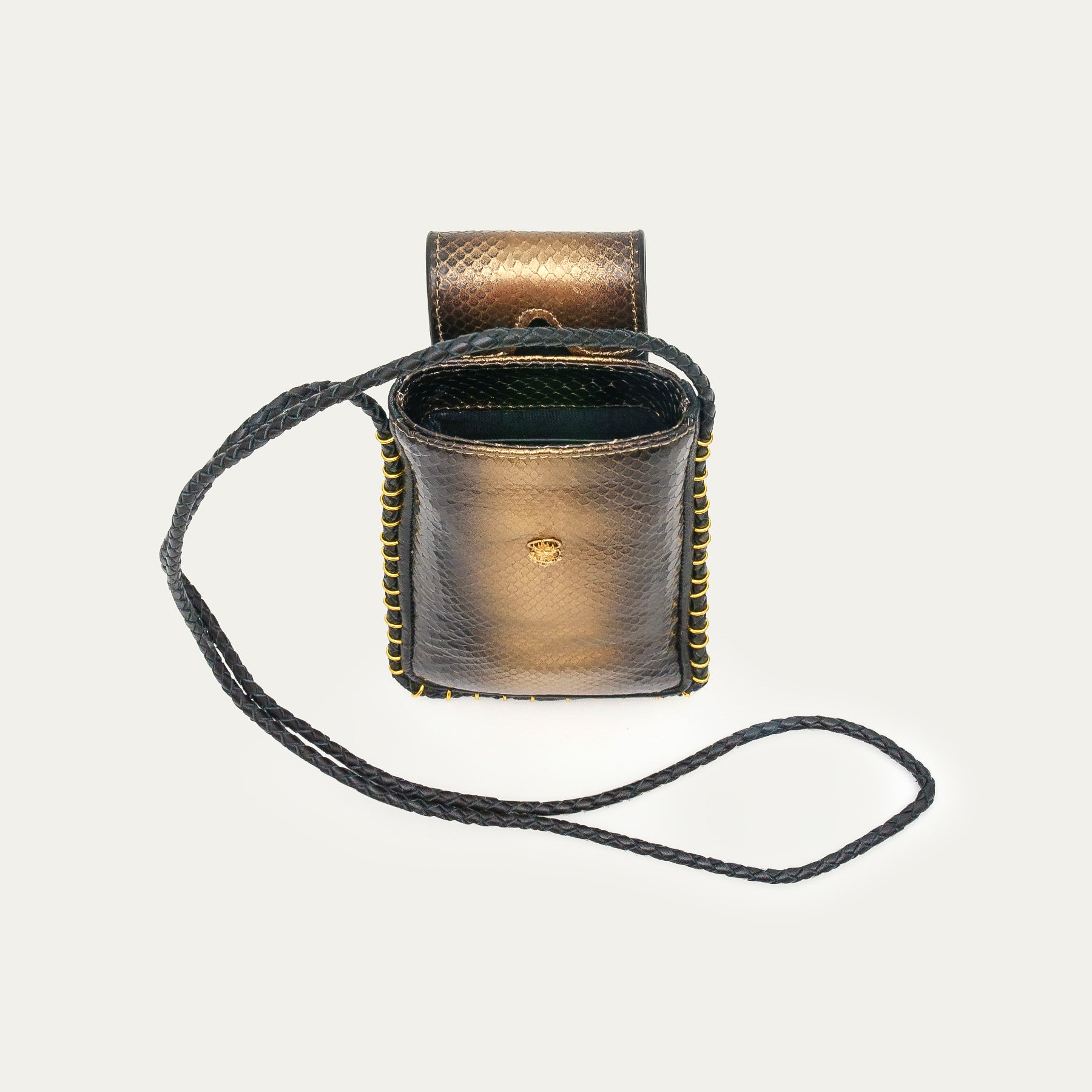 Notre étui à lunettes Émile a été réalisé à la main et confectionné en python. Doté d'une poche principale, il se ferme à l’aide d’un rabat aimanté, orné d’un mini scarabée. Émile possède également 3 fentes à l'arrière de sa pochette, afin que vous puissiez ranger vos cartes sans difficulté. Grâce à sa corde en cuir, vous pourrez le porter en cross body ou bien autour du cou.
