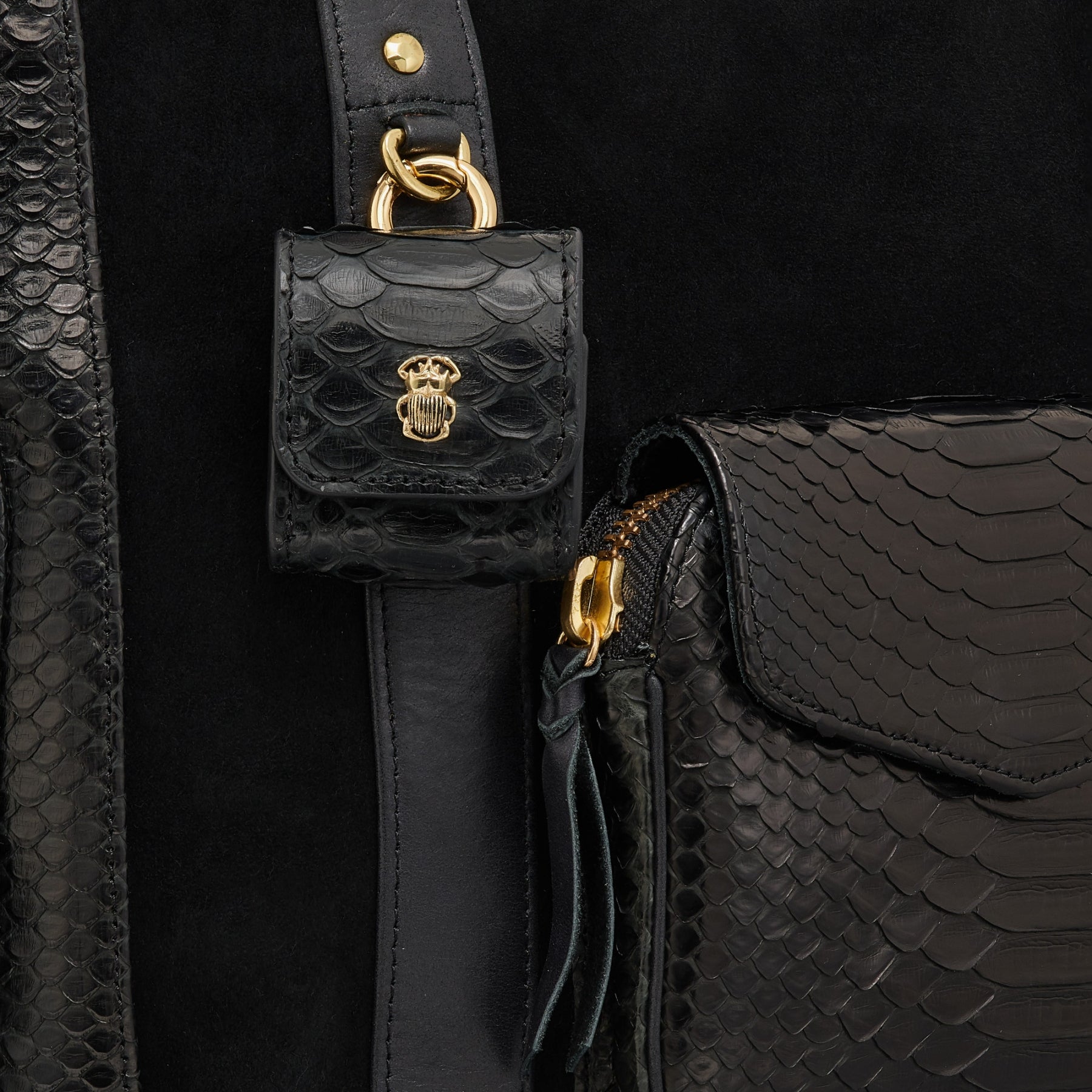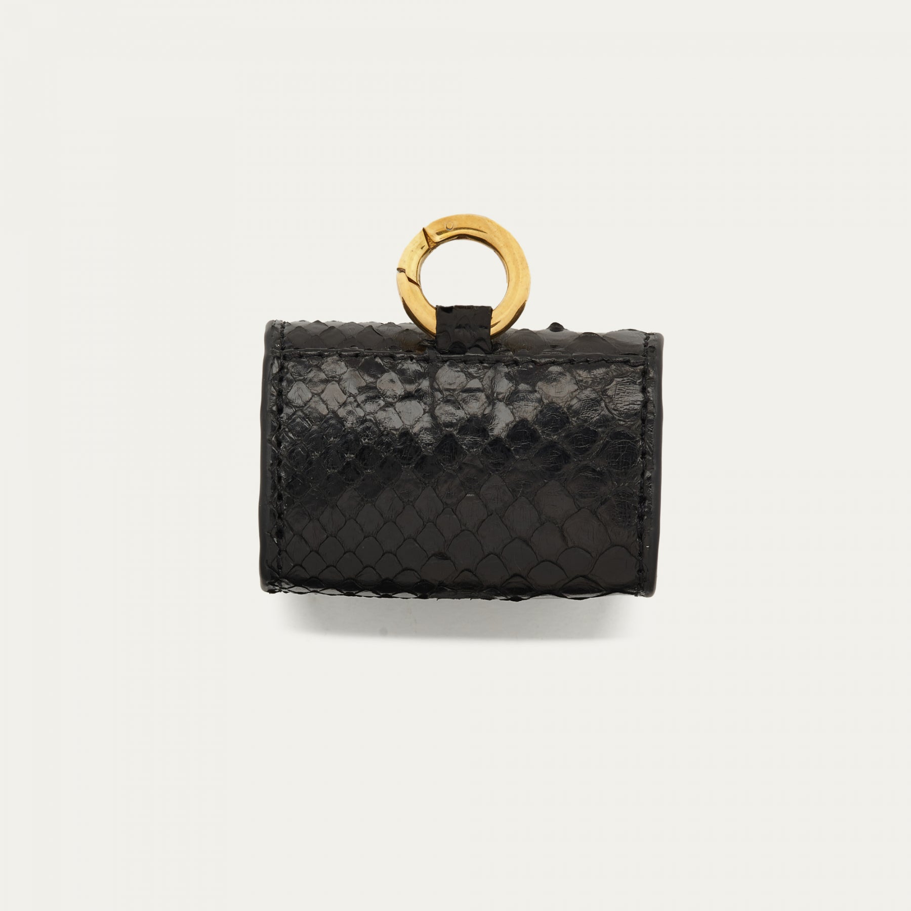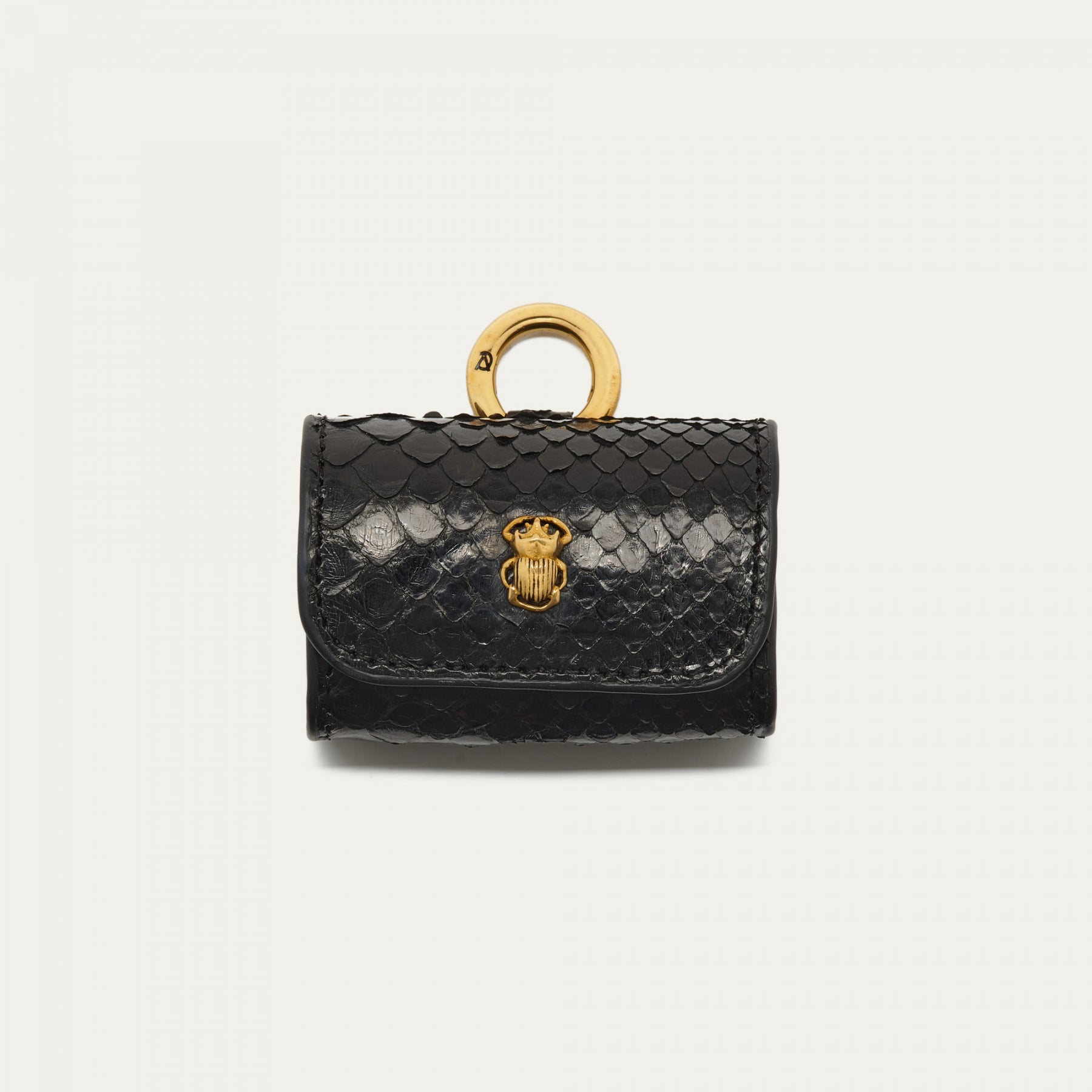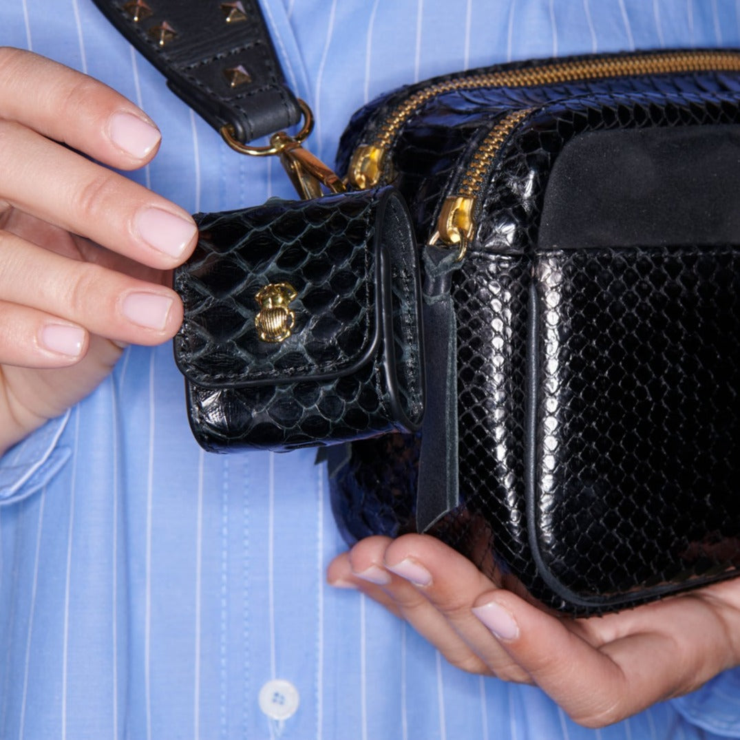Notre premier étui à AirPods Jamie est orné d'une beetle dorée à l'avant. Son mousqueton vous permettra de l'accrocher aussi bien à vos passants de pantalon, qu'à votre sac ou étui de téléphone portable, tel que notre Double Marcus.