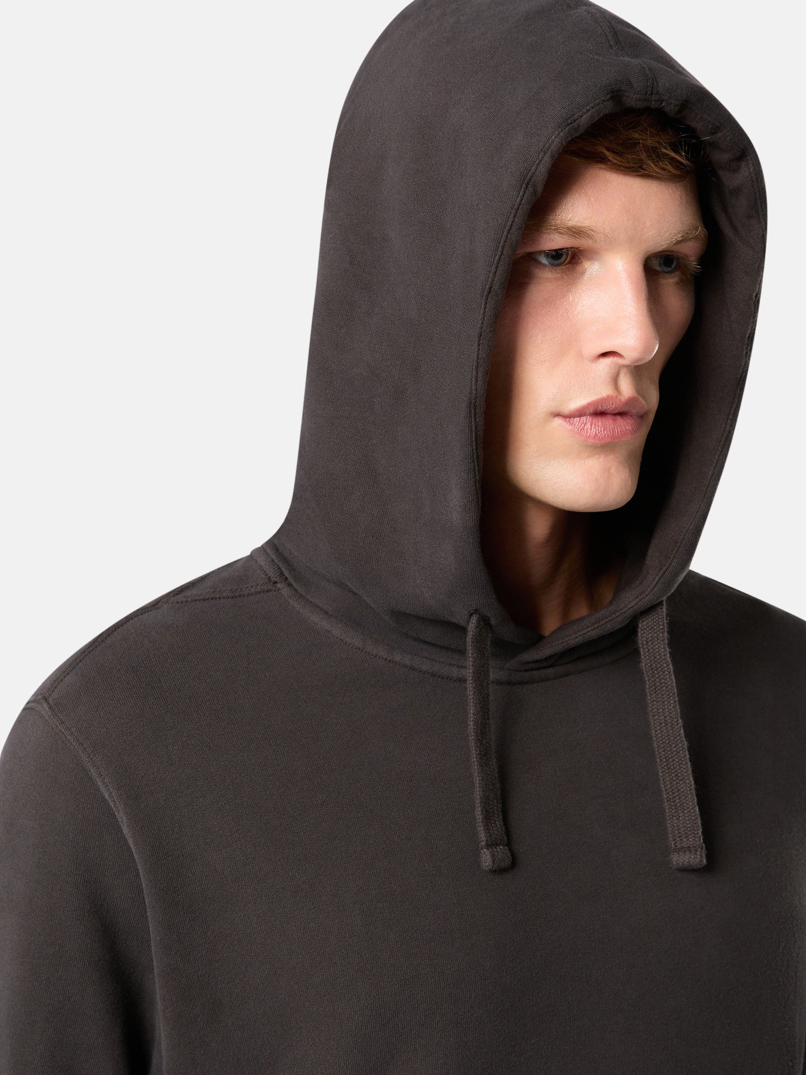 Sweat-shirt en coton biologique molletonné gratté. Capuche à cordon de serrage, poches et bande côtelée en coton sur les côtés. Modèle teint en pièce.
