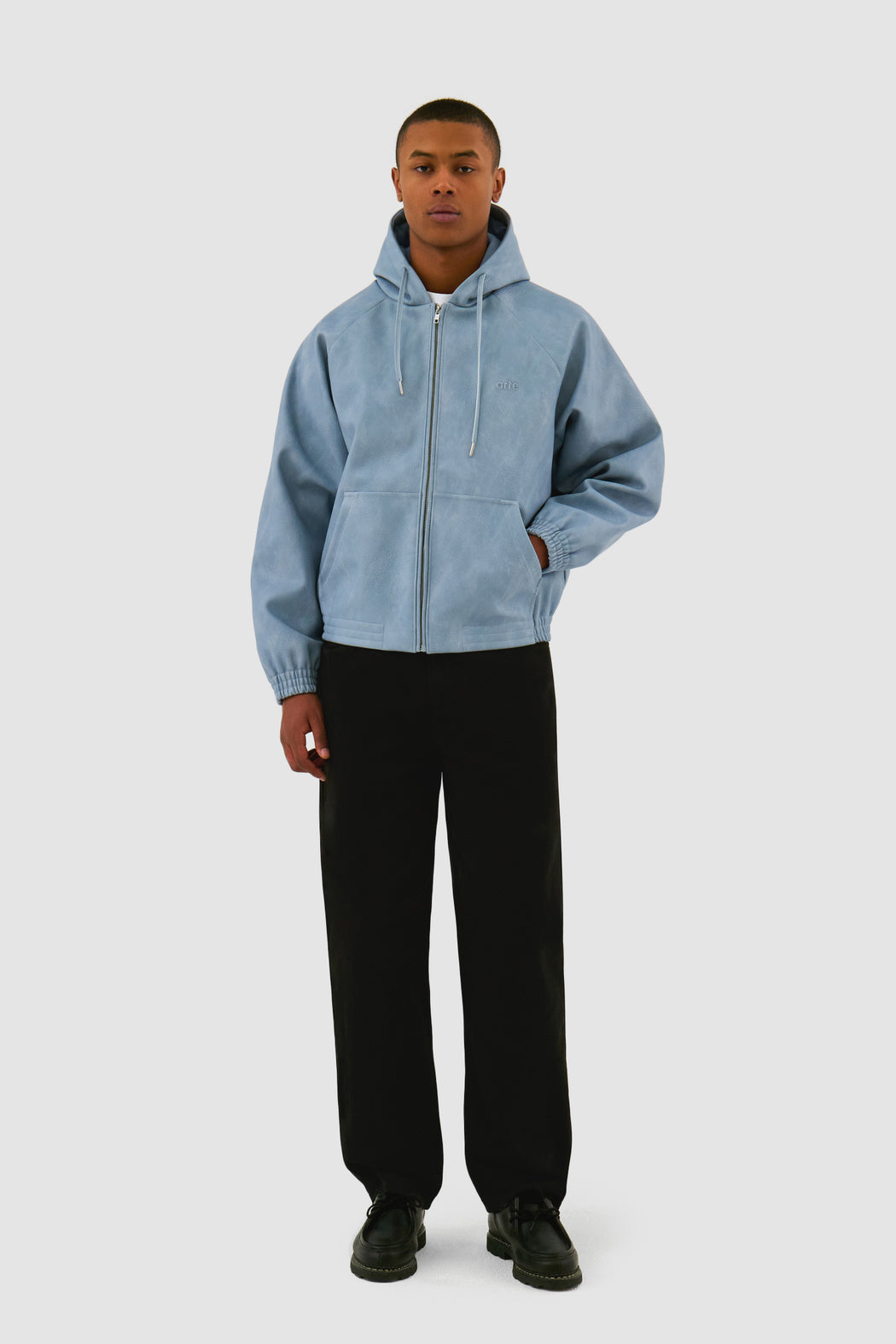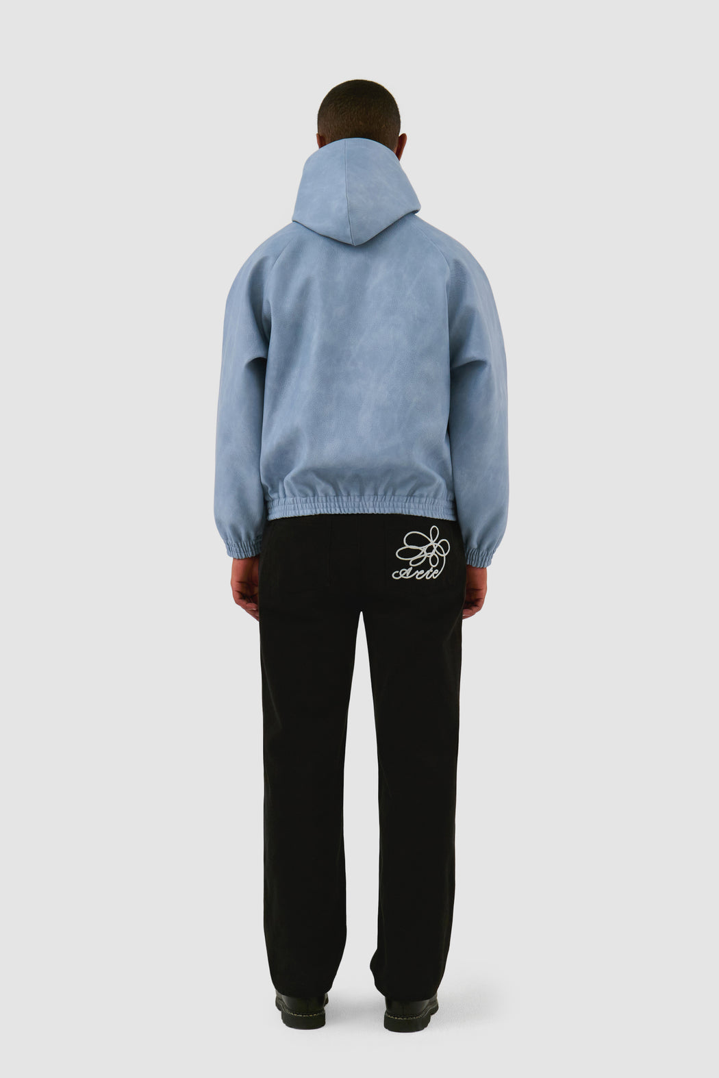 La veste en cuir à capuche bleue est une version améliorée d'une veste de tous les jours. Fabriquée en faux cuir de première qualité, elle présente une coupe décontractée et est dotée de deux poches, de cordons de serrage et d'une fermeture à glissière sur toute la longueur. Le logo Arte est embossé sur le côté gauche de la poitrine.
