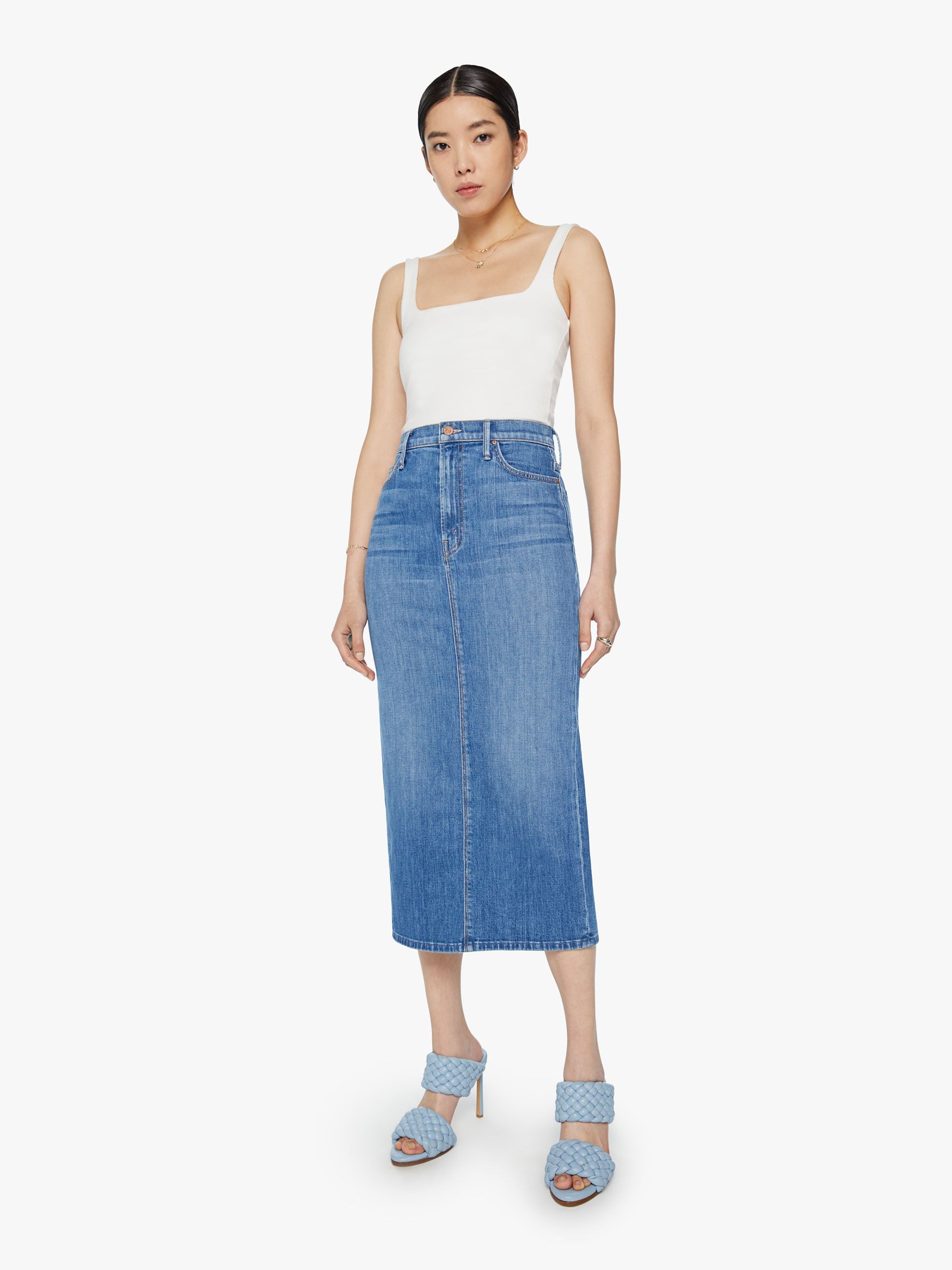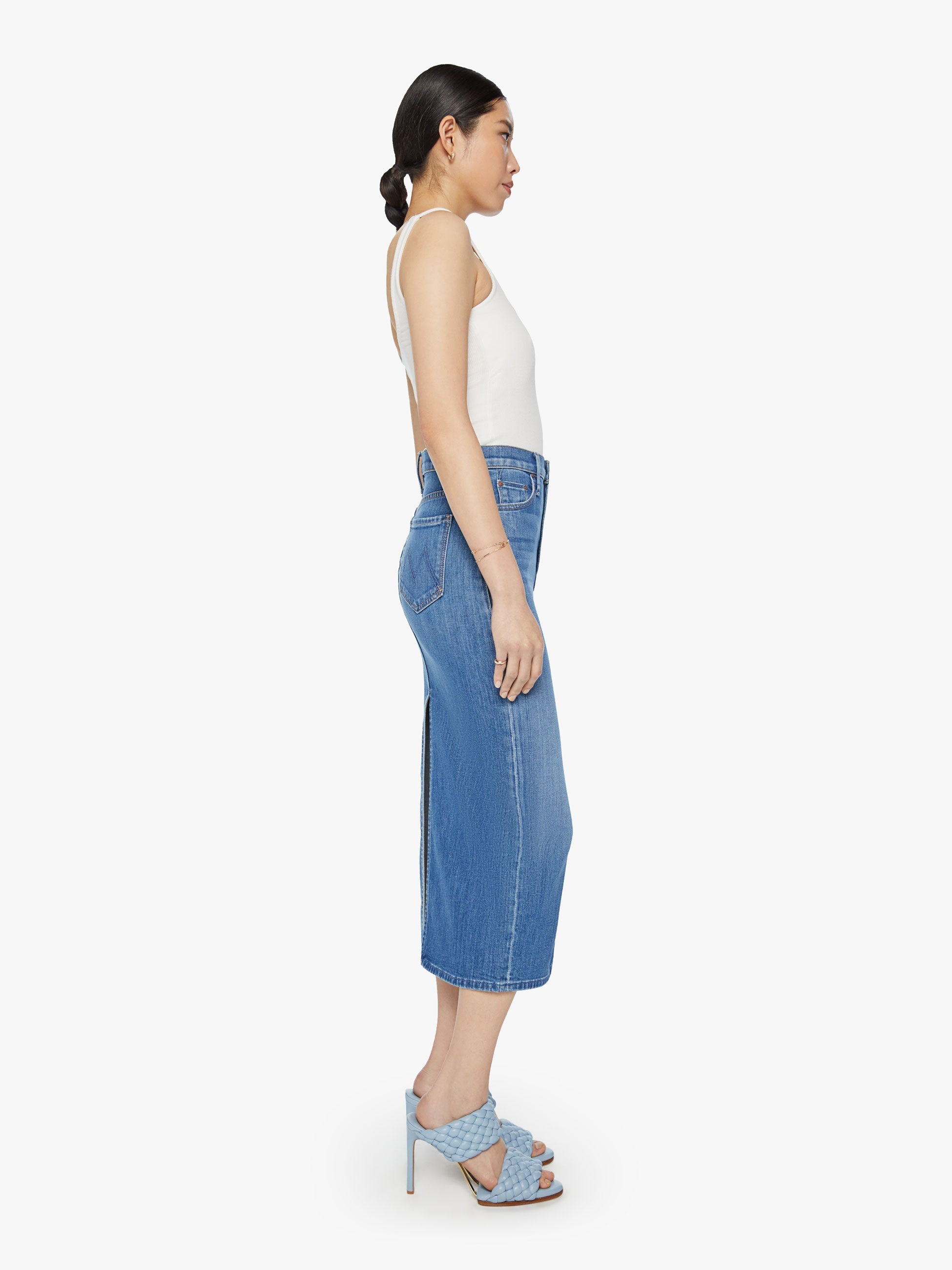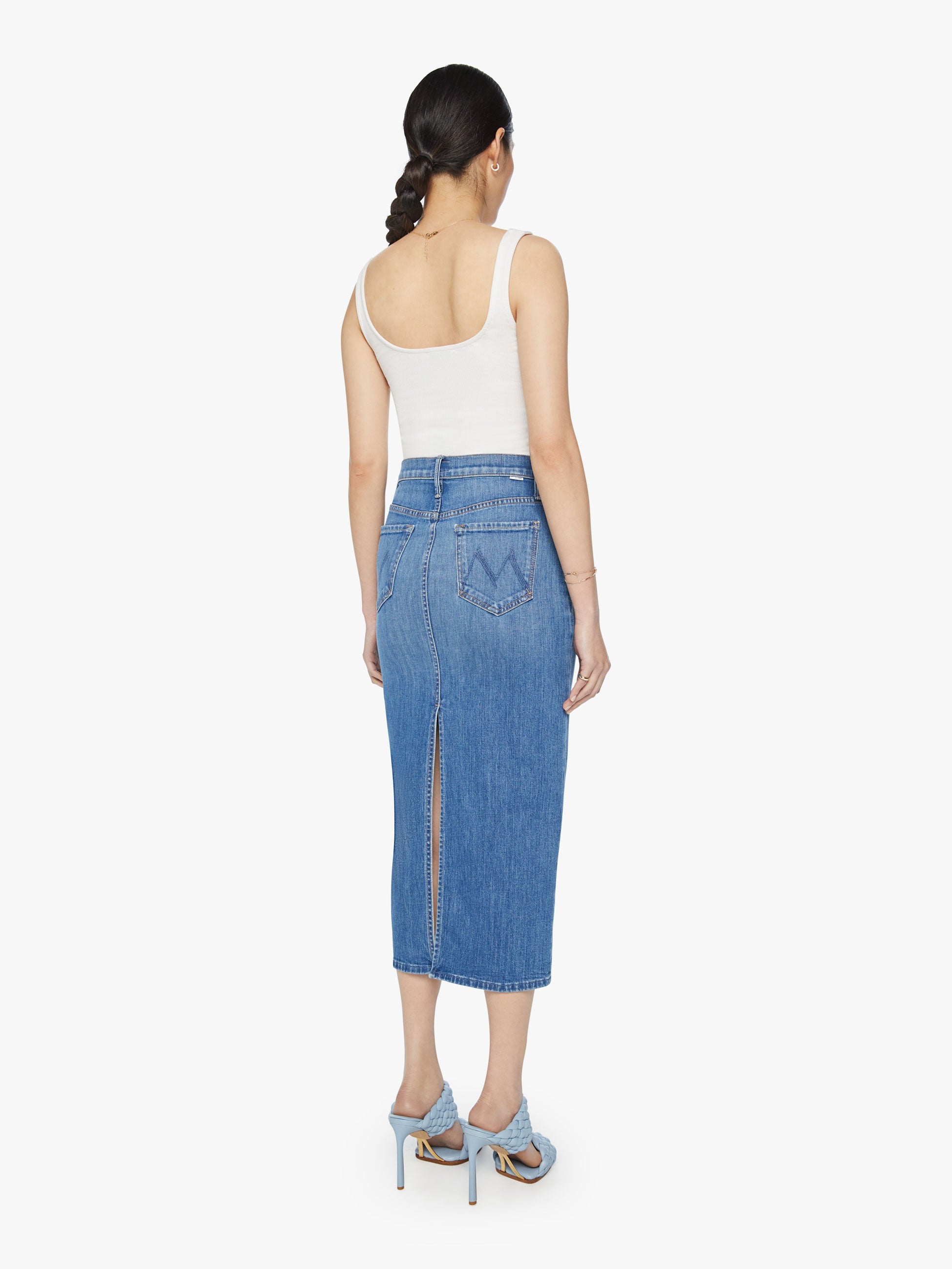 Salut, partenaire. Une jupe crayon en jean avec une taille haute, une coupe étroite et une fente au dos jusqu'aux cuisses. Confectionné en denim avec une touche de stretch, New Sheriff In Town est un délavage bleu moyen avec décoloration et moustaches.