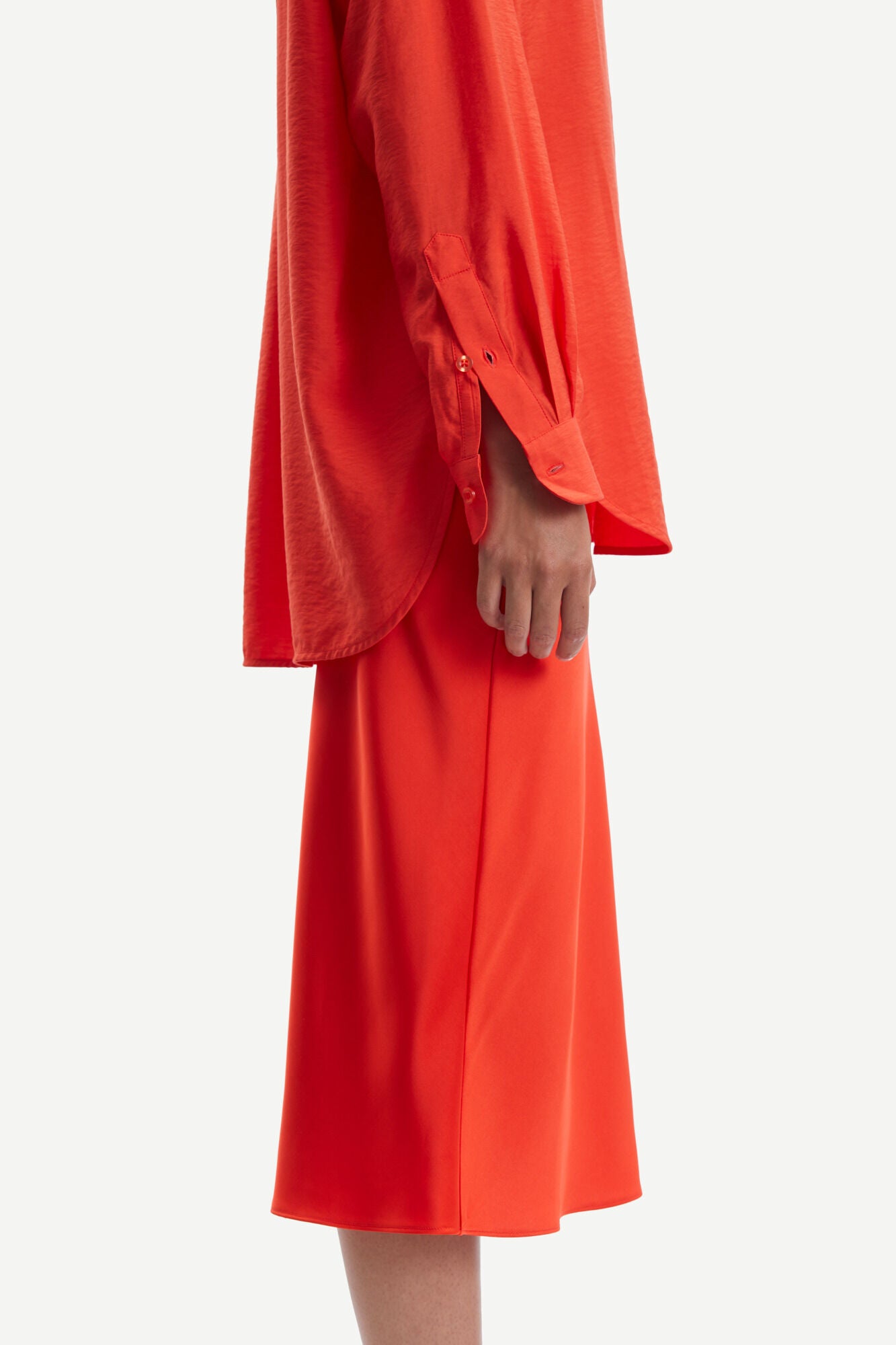 Jupe longueur midi avec coupe biaisée ajustée et ourlet légèrement évasé. Bordure décorative à la taille. Tissu en mélange de polyester recyclé légèrement brillant.