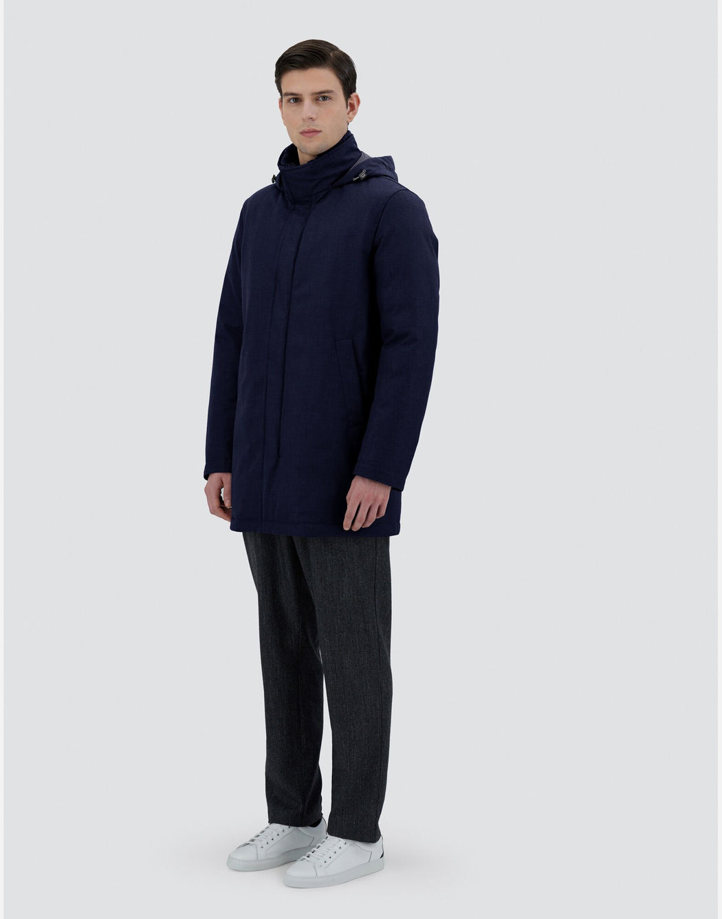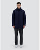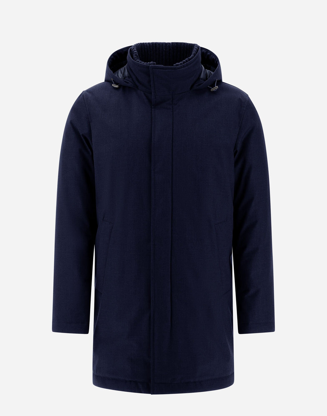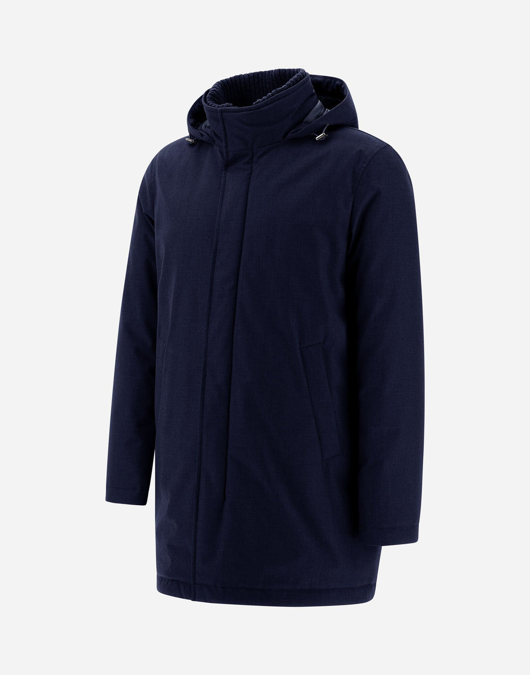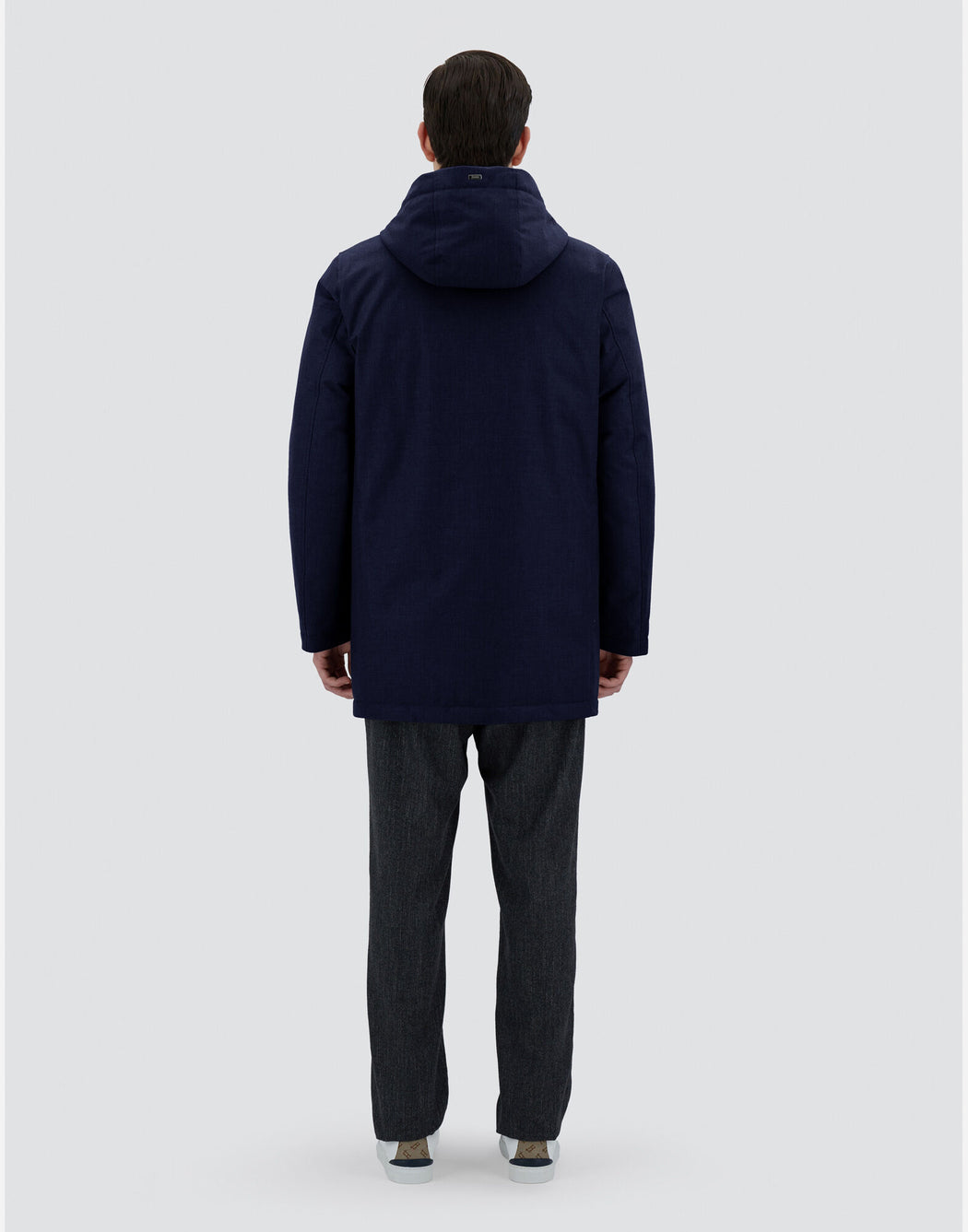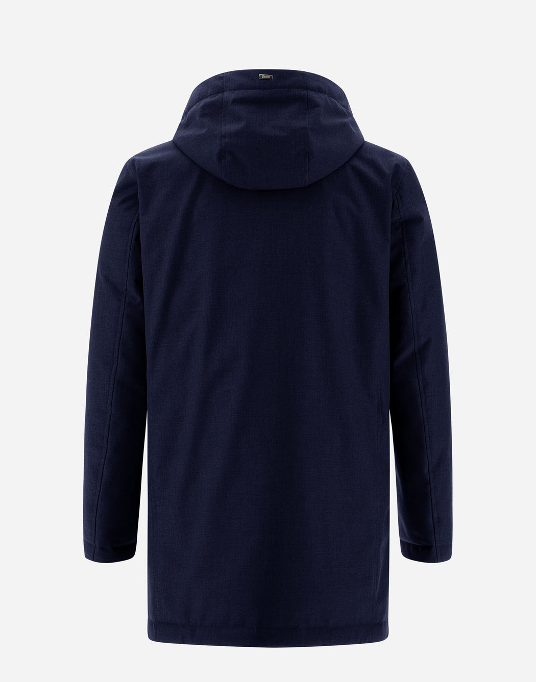 Blouson en tissu technique présentant le fini d'une laine peignée et une membrane ultralégère, respirante et coupe-vent.