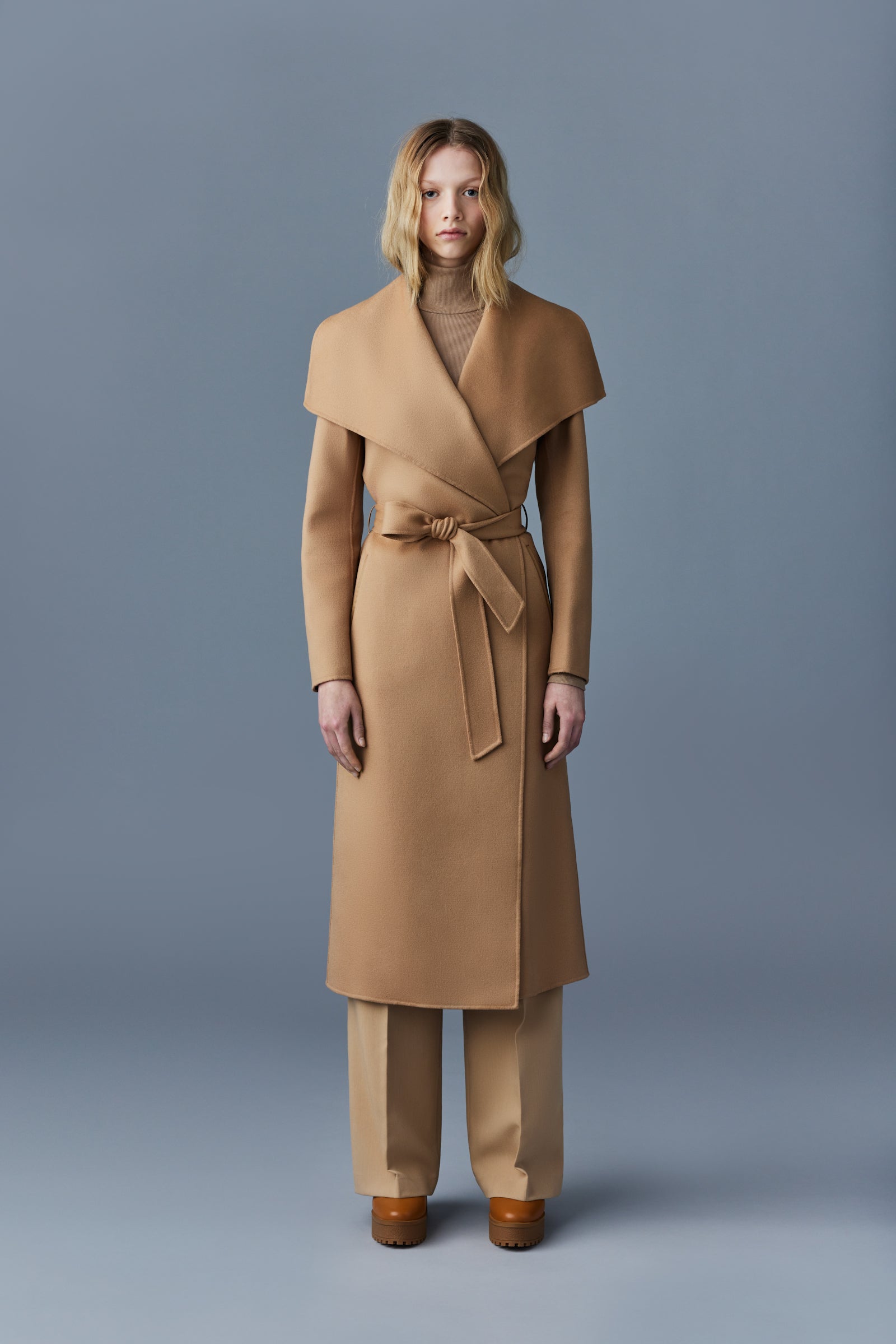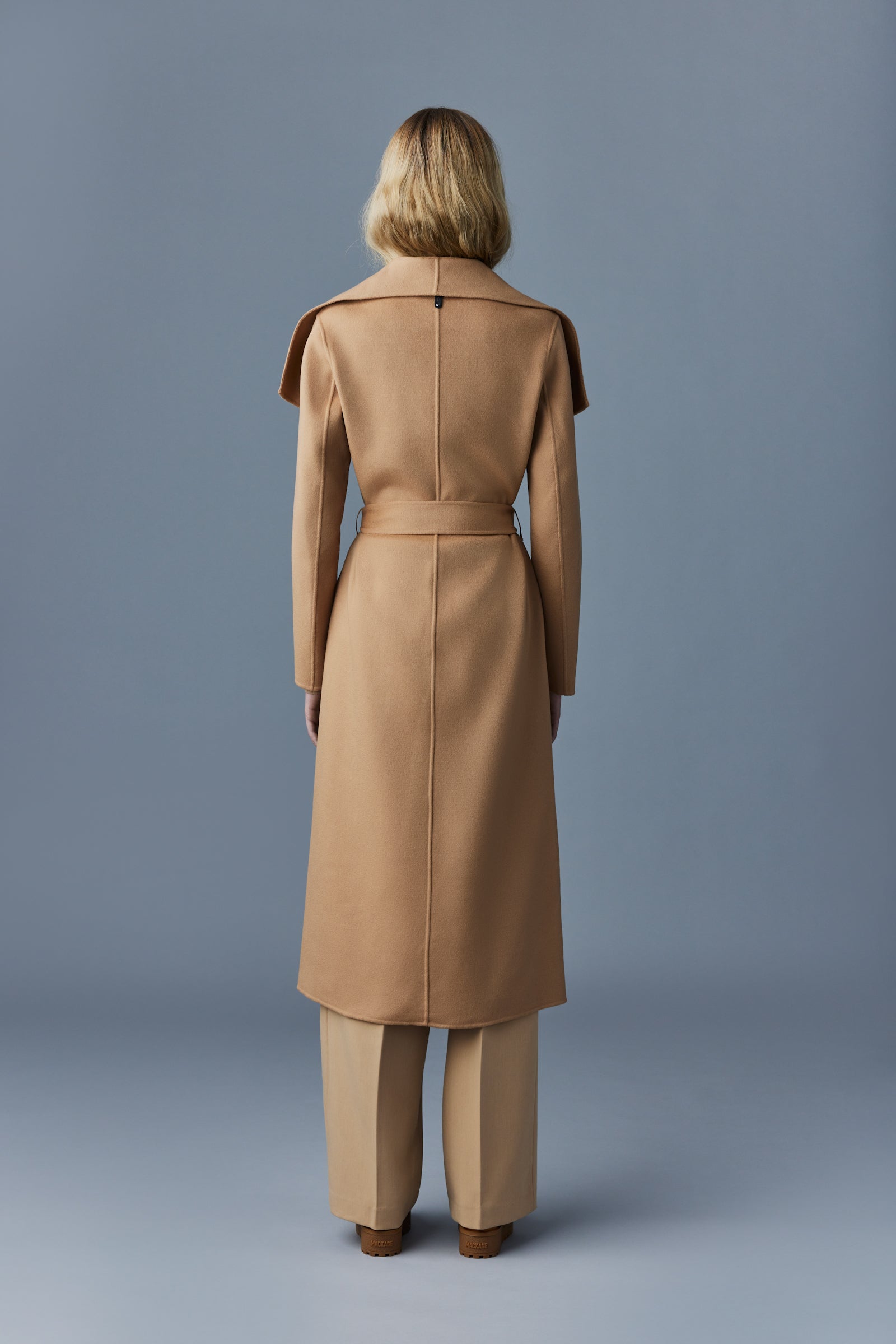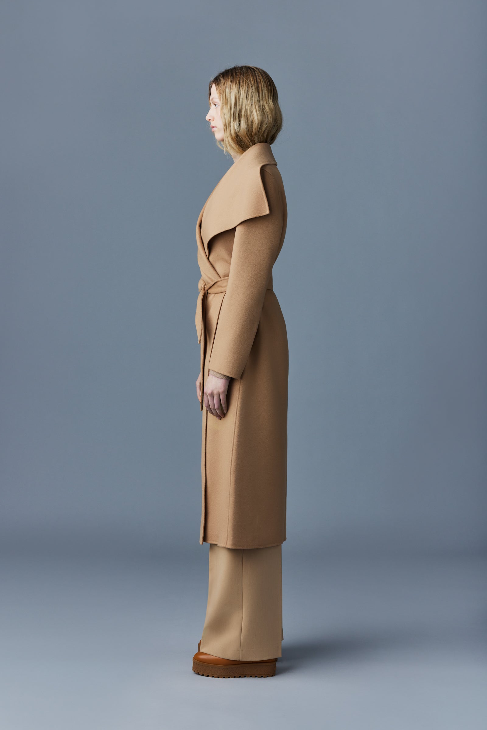 MAI est un long manteau cache-cœur confectionné à la main en laine double face responsable. Ultra doux et non doublé, il présente une coupe décontractée et un drapé fluide. Défini par un col cascade, la ceinture ceinture en cuir se noue à la taille pour plus de chaleur. La soudure en cuir (R) ajoute du contraste aux poches de la taille et aux passants de la ceinture.