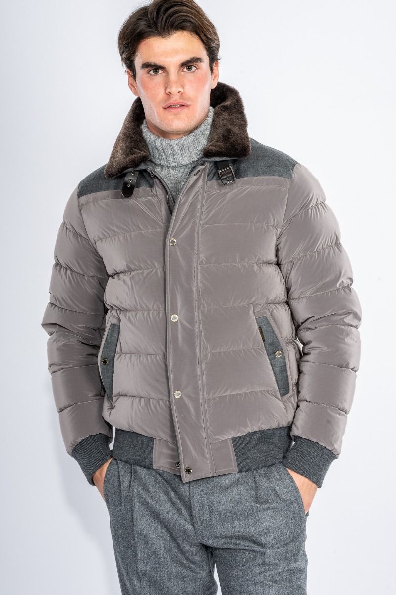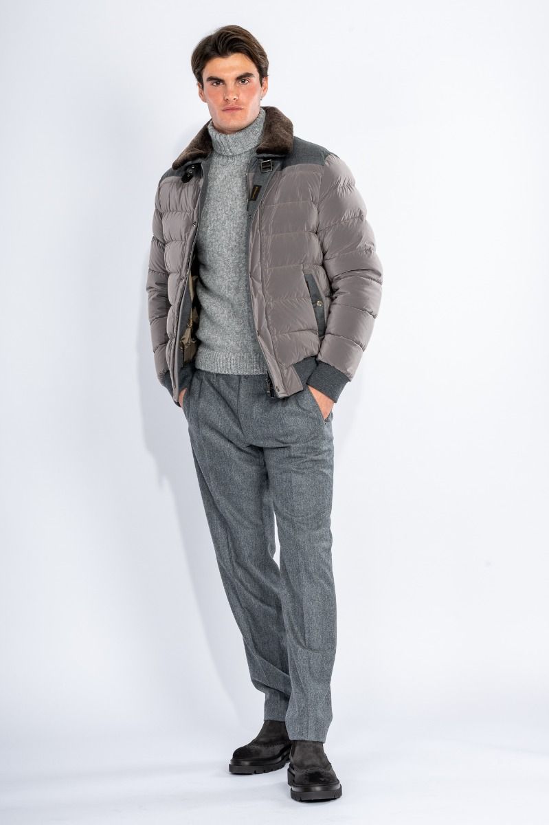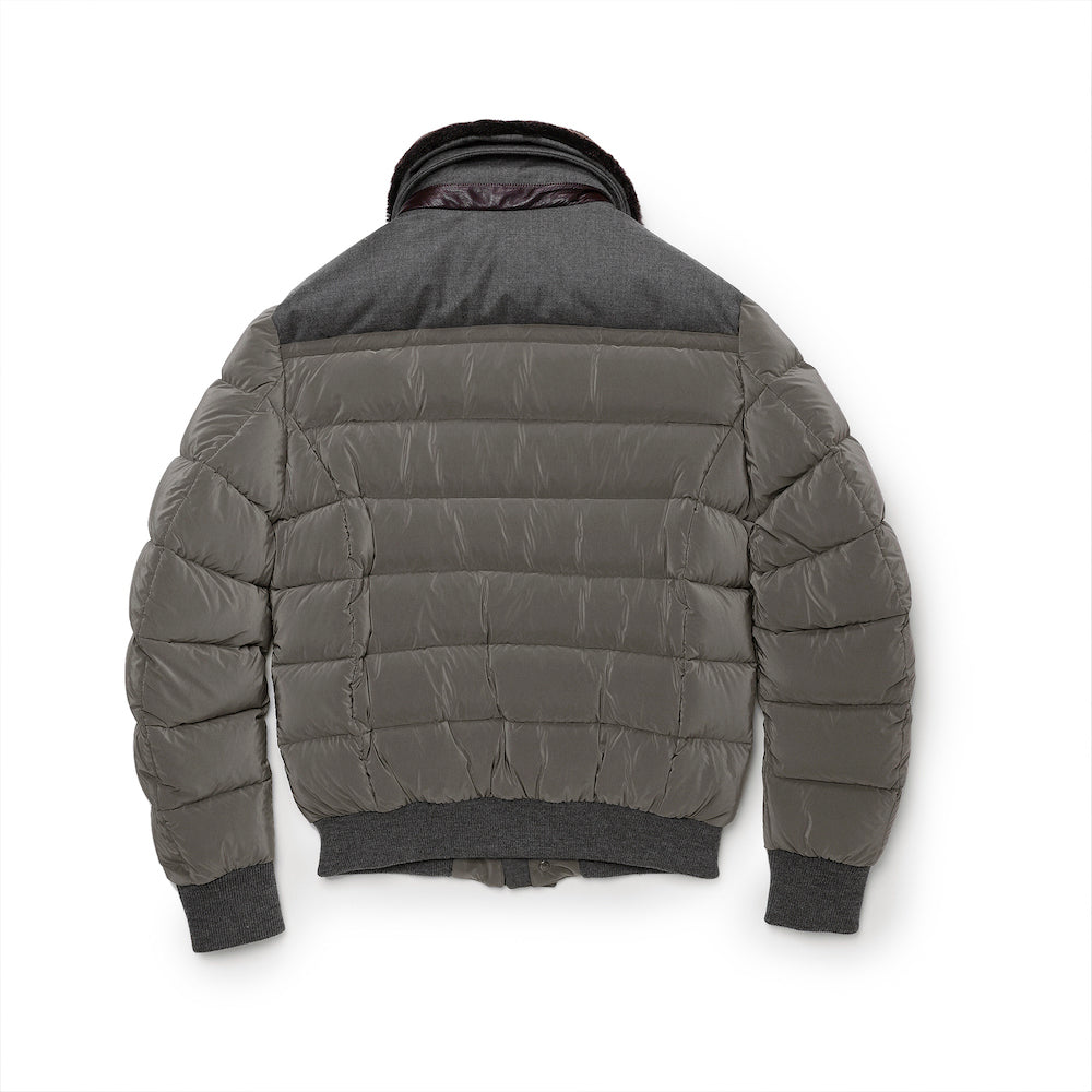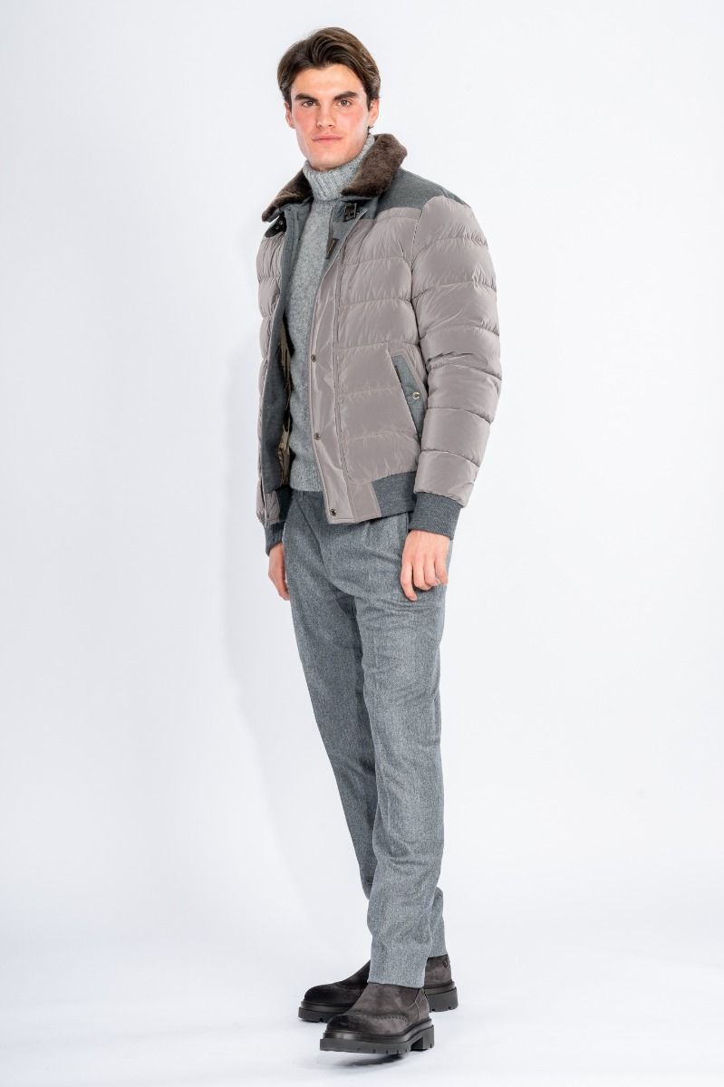 Bomber hybride rembourré de duvet d'oie matelassé à boudins, fabriqué à partir d'un mélange de membrane imperméable, de flanelle de laine et de microfibre mate. Double fermeture sur le devant avec des boutons-pression visibles et une attache en cuir avec boucle sur le col. Ourlets et poignets en maille. Poches avec fermeture par boutons-pression apparents et finition antiquaire typique du denimwear. Poches à documents à l’intérieur et ruban décoratif avec logo.