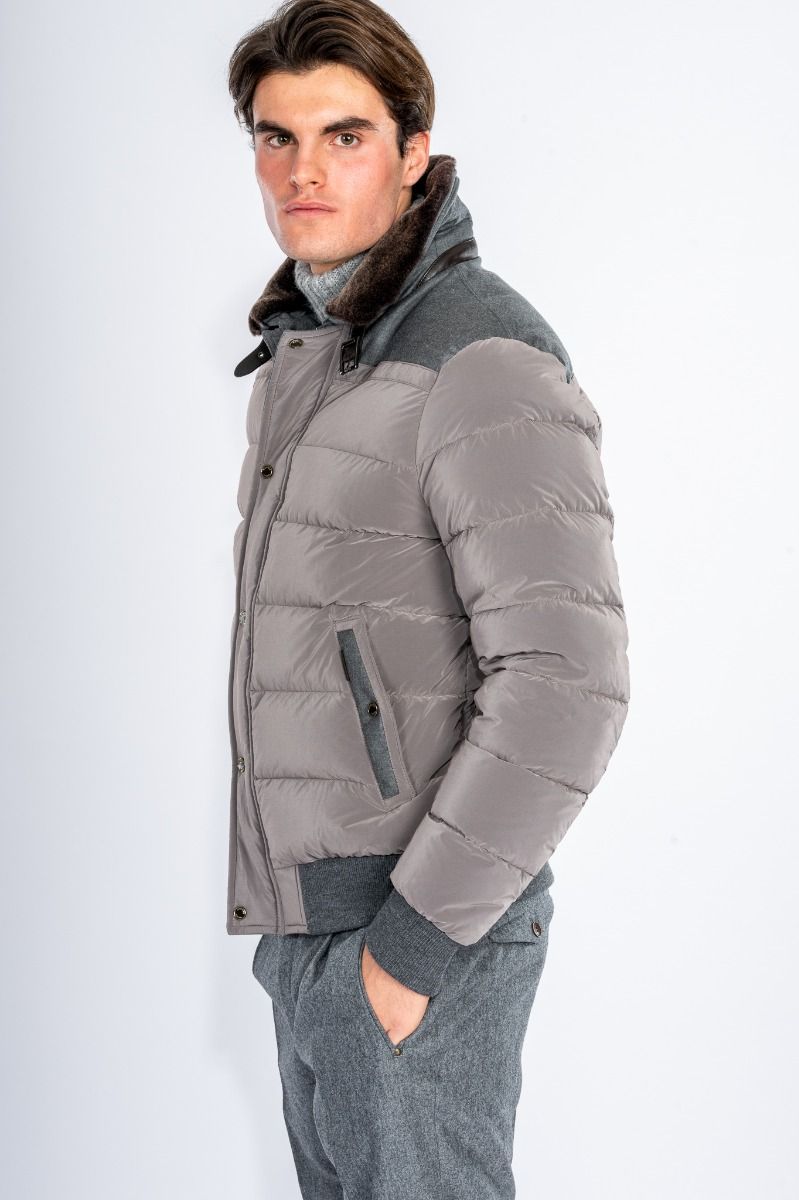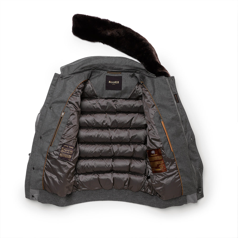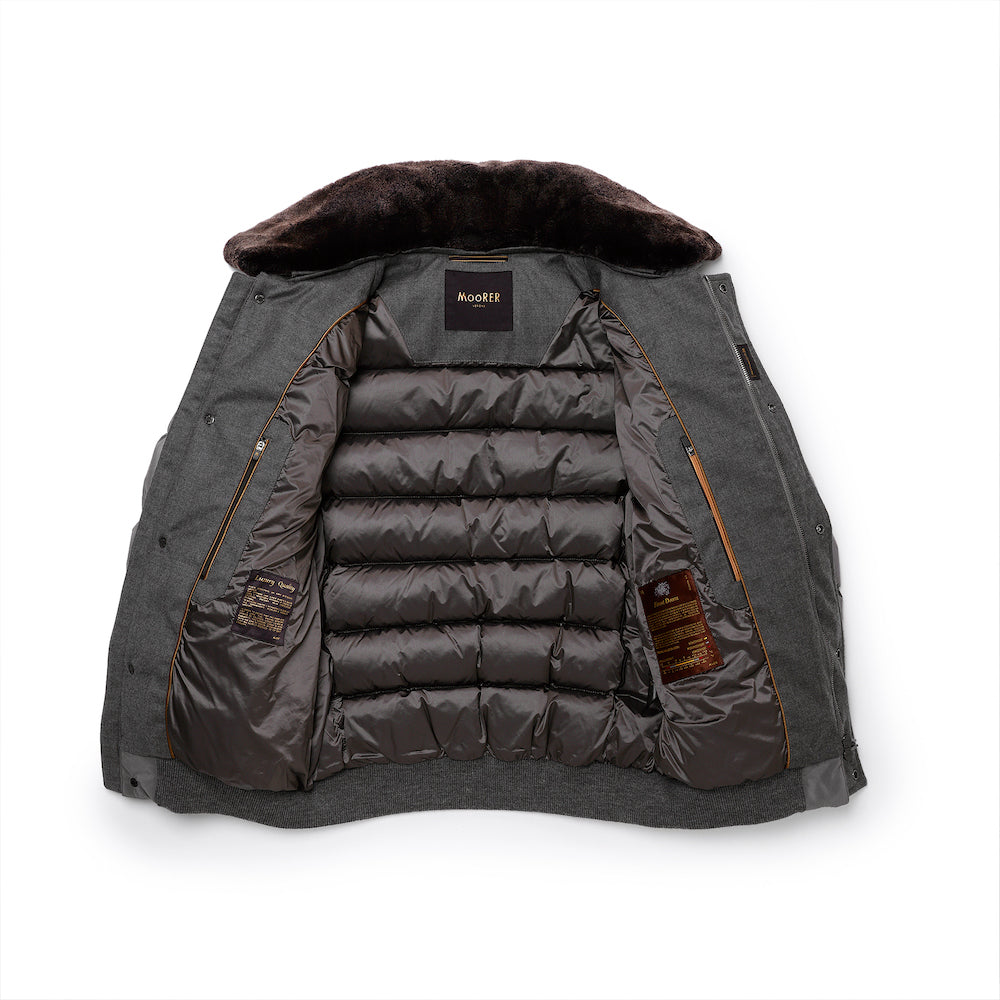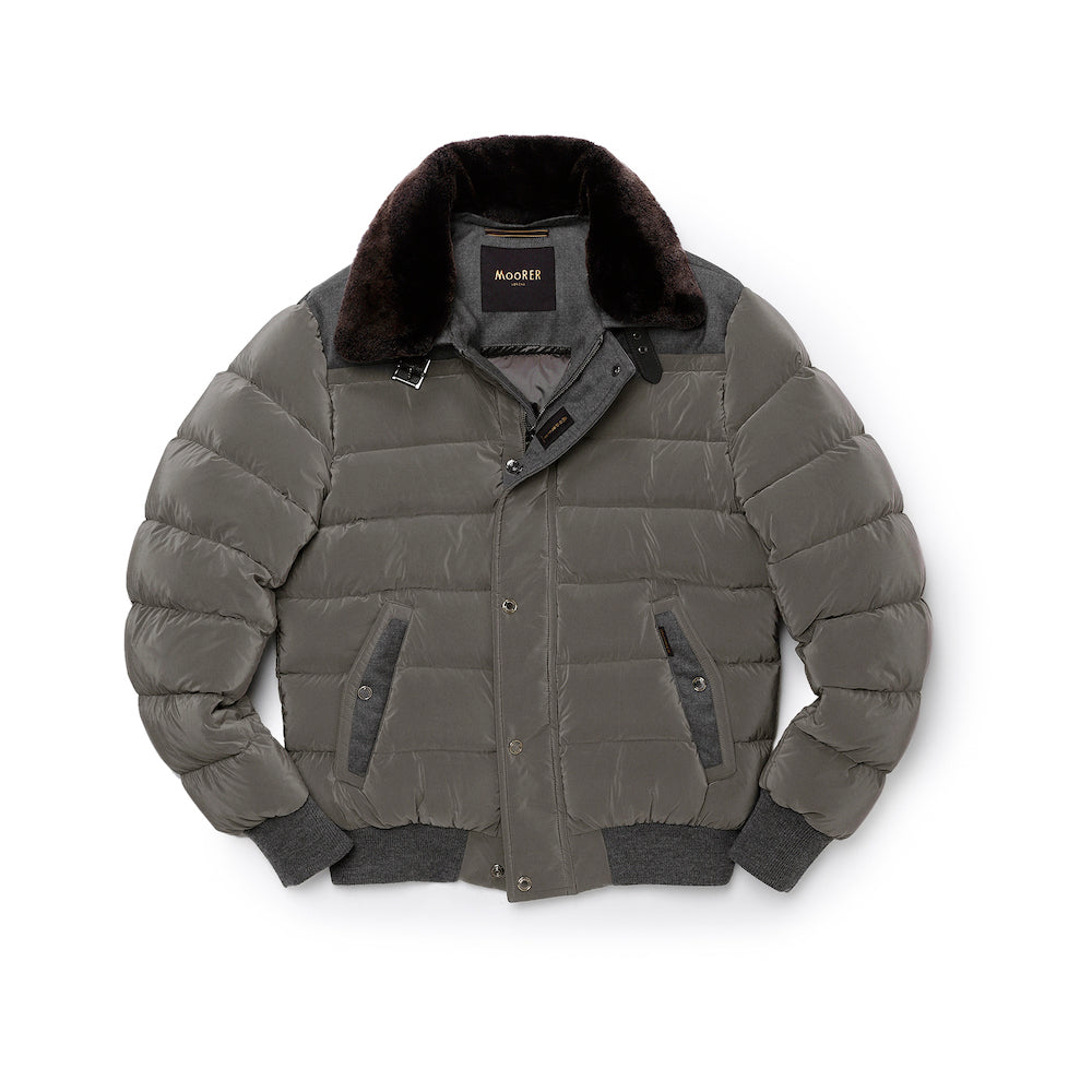 Bomber hybride rembourré de duvet d'oie matelassé à boudins, fabriqué à partir d'un mélange de membrane imperméable, de flanelle de laine et de microfibre mate. Double fermeture sur le devant avec des boutons-pression visibles et une attache en cuir avec boucle sur le col. Ourlets et poignets en maille. Poches avec fermeture par boutons-pression apparents et finition antiquaire typique du denimwear. Poches à documents à l’intérieur et ruban décoratif avec logo.