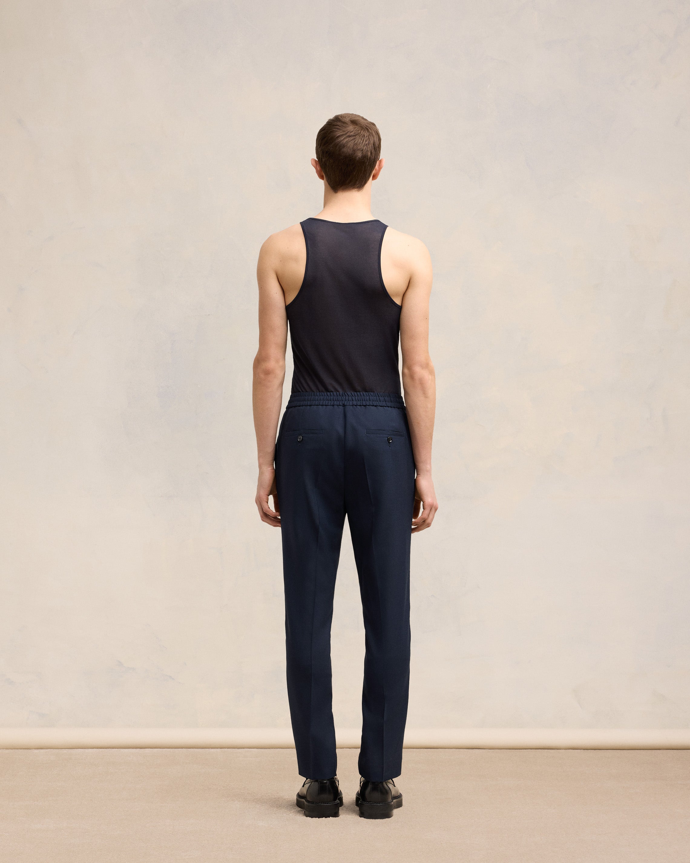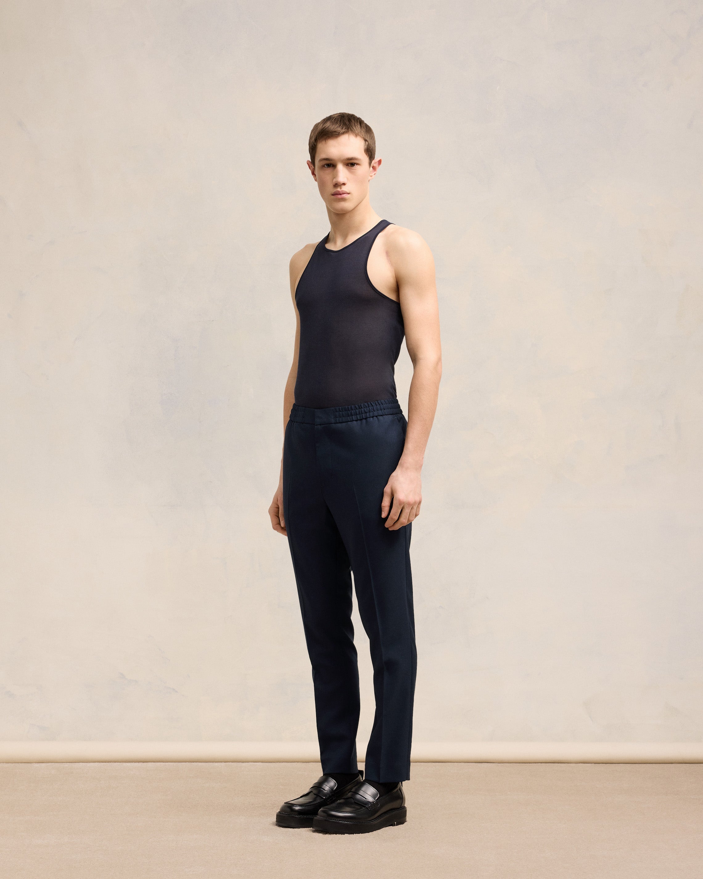 Pantalon taille élastiquée en toile de laine.