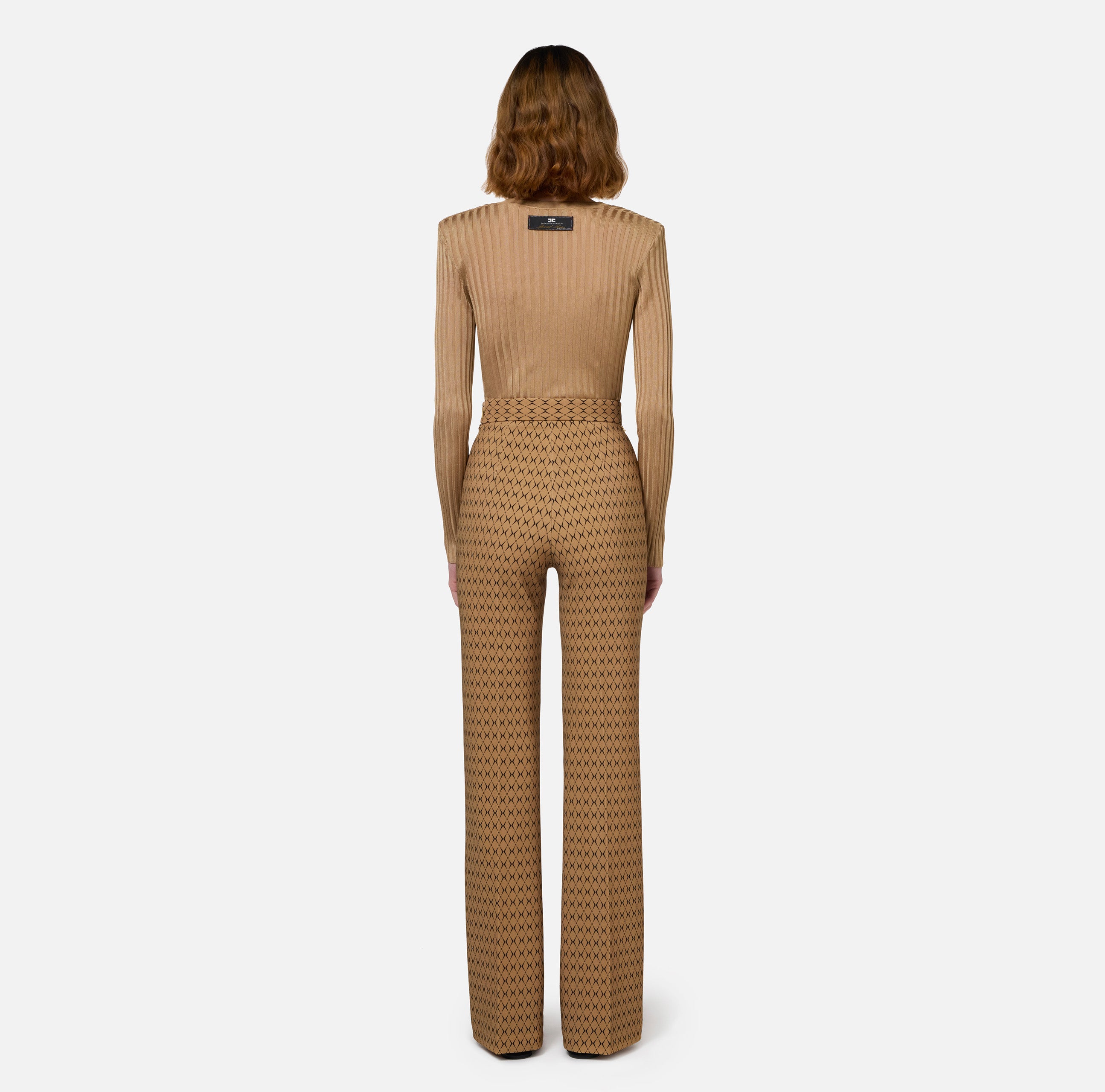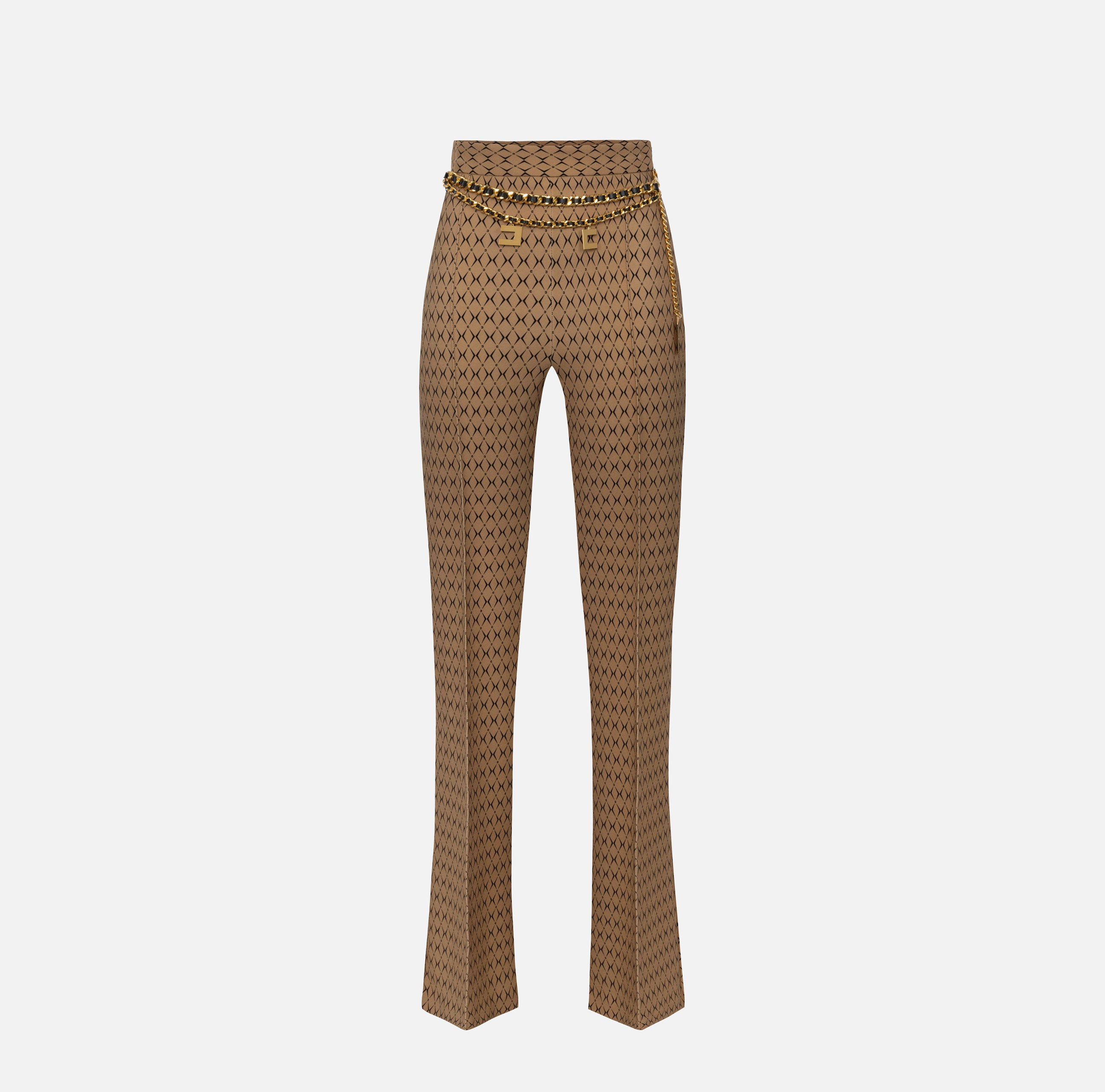 Pantalon palazzo en double crêpe stretch imprimé losange. La taille est soulignée par une ceinture en chaîne enfilée et des breloques logo en métal doré.