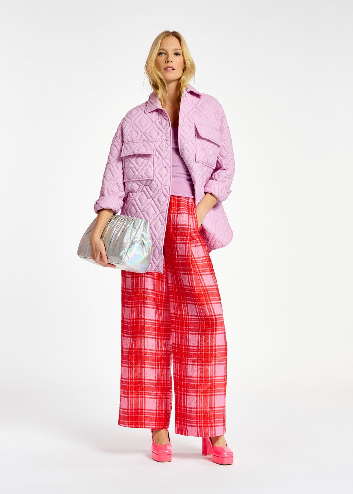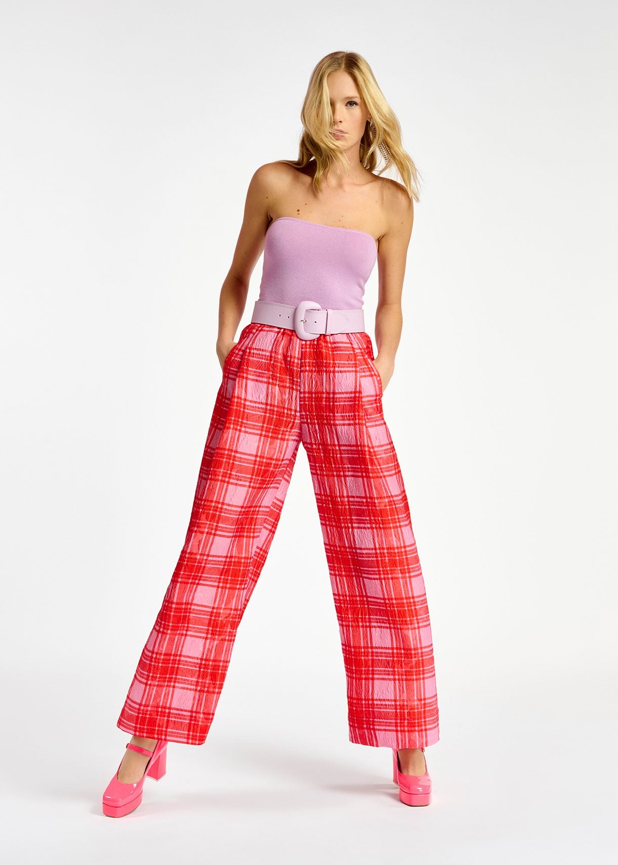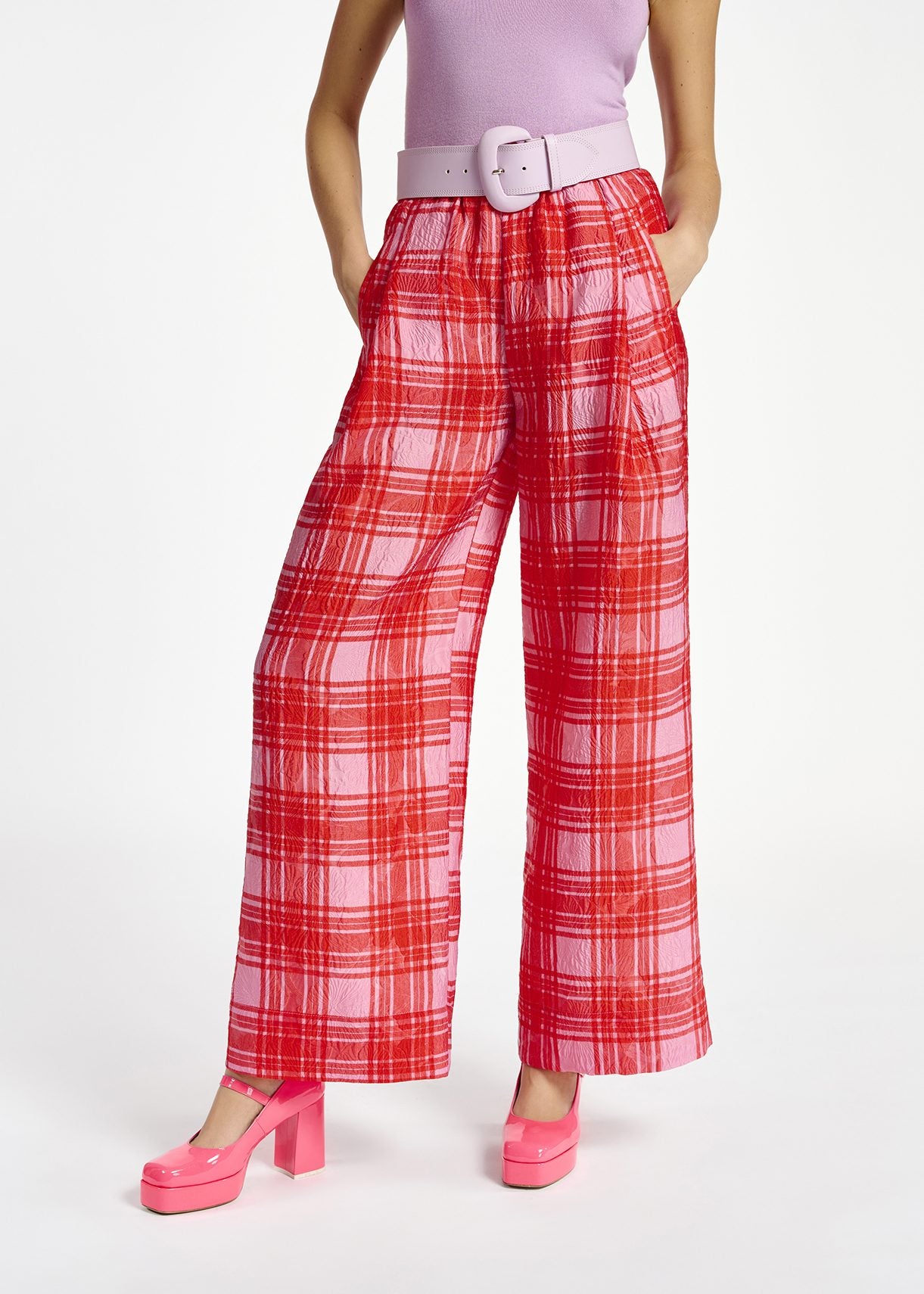 Pantalon large rose à carreaux rouges Essentiel