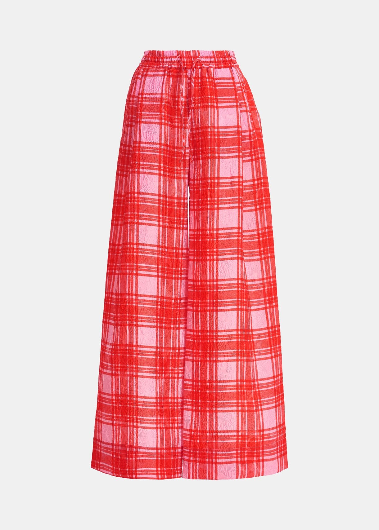 Orné d'un motif à carreaux de couleur vive, ce pantalon aux jambes larges est réalisé dans un tissu jacquard fleuri qui brille dans la lumière. Il est doté d'une taille élastique qui est aussi confortable que flatteuse.
