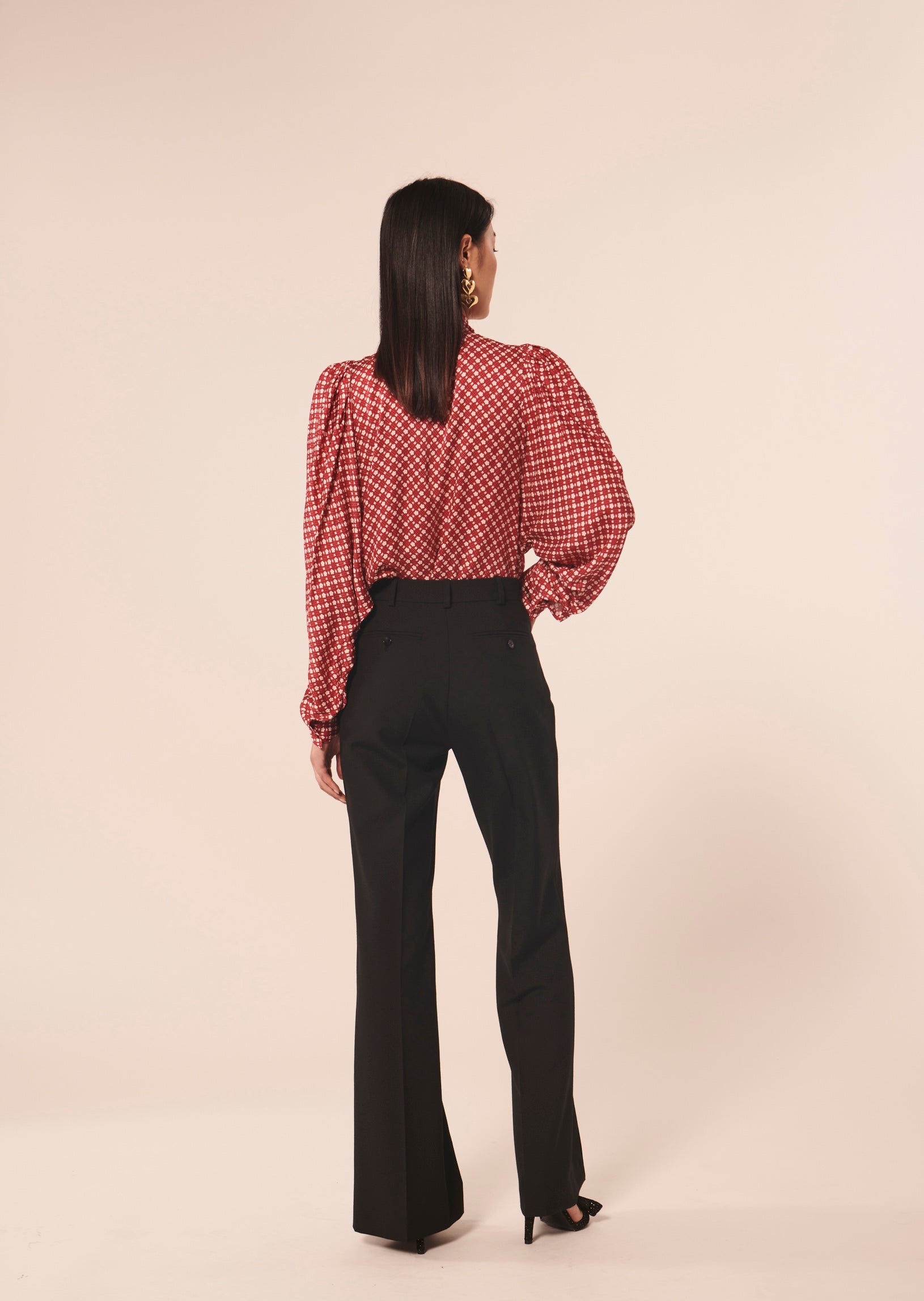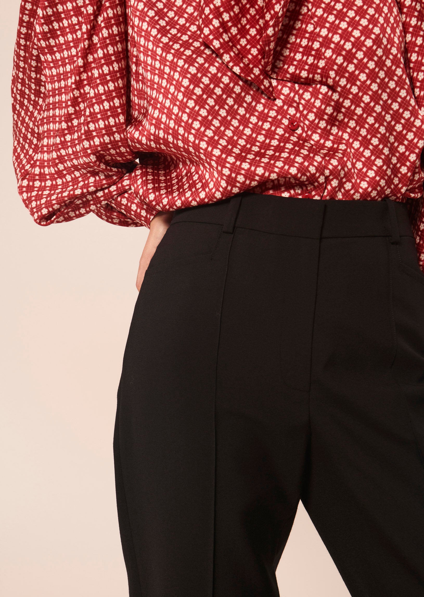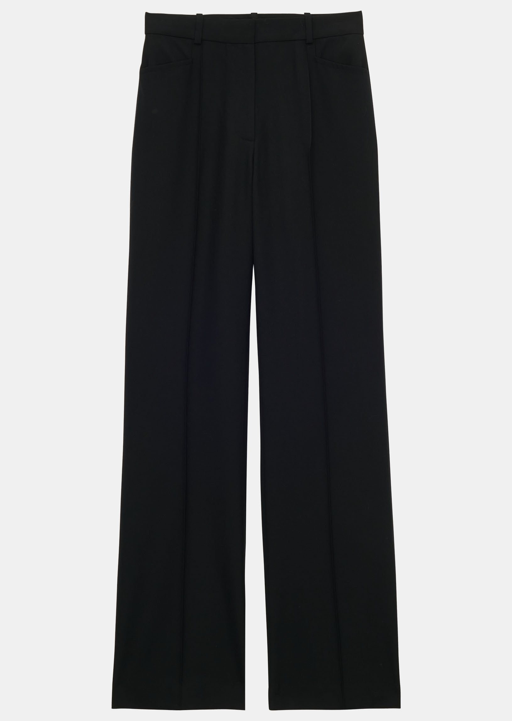 Ce pantalon de tailleur noir a une taille haute et une coupe droite avec un léger évasement dans le bas. Il présente des passants de ceinture et des plis plats. Fermeture à crochet et à glissière. Deux poches latérales et deux poches passepoilées au dos. Existe également en bleu nuit à rayures.