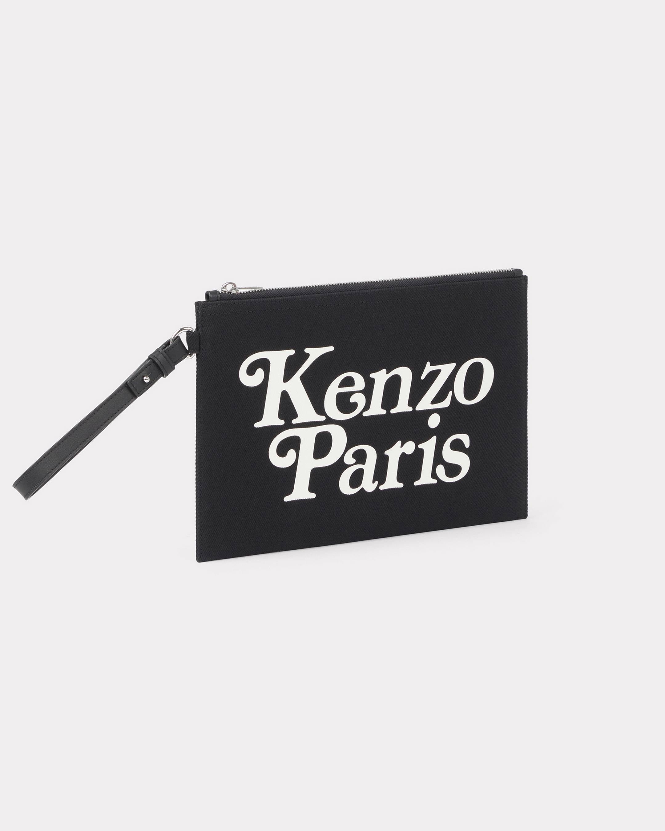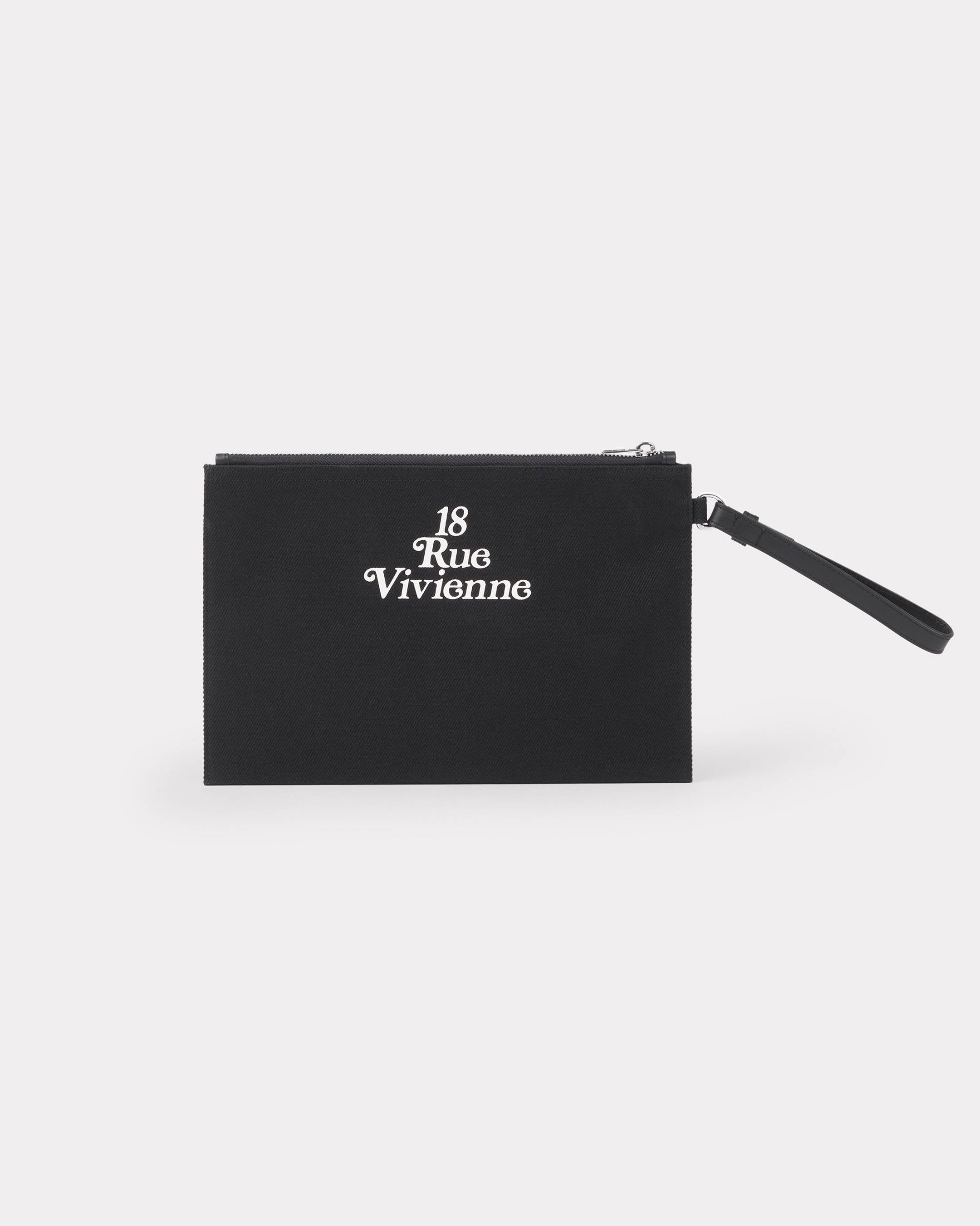 Cette pochette s'orne du logo ‘KENZO Paris’ signé par l’artiste japonais Verdy devant et de l'imprimé '18 Rue Vivienne' au dos. Son grand format permet de ranger l’essentiel du quotidien. Sa dragonne s’enlève et se fixe au gré des envies.