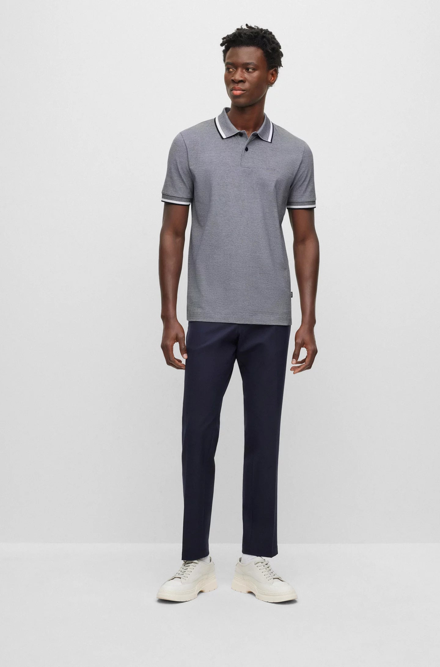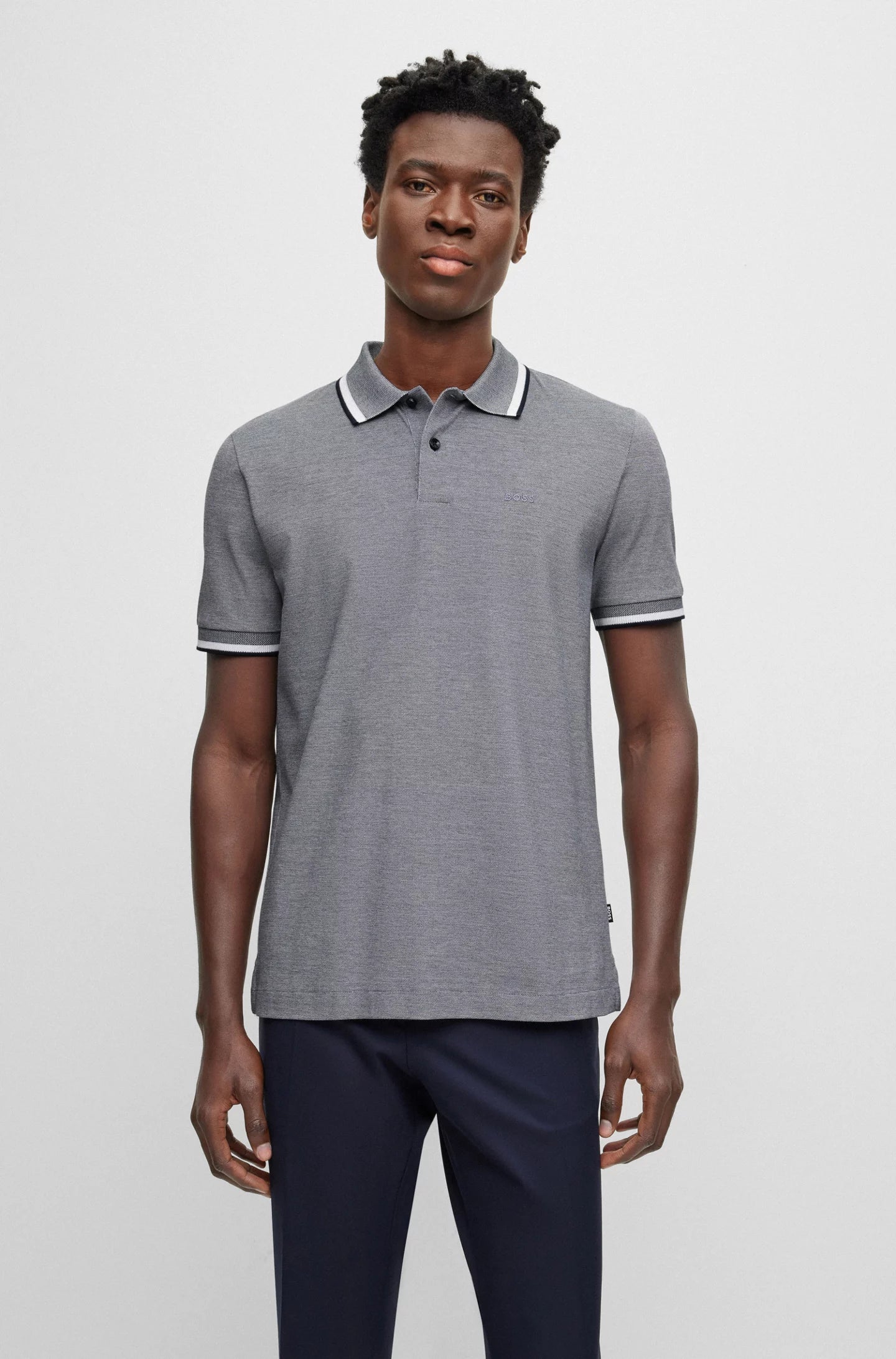 Un polo BOSS Homme prêt pour l'été. Habilement confectionné en piqué oxford bicolore en pur coton, ce polo de coupe régulière présente une texture et des bordures contrastées au col et aux poignets. Un logo cousu sur la poitrine gauche complète ce haut à manches courtes.