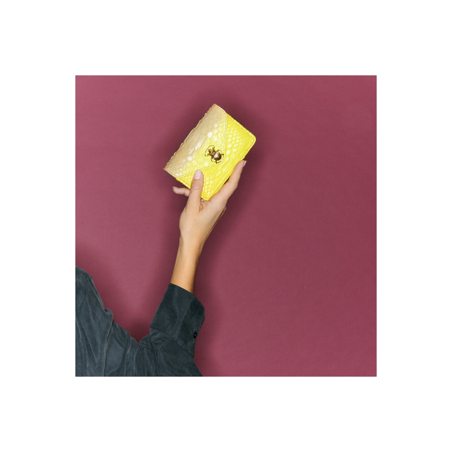Cette petite pochette en python qui prend la forme d'une enveloppe est ornée d'un fermoir en forme de scarabée en laiton. Parfaite pour garder tous vos petits papiers et votre monnaie grâce à ses différents compartiments, elle se glissera facilement dans tous vos sacs.