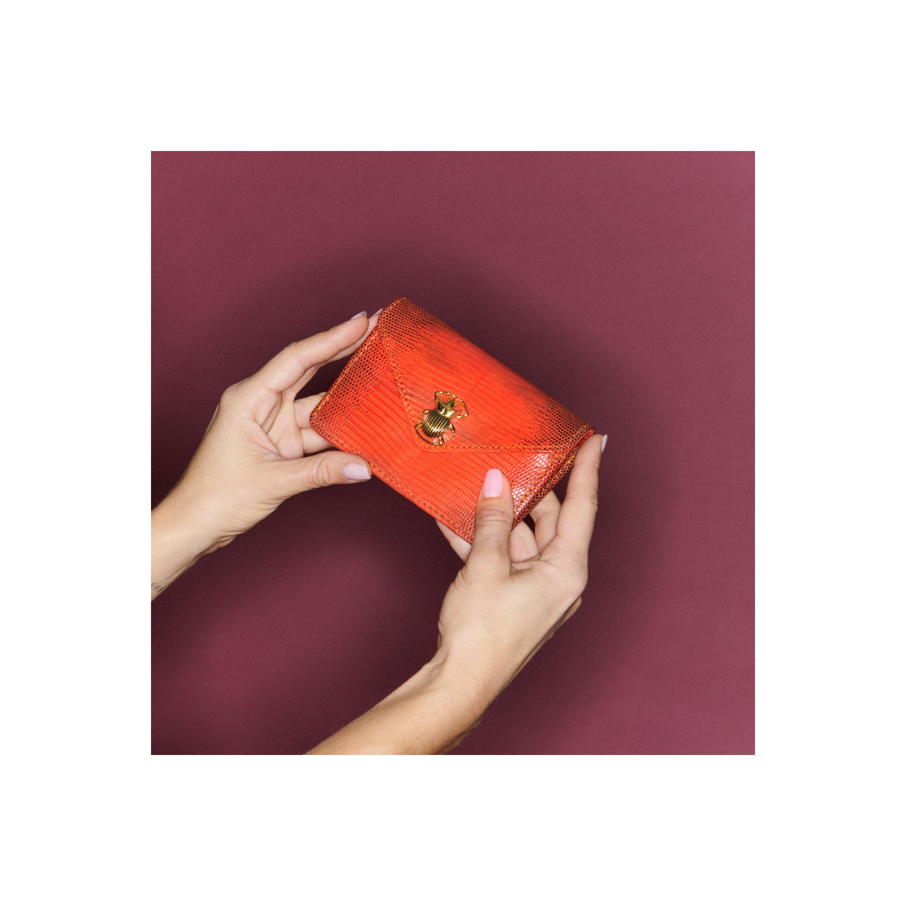 Cette petite pochette en lézard qui prend la forme d'une enveloppe est ornée d'un fermoir en forme de scarabée en laiton. Parfaite pour garder tous vos petits papiers et votre monnaie grâce à ses différents compartiments, elle se glissera facilement dans tous vos sacs.