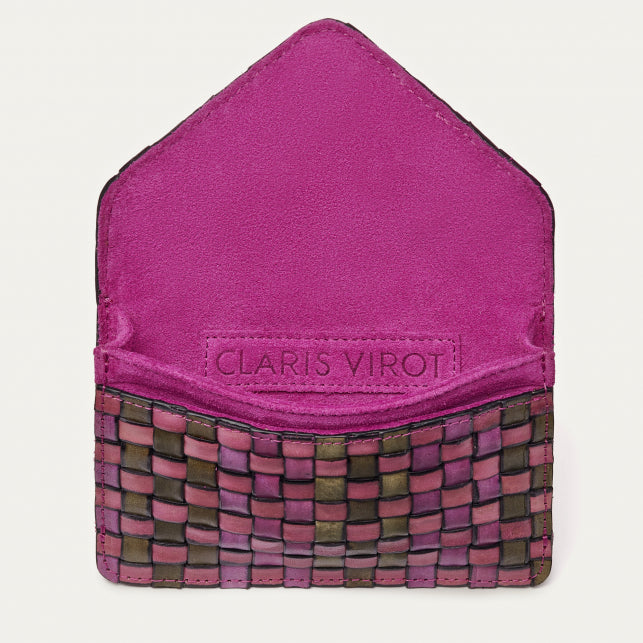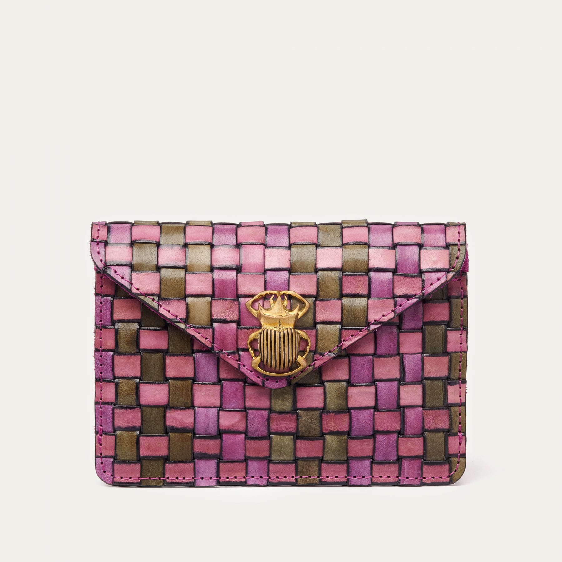 Notre porte-carte Alex en cuir tressé prend la forme d'une enveloppe. Il est composé de deux compartiments, et il est orné d'un fermoir en forme de scarabée, en laiton. Parfait pour garder tous vos petits papiers, vos cartes et même votre monnaie, Alex se glissera facilement dans tous vos sacs à main.