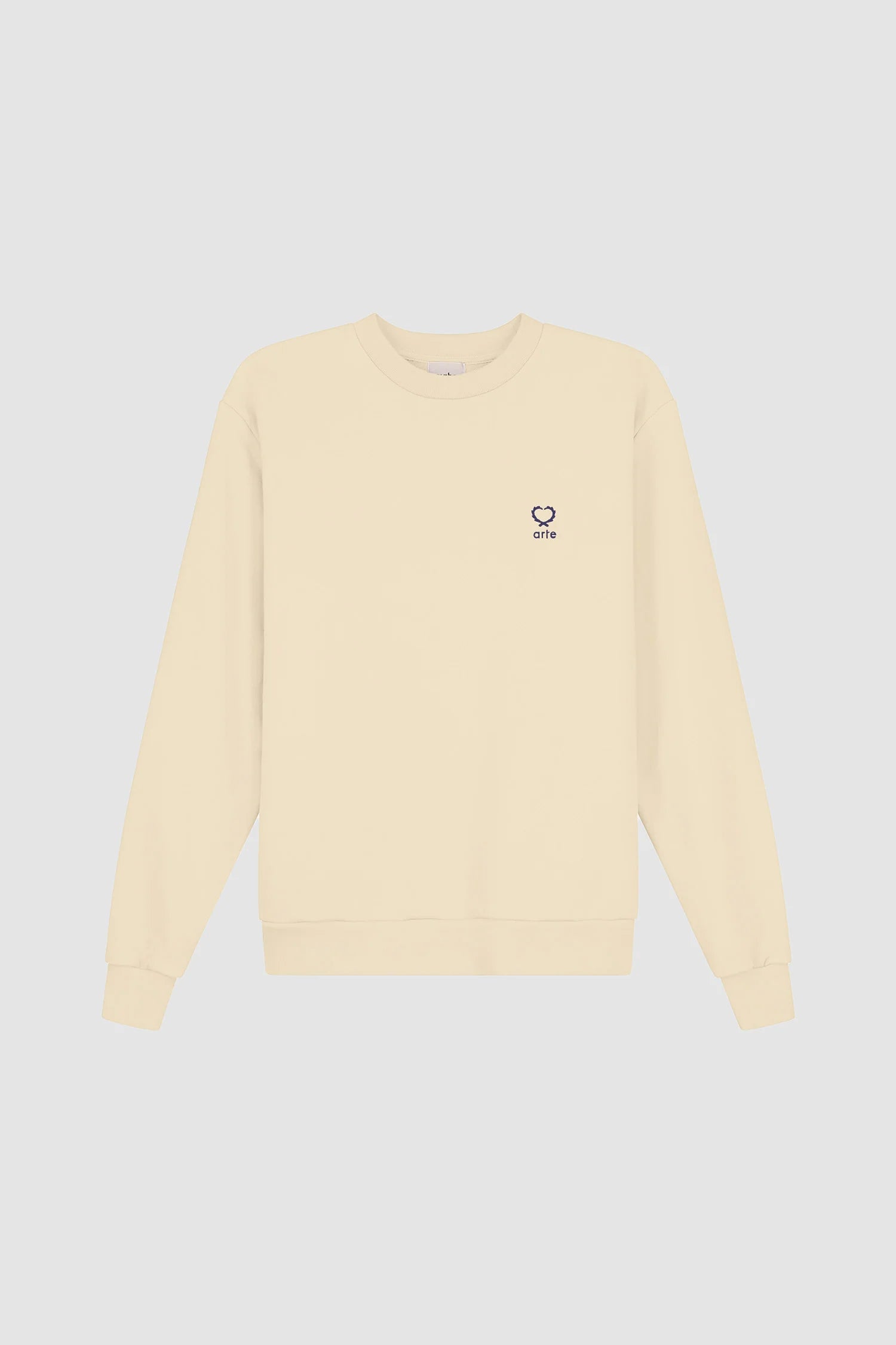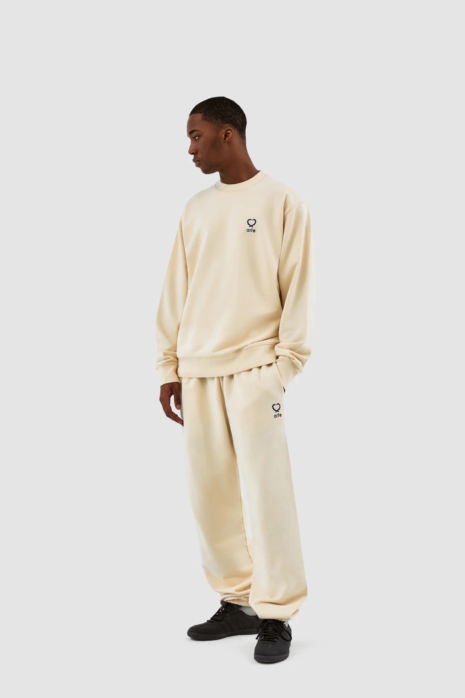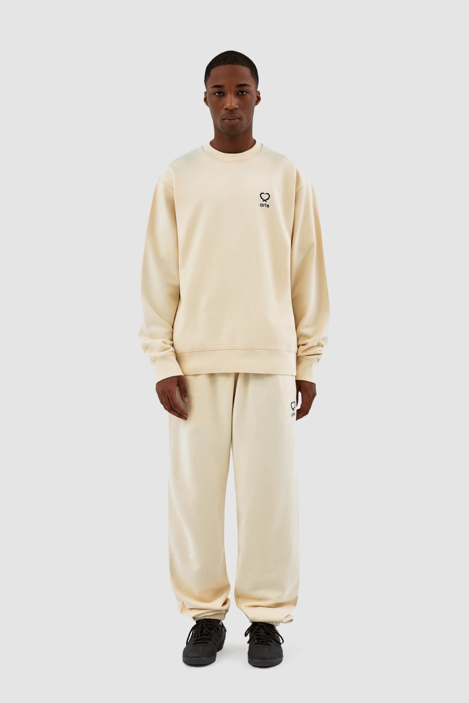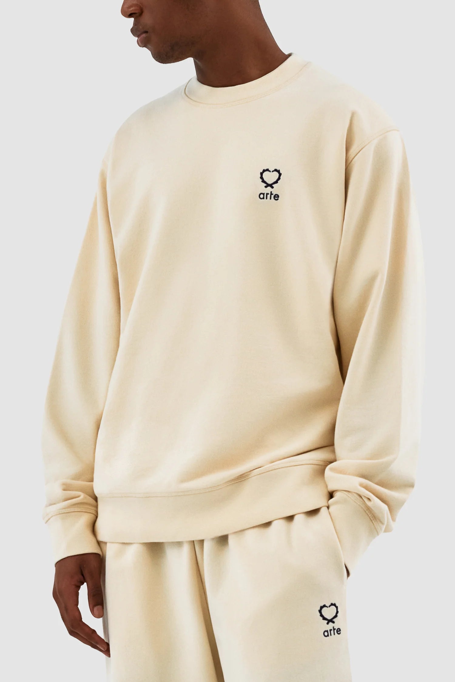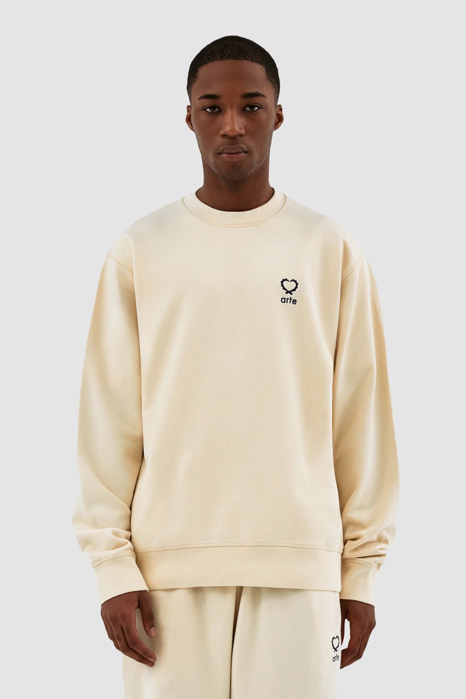 Le modèle Carlos Small Heart Crewneck en crème est un basique polyvalent de la garde-robe. Il présente la version de cette saison du logo en forme de cœur caractéristique d'Arte. Le logo est brodé en noir sur le côté gauche de la poitrine. Fabriqué en coton épais de première qualité, ce col ras du cou présente une encolure légèrement plus haute et une coupe confortable et décontractée, complétée par des bordures côtelées.