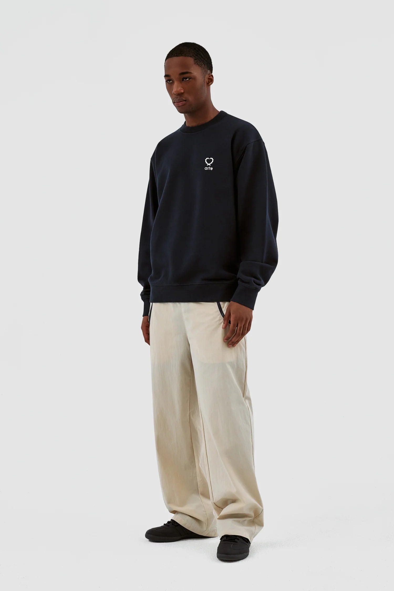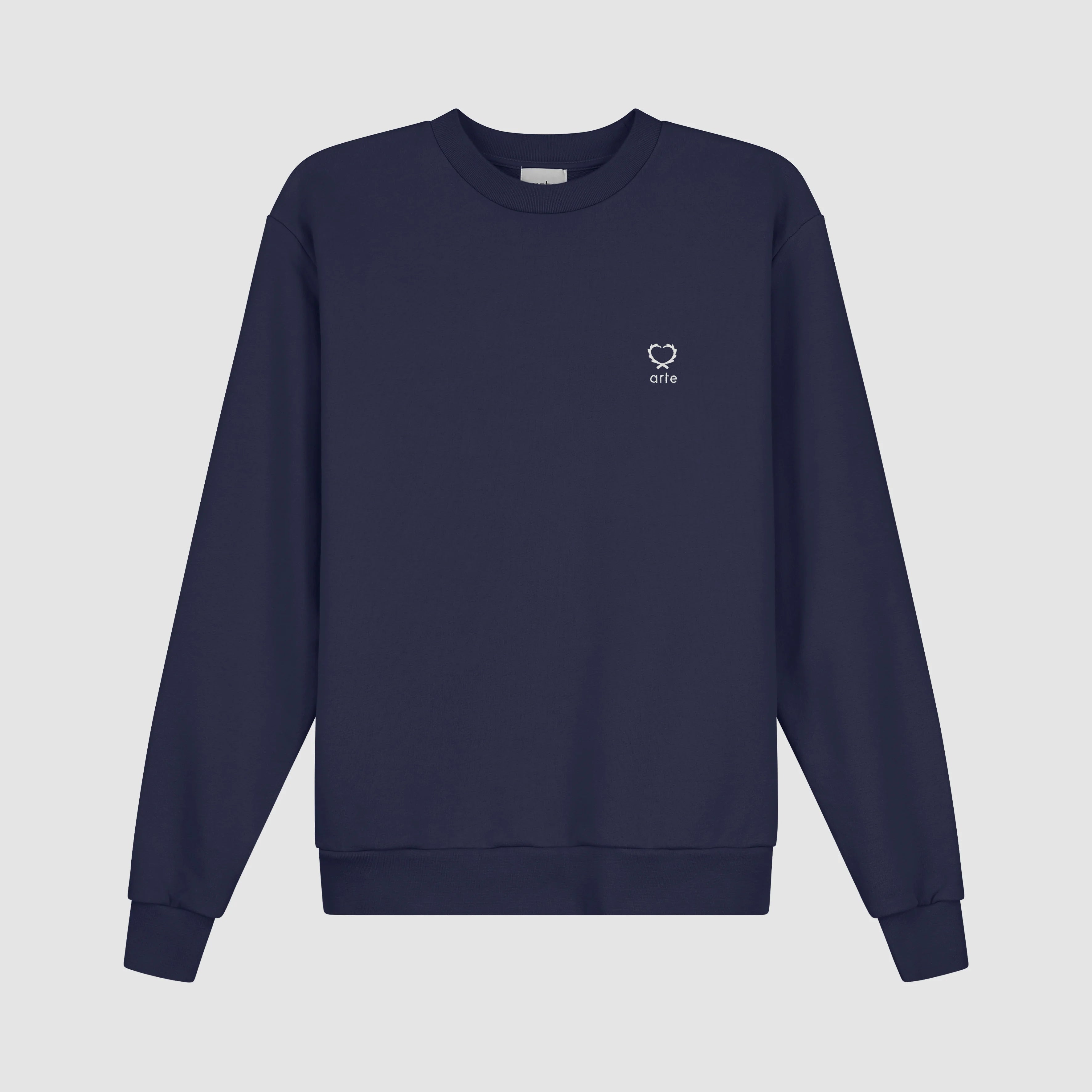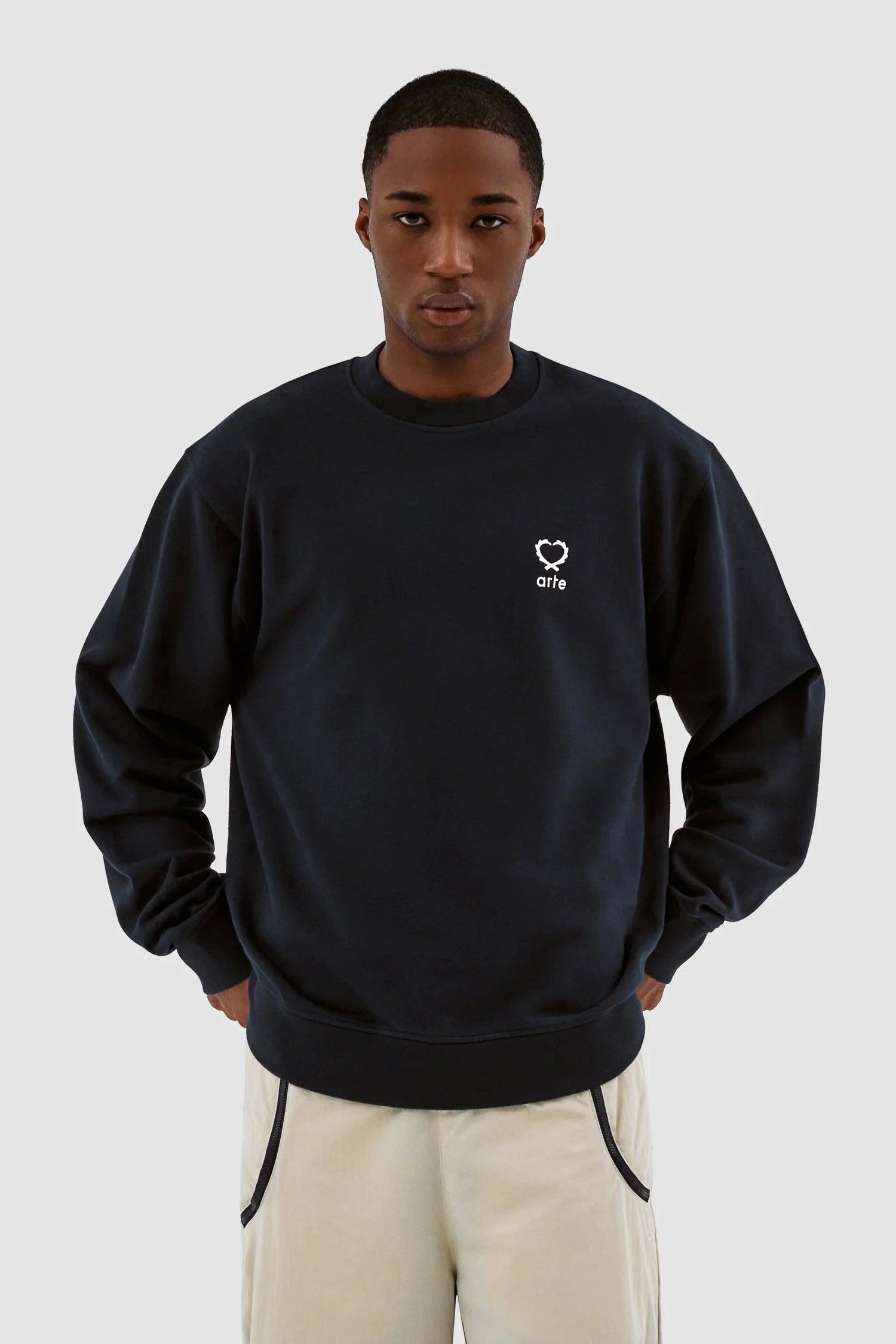 Le modèle Carlos Small Heart Crewneck en marine est un basique polyvalent de la garde-robe. Il présente la version de cette saison du logo en forme de cœur caractéristique d'Arte. Le logo est embroidered en blanc sur le côté gauche de la poitrine. Fabriqué en coton épais de première qualité, ce col ras du cou présente une encolure légèrement plus haute et une coupe confortable et décontractée, complétée par des bordures côtelées.