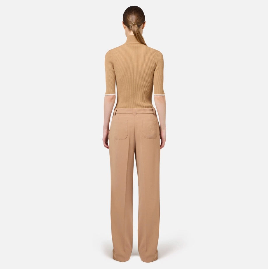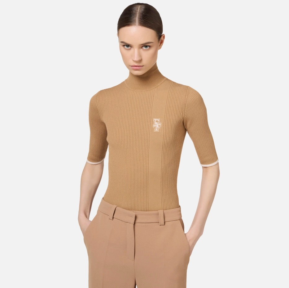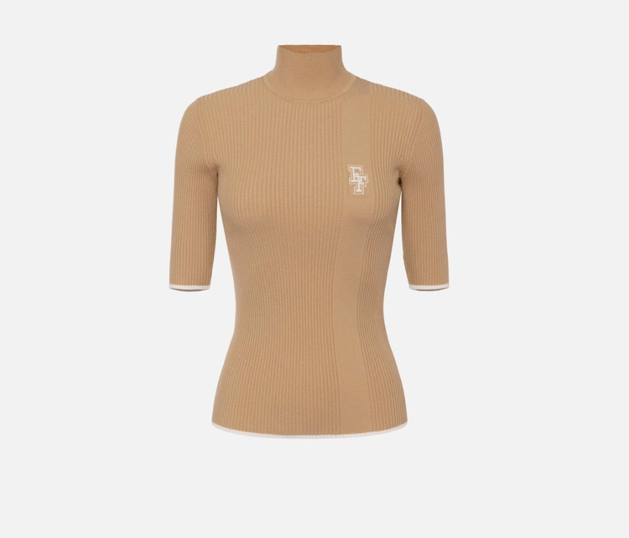 Pull col roulé en mélange de viscose côtelée à manches courtes. Il se caractérise par des profils et un logo incrusté de couleur contrastée.