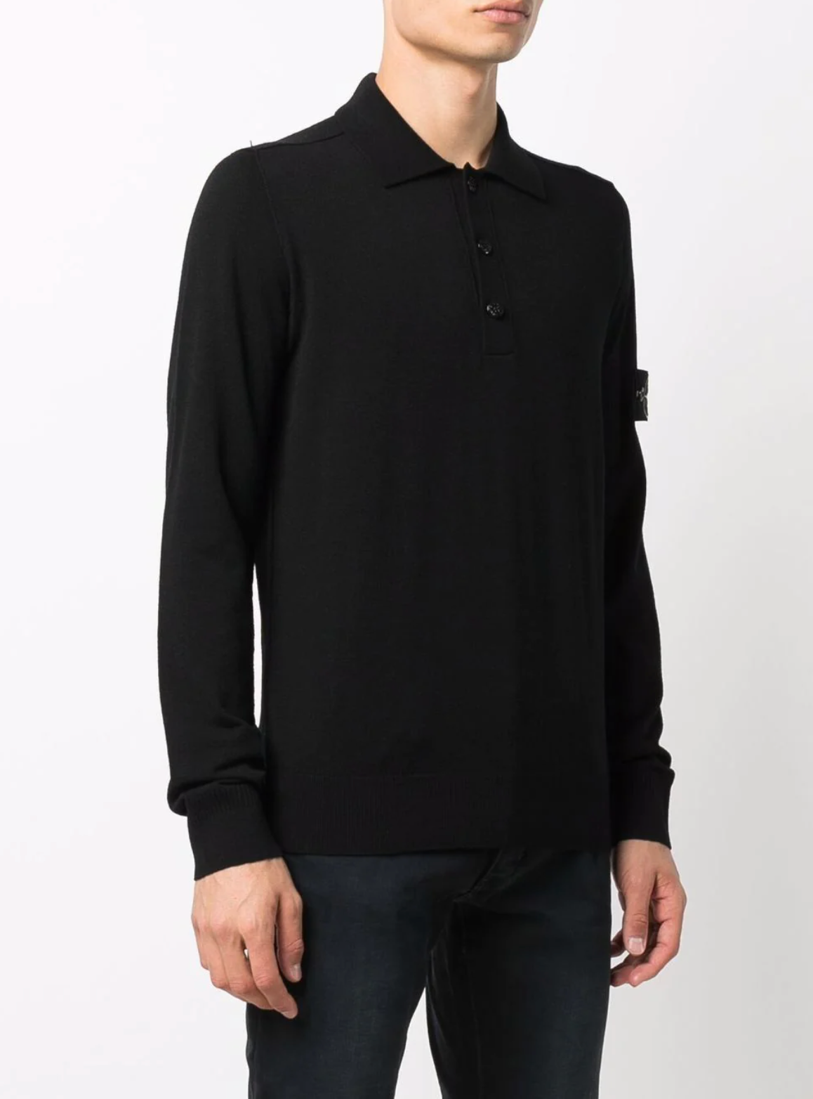 Col côtelé avec fermeture à trois boutons. Très petit passepoil sur les coutures. Deux gammes de côtes aux poignets. Bande inférieure côtelée.