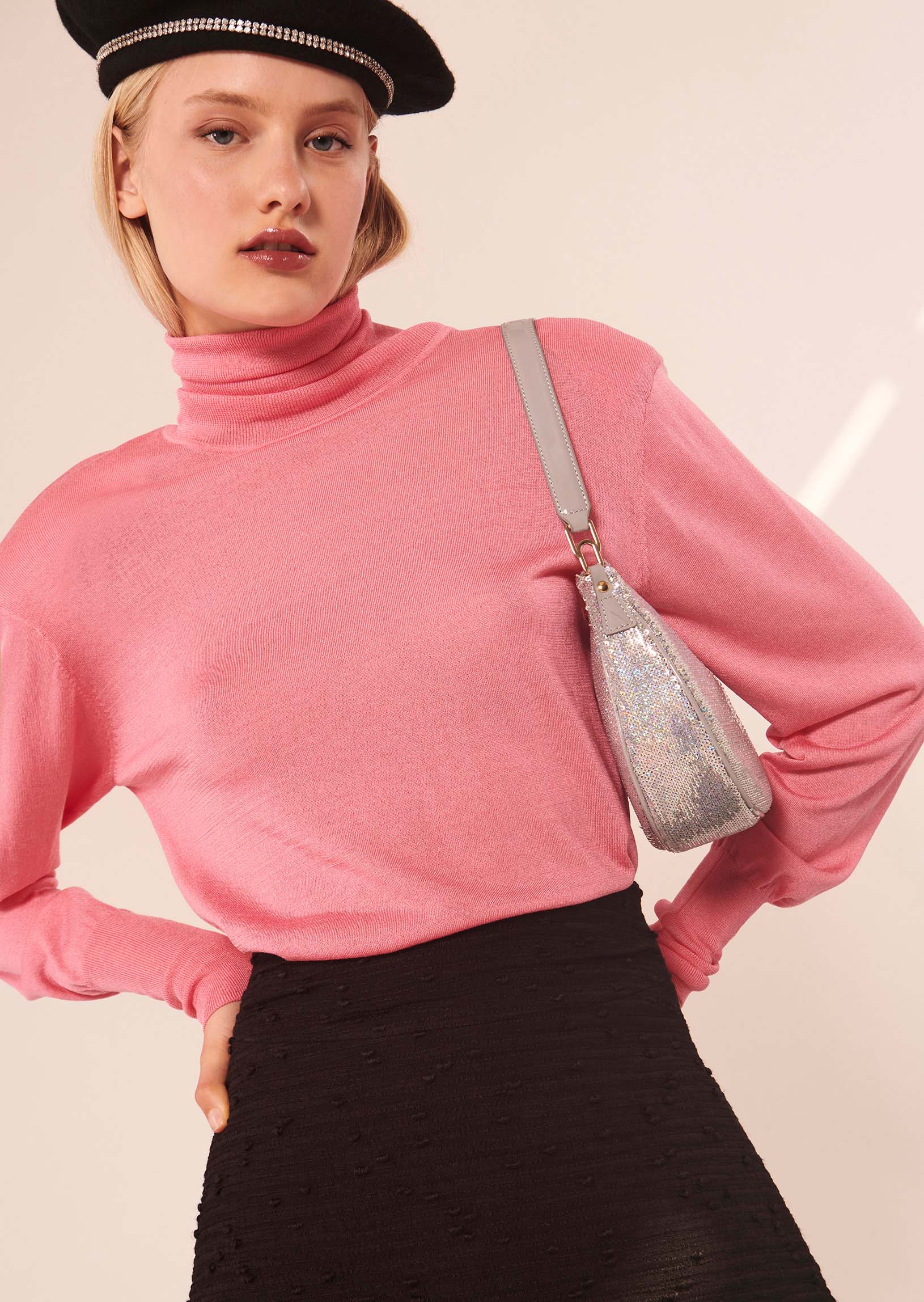Ce pull rose en coton et soie est votre nouvel indispensable de la saison. Avec son col roulé, ses manches longues et son toucher doux, il vous tiendra chaud. Sa particularité : des épaulettes pour une allure élégante et féminine. Existe aussi en noir.