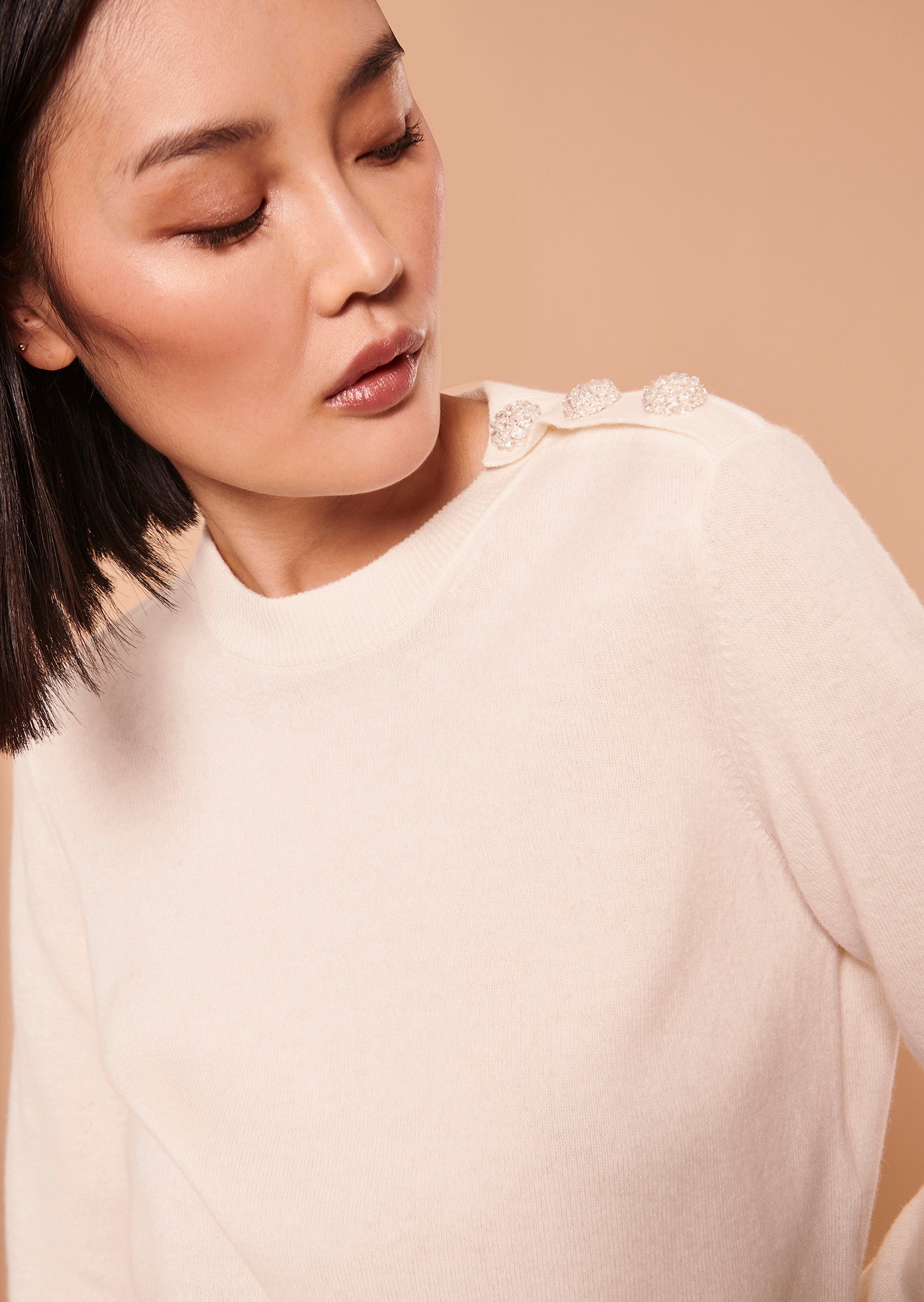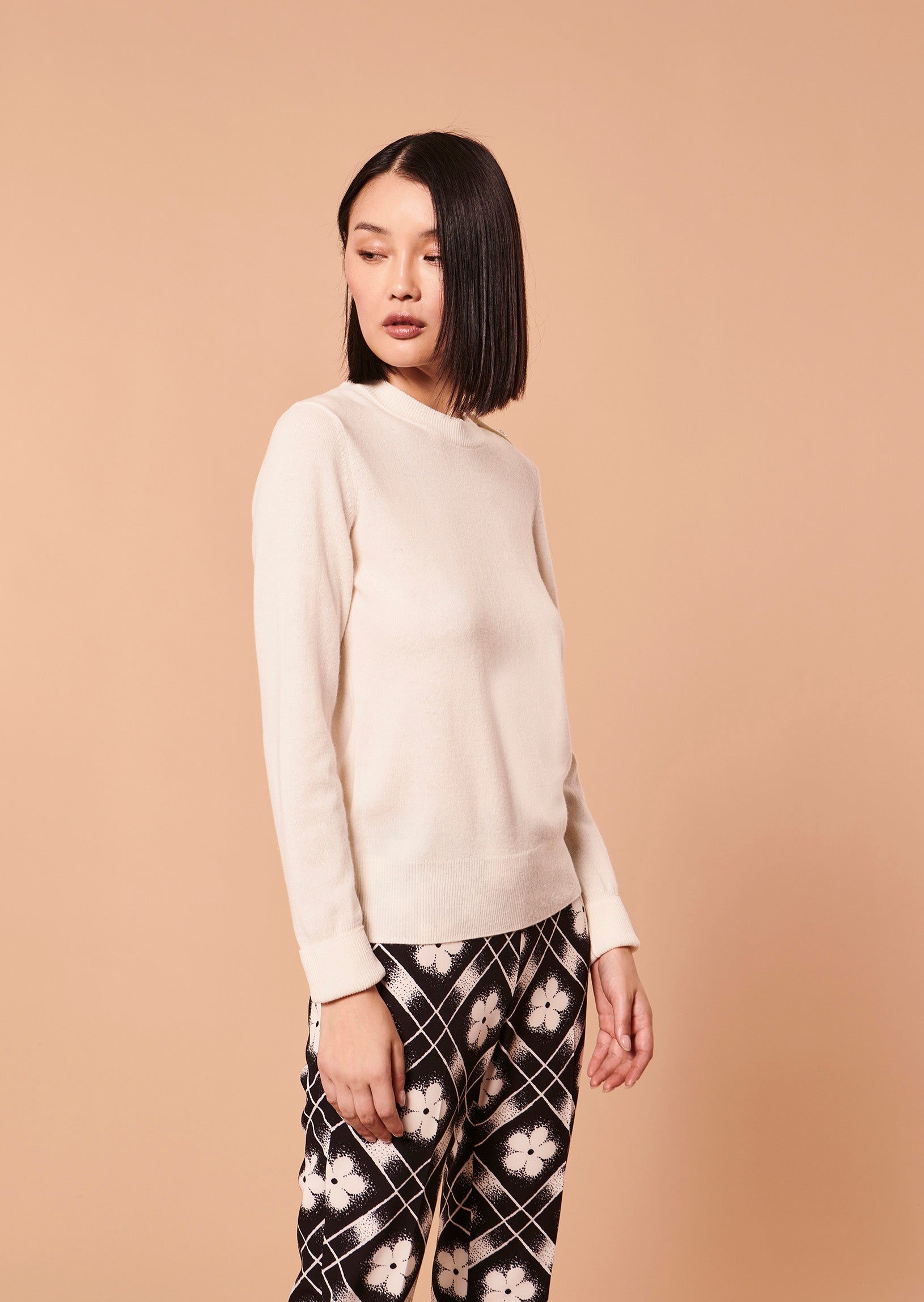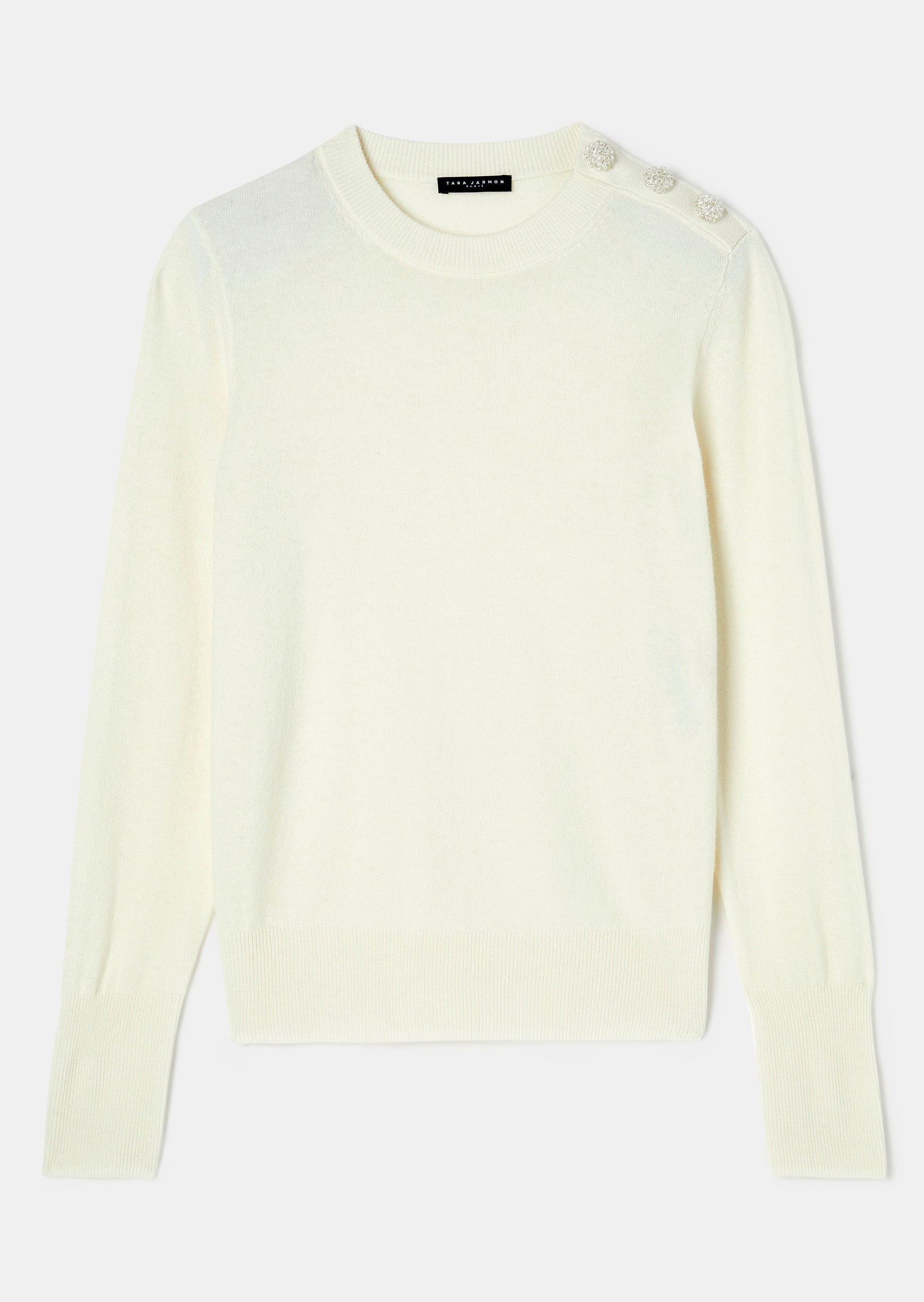 Ce pull-over écru a des manches longues et un col rond. La touche so-Tara est apportée par les boutons bijou sur l'épaule gauche. Il est confectionné en laine douce pour un toucher cachemire ultra-confortable. Idéale pour la saison, sa couleur ultra-brillante vous accompagnera au quotidien. Existe aussi en vert émeraude et en noir.