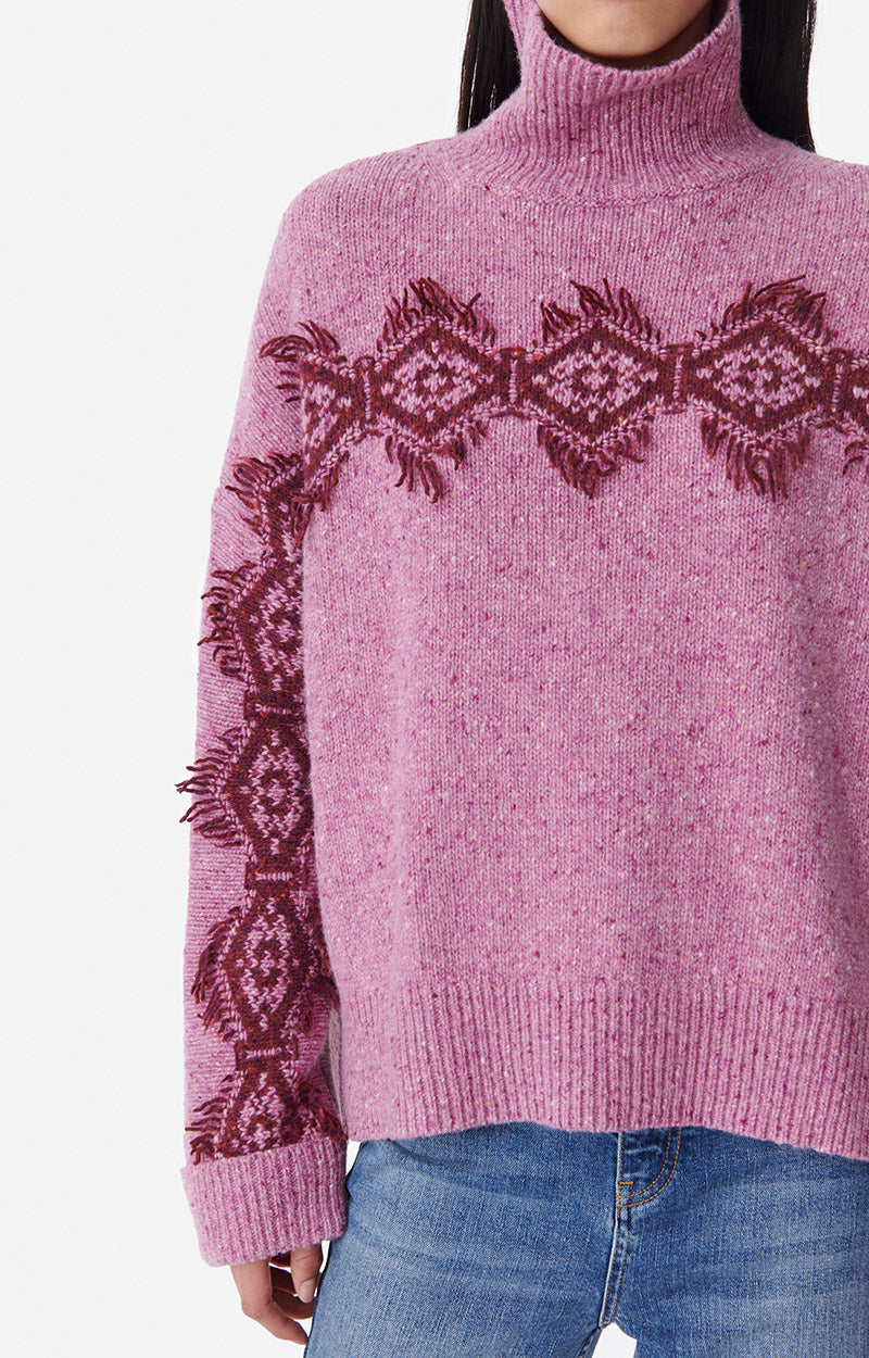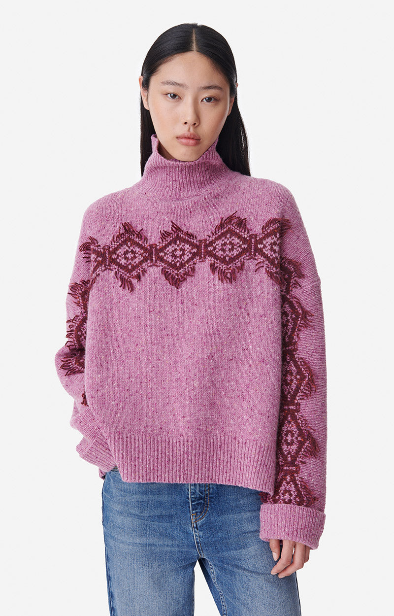 Oversize et douillet, le pull Benoite est déjà l'un des favoris de la collection automne-hiver 2023. Confectionné en laine mérinos et alpaga, ce tricot chiné est agrémenté d'un motif géométrique sur la poitrine et le long des manches. Portez-le avec un jean ou même une robe pour égayer votre tenue en un clin d'œil.