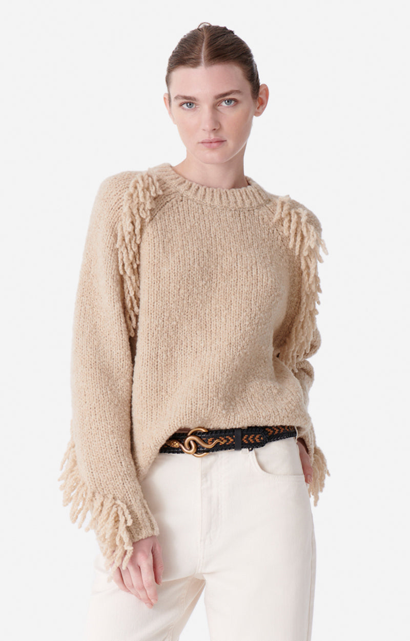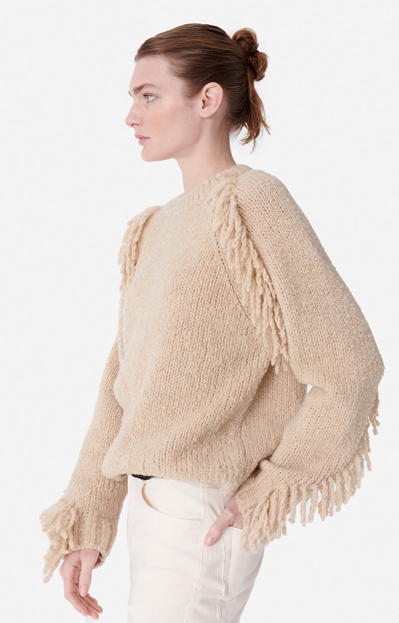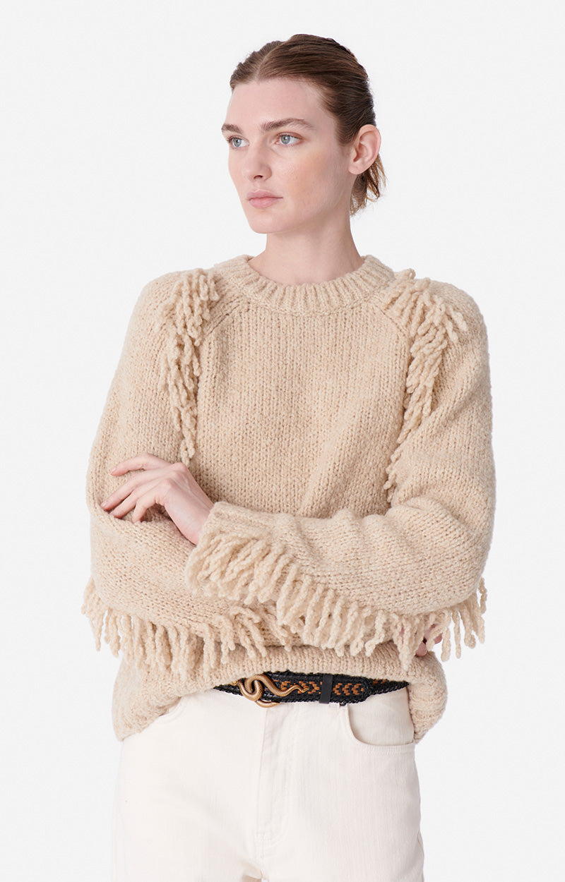 Le pull chic Bruyère est issu de la collection Automne/Hiver 2023. Tricoté en laine mérinos, ce modèle au charme discret se distingue par sa laine douce et ses manches frangées. Indispensable au quotidien, à porter avec un jean ou un pantalon en velours côtelé.