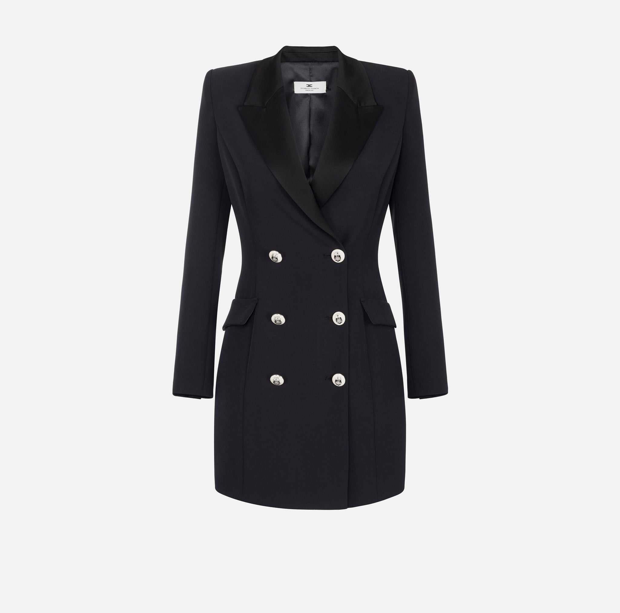 Robe-manteau à double boutonnage en crêpe stretch à manches longues avec revers piqué en satin.