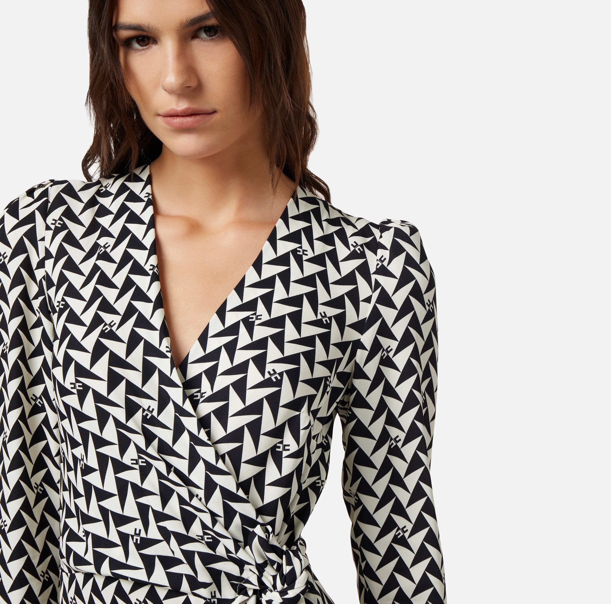 Robe midi asymétrique en georgette de viscose imprimée géométrique bicolore avec décolleté profond en V. La taille est soulignée par un drapé maintenu par un nœud qui part du côté et se termine par un volant au fond.
