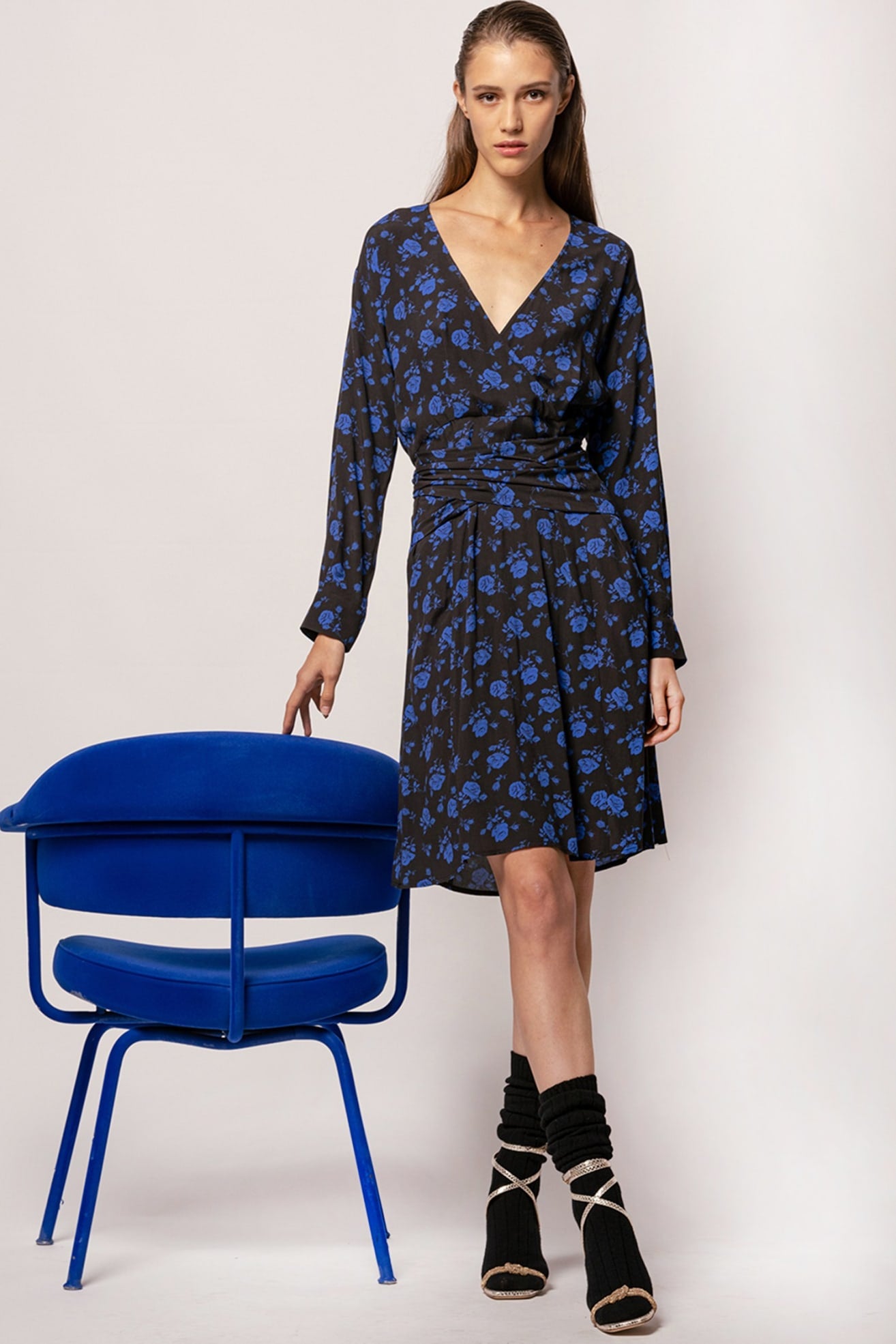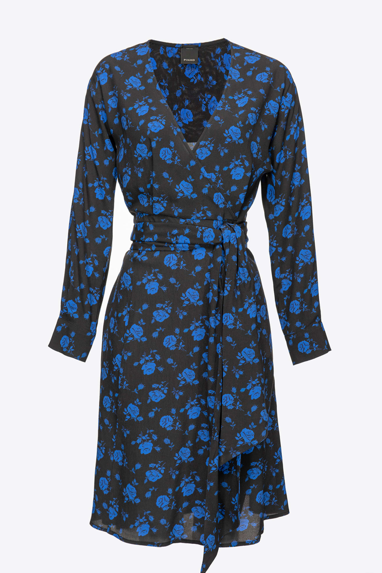 Robe courte enveloppante en viscose marocaine, avec un imprimé rose bicolore. Décolleté en V plongeant sur le devant, manches longues et basses avec poignet et lien à la taille en tissu assorti.